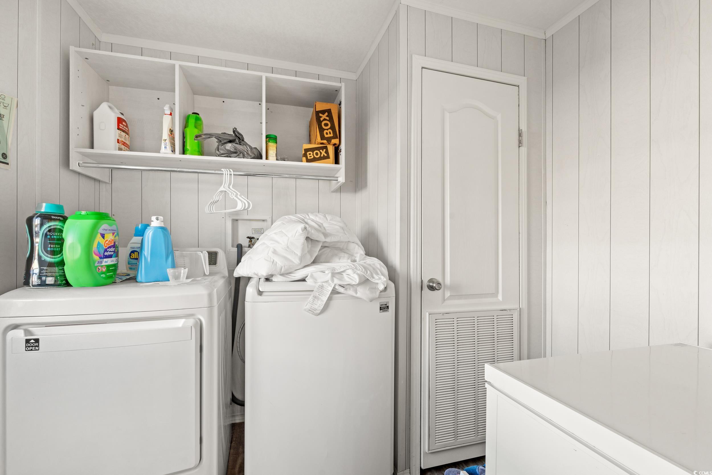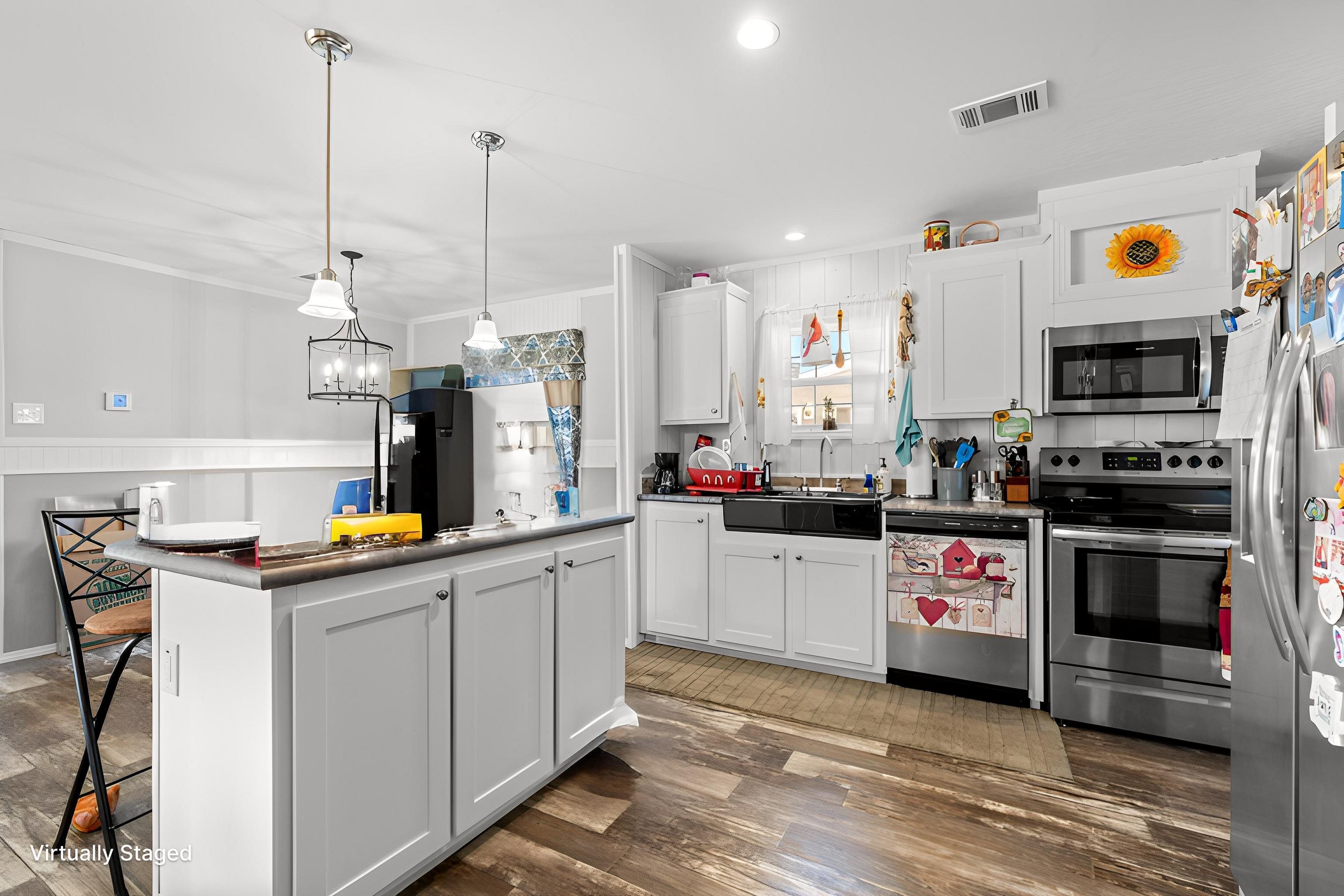 This beautifully appointed and carefully designed 3 bedroom, 2 bath manufactured home is just three years old and maximizes living space with an open and inviting layout. The expansive central living room flows effortlessly into a bright, contemporary kitchen that features a versatile island work station, serving bar, stainless steel appliances, and a walk-in chef’s pantry. Tucked away just off the kitchen is the separate laundry area with additional storage. With a split bedroom floor plan, the master bedroom serves as a private retreat, complete with a walk-in closet, en-suite bath featuring dual sinks, a spacious walk-in shower, and a soaking tub. The two additional bedrooms are generously sized and share a well-appointed second bathroom. Crown molding, decorative chair rail, and drywall enhancements are present throughout the home. Exterior features include an extra wide driveway to accommodate more vehicles, a handicap access ramp, a fully enclosed yard with vinyl fencing and a back deck with a cozy sitting area. Conveniently located just minutes away from Joe’s Diner - a local favorite, Market Common shopping and entertainment, Coastal Grand Mall, Myrtle Beach Airport, and of course the beach!!