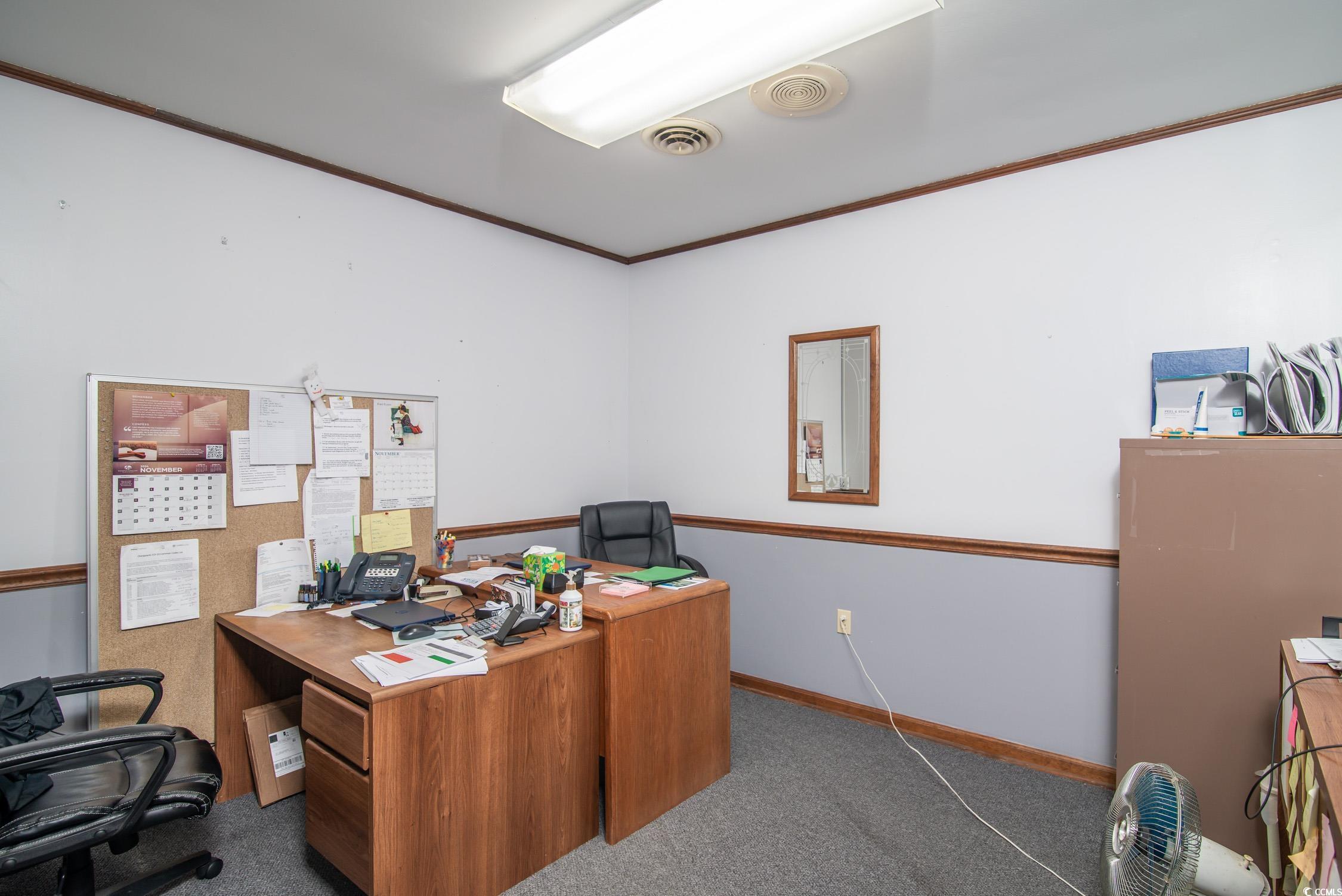 Great Investment Opportunity in the Heart of Georgetown, SC This commercial property has been used as a chiropractic clinic since its construction in 1980 and is currently being leased by a chiropractor. It could be repurposed for any type of doctor's office. The property boasts approximately 100 feet of road frontage on Highmarket Street in Georgetown, SC. The county records show the total area downstairs as 3,510 square feet, while the upstairs has been floored for storage and could be finished to suit the buyer's needs. The building features a large waiting room with cedar beams, indoor cedar walls and large windows for extra light, reception area, breakroom, office, and fourteen rooms currently used for therapy and patient consultations. It is equipped with three HVAC units and a 40-gallon water heater. The roof was replaced in 2023, and several windows, siding, and paint updates were made in 2018.