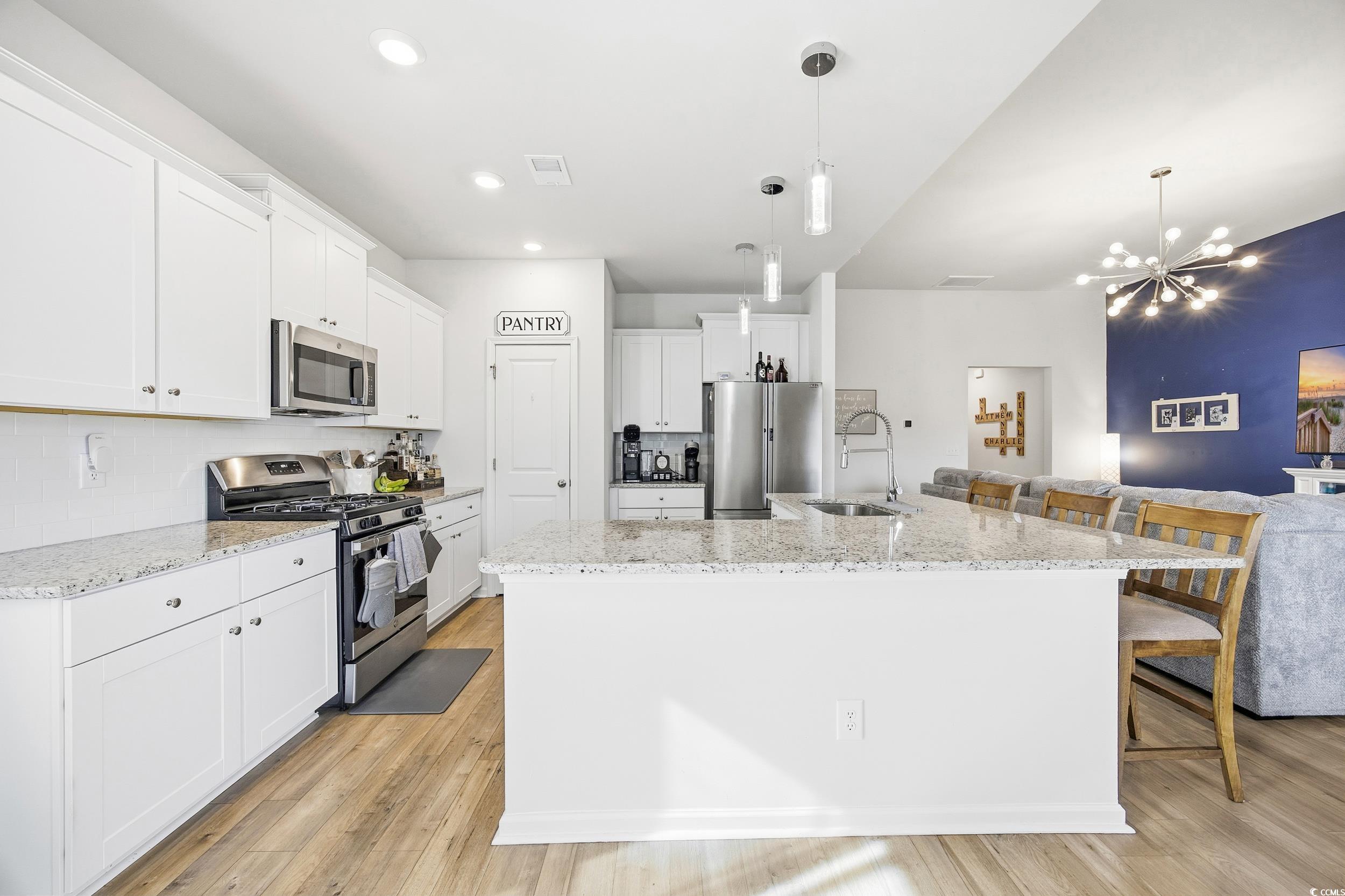 Finally! It's the one you have been searching for! This beautifully maintained 3-bedroom, 2-bath home offers the perfect blend of comfort, functionality, and coastal convenience, located just 10 minutes from the beach at Highway 90 & 22 with easy access to the entire market area, including shopping, dining, golf, and major roadways. Thoughtfully designed with a desirable split-bedroom floor plan, the layout of this home provides privacy and flexibility for both everyday living and hosting guests. The main living areas feature durable and stylish vinyl plank flooring, creating a warm and inviting atmosphere while being easy to maintain. The spacious kitchen is a true highlight, equipped with a gas range, stainless steel appliances, a large breakfast bar ideal for casual meals or entertaining, subway tile backsplash, a pantry, and an abundance of cabinet and counter space to meet all your storage and cooking needs. The kitchen opens seamlessly to the living and dining areas, making it perfect for gatherings of any size. The primary suite serves as a private retreat, complete with a well-appointed en suite bath featuring double sinks and a generous walk-in closet. Two additional bedrooms are comfortably sized and located on the opposite side of the home, sharing a full bath. An added flex room provides exceptional versatility and can easily function as a home office, formal dining room, playroom, or additional bedroom to suit your lifestyle. Outdoor living truly shines with a gorgeous paver patio overlooking an in-ground saltwater pool, creating an ideal setting for relaxation, entertaining, or enjoying warm coastal evenings. The fully fenced backyard offers privacy and space for pets or outdoor activities. Additional features include a tankless hot water heater for energy efficiency, full home alarm system, a dedicated laundry room, and a spacious 2-car garage. This home delivers the coastal lifestyle you’ve been looking for with modern features, thoughtful design, and an unbeatable location. Located in the natural gas community of Queens Park just minutes from all Myrtle Beach has to offer! Call today to schedule a showing! All measurements are approximate. Buyer and buyers agent responsible for verification of all information.