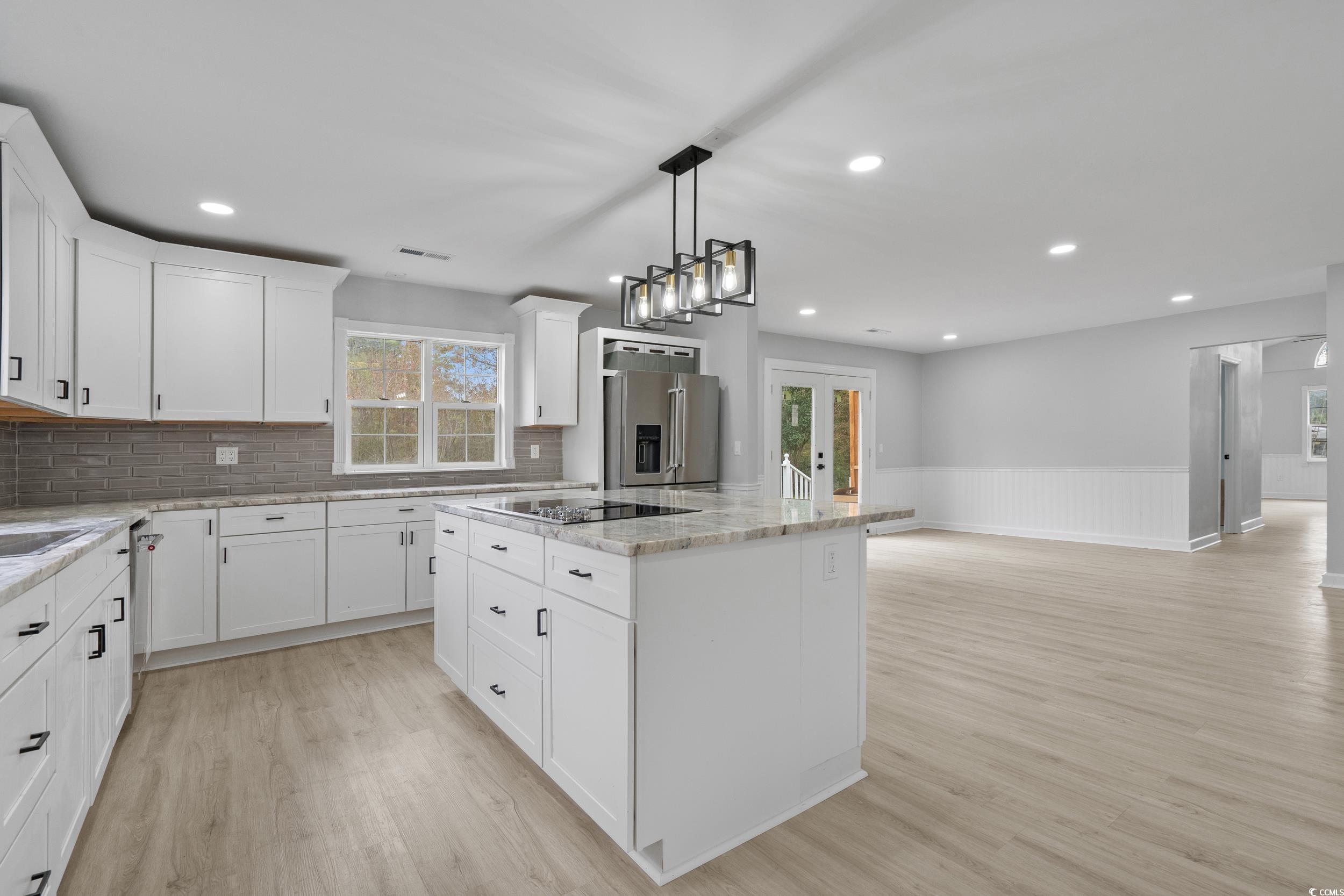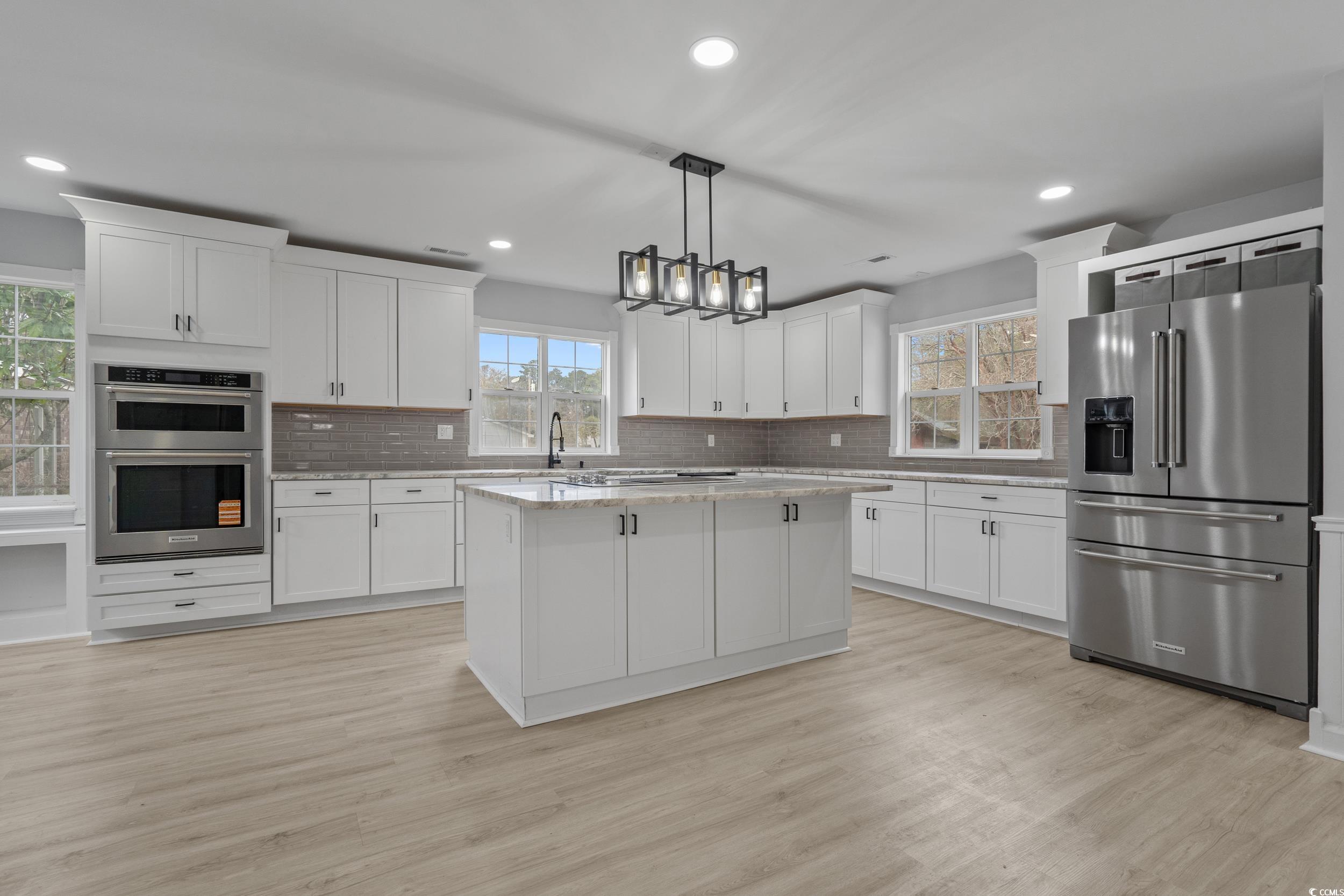 OWNER FINANCING AVAILABLE Experience refined Southern living in this fully reimagined 4 bedroom, 2.5 bathroom residence, perfectly appointed on a .51-acre estate-style lot in the heart of Conway. Every inch of this home has been thoughtfully redesigned with luxury, comfort, and craftsmanship in mind. A long list of upgrades ensures a truly turnkey experience: metal roof, new HVAC, new water heater, upgraded plumbing and electrical, new designer lighting, premium ceiling fans, new interior doors, fresh modern paint, and luxury vinyl plank flooring throughout, creating a seamless, sophisticated flow. At the center of the home lies a custom, magazine-worthy chef’s kitchen—a true culinary masterpiece. Enjoy soft-close cabinetry and drawers with extensive storage, high-grade granite, a massive entertainment island with breakfast bar seating, walk-in pantry, and an elite KitchenAid stainless steel appliance suite, including a glass cooktop range, built-in convection oven, multifunction microwave, dishwasher, and a 4-door French refrigerator. This space is built to impress. The home’s open-concept living and dining areas are elevated by vaulted ceilings, abundant natural light, and a layout ideal for both intimate gatherings and grand entertaining. The luxury continues in the primary suite, featuring a striking brick accent wall, expansive walk-in closet, and a spa-inspired en suite complete with a dual-sink vanity and a stunning floor-to-ceiling tiled walk-in shower. Outdoor living is equally breathtaking. A sweeping L-shaped front porch and a spacious rear deck—accessible through new French doors—offer relaxing spaces to unwind. The private, beautifully landscaped backyard is graced with mature crepe myrtles, rose bushes, hydrangeas, and azaleas for year-round elegance with minimal upkeep. Located just 5 minutes from historic Downtown Conway, where charming oak-lined streets, boutique shops, riverfront dining, and the picturesque Riverwalk create the perfect blend of culture and small-town luxury. And with Myrtle Beach and the Grand Strand’s world-class beaches less than 30 minutes away, this property combines tranquility with convenience. A rare opportunity to own a truly luxury-level remodel in one of Conway’s most desirable locations.