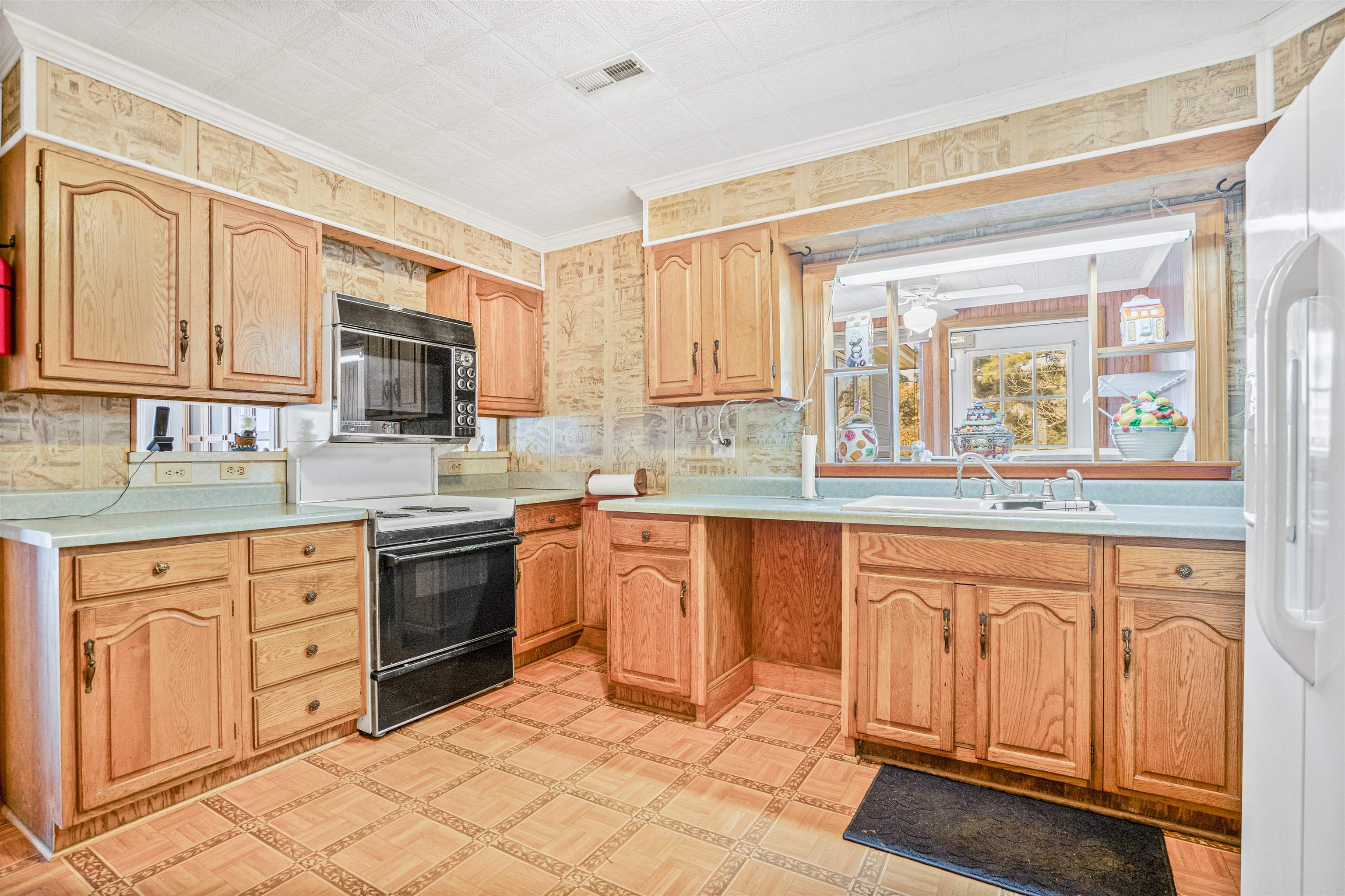 Charming ranch-style home situated on a spacious double lot featuring durable Hardie plank siding and a screened porch perfect for enjoying peaceful mornings filled with birdsongs and nature. Inside, the inviting living room showcases a triple bay window that fills the space with natural light, beautiful oak hardwood floors, an arched doorway, double built-in shelving and a stunning see-through propane gas log fireplace with a white mantle. This unique fireplace seamlessly connects to the formal dining room, which features its own handcrafted wood mantle, a breakfast bar overlooking the kitchen, and a charming corner built-in cabinet. The kitchen offers warm oak cabinetry, built-in shelving, a large pantry and a double porcelain sink, providing both function and character. The spacious primary suite includes a skylight for added natural light, luxury vinyl plank flooring, a walk-in closet, and a private bath complete with a relaxing garden tub. Both guest bedrooms feature hardwood floors and ceiling fans for comfort. Additional highlights include vinyl windows, a tiled floor breezeway leading into a garage for additional storage, attic storage, carport, an outdoor barbecue pit, a private chicken coop, and mature fruit-bearing trees including pear trees and grapevines.