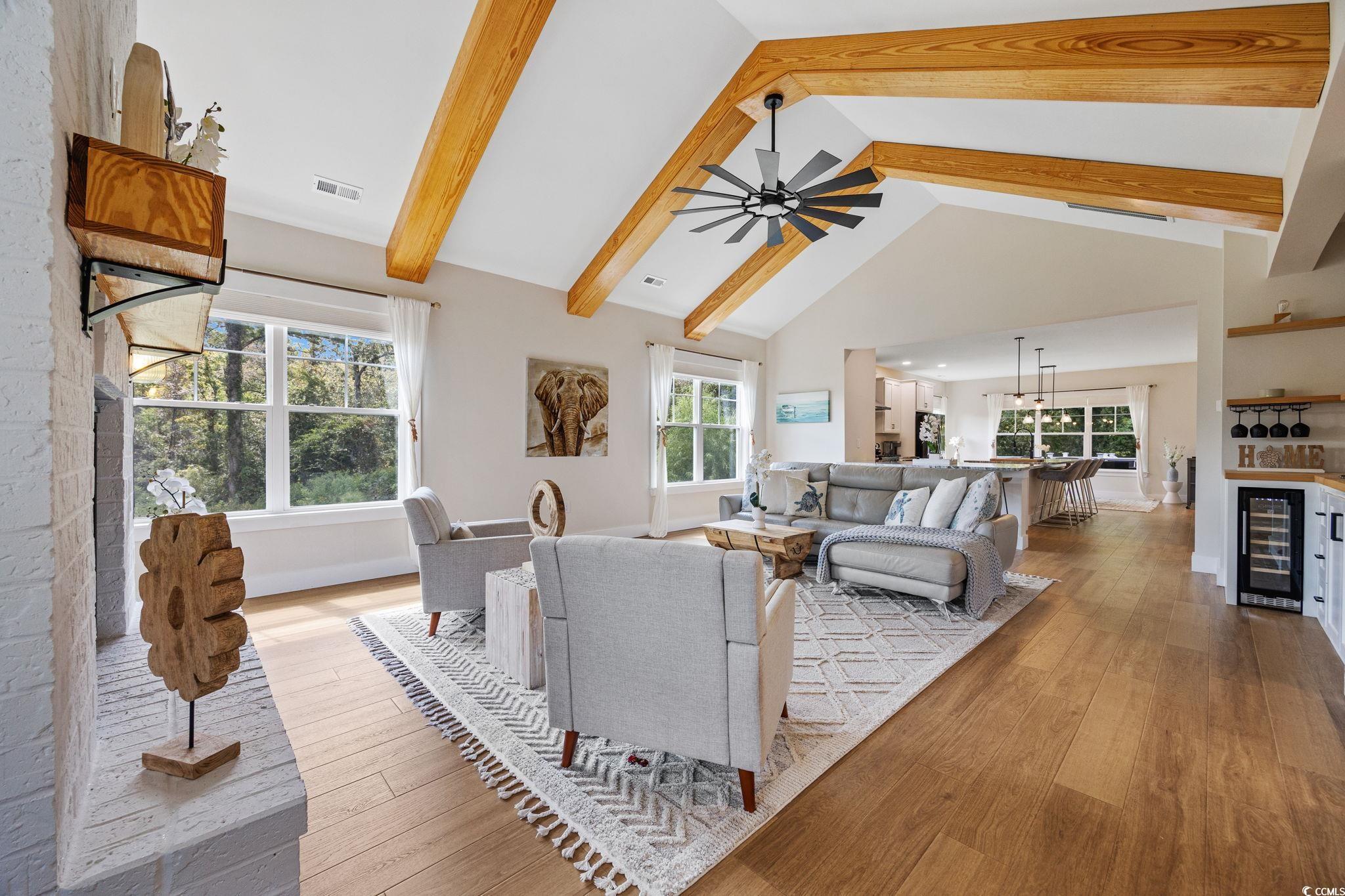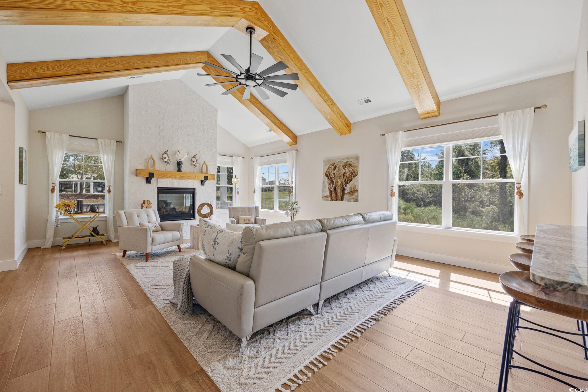 Experience the pinnacle of sophisticated, upgraded living at 278 Rivers Edge Dr, a spectacular 4-bedroom, 2.5-bathroom residence custom-built by Chase Signature Homes within the coveted gated community of Rivers Edge Plantation. This home is a sanctuary of high-end finishes and superior design, where a breathtaking living room features a built-in gas fireplace, a vaulted ceiling, and accent beams. The gourmet kitchen is an entertainer's dream, boasting two expansive islands, granite countertops, stainless steel appliances, a pantry, and abundant custom cabinetry, complemented by a chic custom built-in bar with a wine fridge. Retreat to the luxurious master suite, which offers a tray ceiling, an enormous walk-in closet, and a spa-like bath with dual sinks and a walk-in tiled shower. Three of the four spacious bedrooms are large enough to accommodate a king bed with extra space for a sitting area or office, while the fourth fits a queen. Engineered for comfort and durability, the home is part of a natural gas community, features a pristine epoxy coating on the garage floor and driveway, and includes a split unit A/C for heating/cooling the garage. Outdoor living is exceptional, with a total of three covered porch areas and two open-air porch areas. The rear outdoor space has been significantly enhanced with an extended back patio featuring stamped concrete, a covered shaded area, a dedicated sunbathing area, and easy access to the yard via installed stairs, all while maximizing views of the adjacent stream and river. The yard is well-maintained with a Rainbird sprinkler system, gutters with two underground drains, and a huge raised rear concrete retaining wall. For ultimate peace of mind, the front yard features a fully fenced front patio for pet or child safety. Best of all, this home offers an unparalleled, direct next-door location to the community boat ramp and dock, and is not in a flood zone, has never flooded, and does not require flood insurance, allowing you to enjoy resort-style community amenities like the clubhouse, pool, and playground worry-free. Bonus features: Option to convey furnishings and decor with the house for a negotiable price 2-Person Sauna Built-in wine bar Beautiful stream with abundant nature sightings (owls, otters, herons & more!) Short drive to the beach, restaurants, and shopping, and only 5 minutes to miles of hike & bike trails