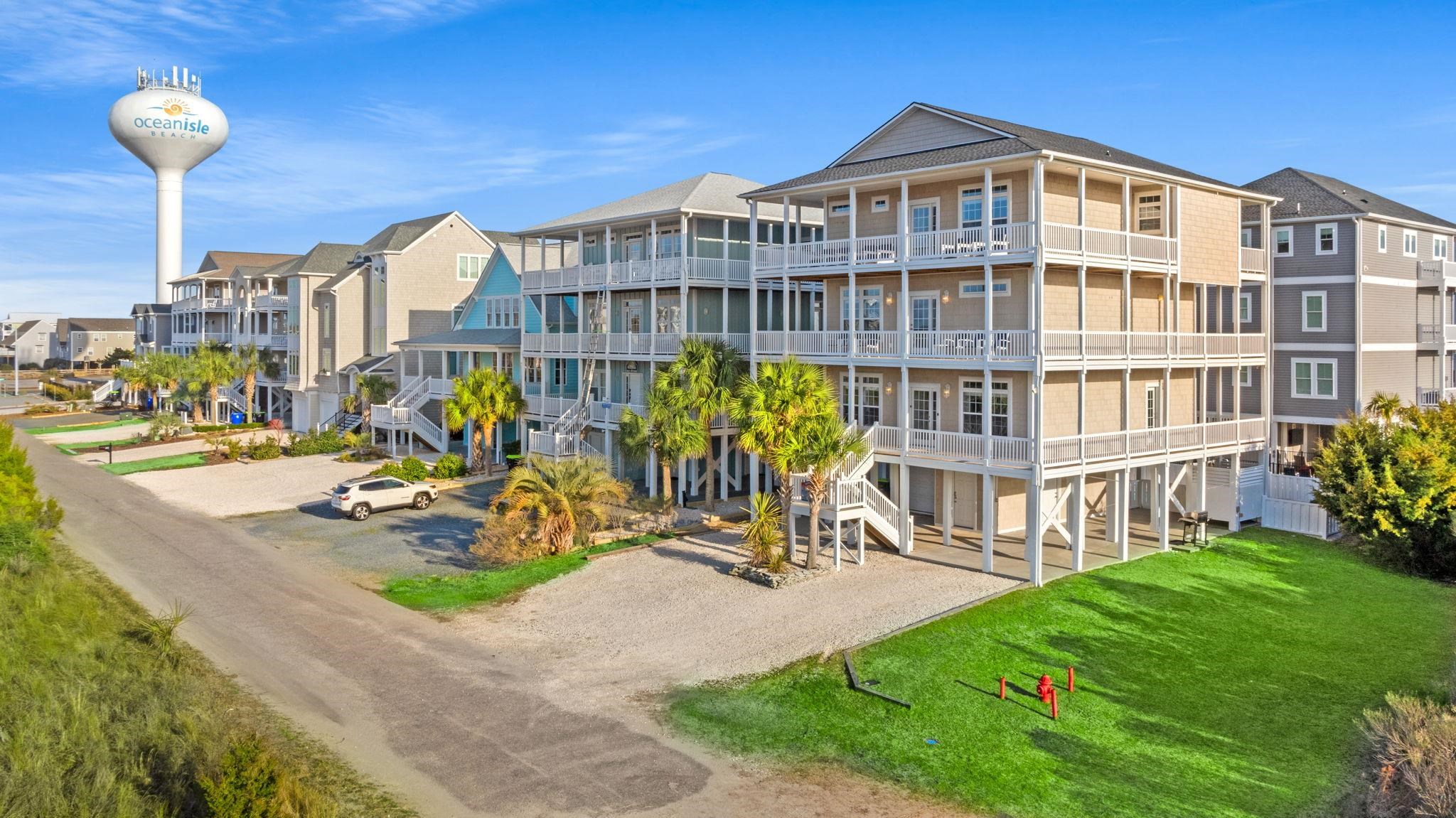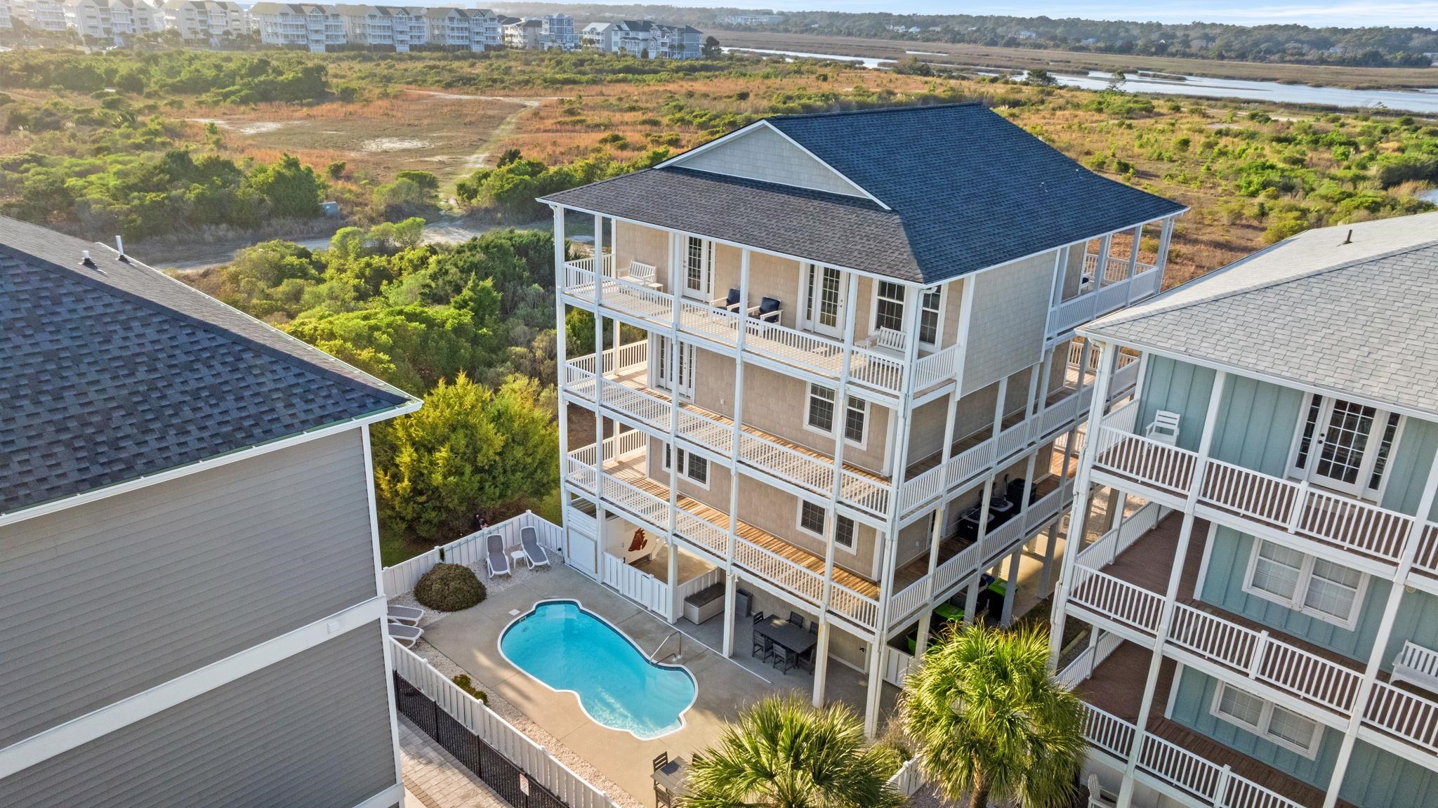 Welcome to your dream property on Ocean Isle Beach's sought-after west end - an impressive residence or high-income producing rental home. This three-level retreat, served by an elevator, features wrap-around, covered decks on every floor - providing breathtaking, panoramic views of the Atlantic Ocean, pristine marshlands, and the Intracoastal Waterway. Inside, the home is thoughtfully designed for both comfort and style. Enjoy 8 spacious bedrooms and 6.5 bathrooms, accommodating up to 20 guests with ease. Elegant touches abound, including wainscoting and crown molding throughout, LVP flooring, and a fresh coastal interior paint. The main living area showcases striking vaulted ceilings, custom built-in cabinetry, and an inviting open-concept design. The eat-in kitchen is a chef's delight with quartz countertops, a designer tile backsplash, stainless steel appliances, and plenty of space for meal preparation and gatherings. A dedicated hangout lounge on the second level creates the perfect area for games or movie nights. Step outside to your private backyard oasis: a heated pool with a large concrete deck and privacy fencing, plus a dual heated outdoor shower for rinsing off after a day at the beach. Low-maintenance landscaping means more time to savor the views. As part of the Islander Resort community, you have the option to join the Isles Club, granting access to a large oceanfront pool for an additional membership fee. The home is sold fully furnished, offers ample parking, and is located at the end of a quiet street surrounded by nature. Close to a beach access and all that the island has to offer, this is an unparalleled opportunity to own a premier Ocean Isle Beach property. This West End Ocean Isle Beach is a truly rare find. You also have the option to purchase annual membership to the Isles Beach Club with access to an oceanfront pool.