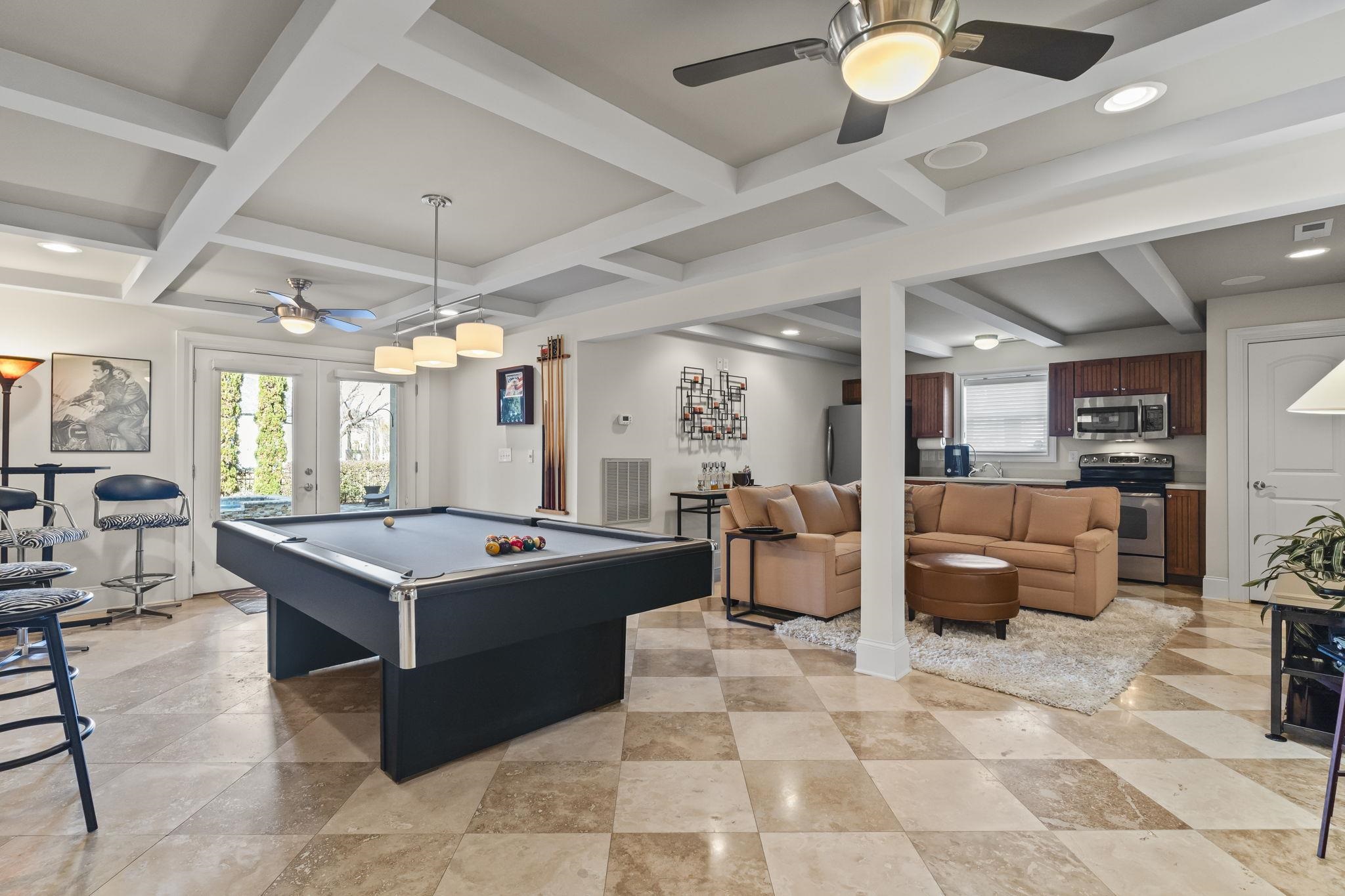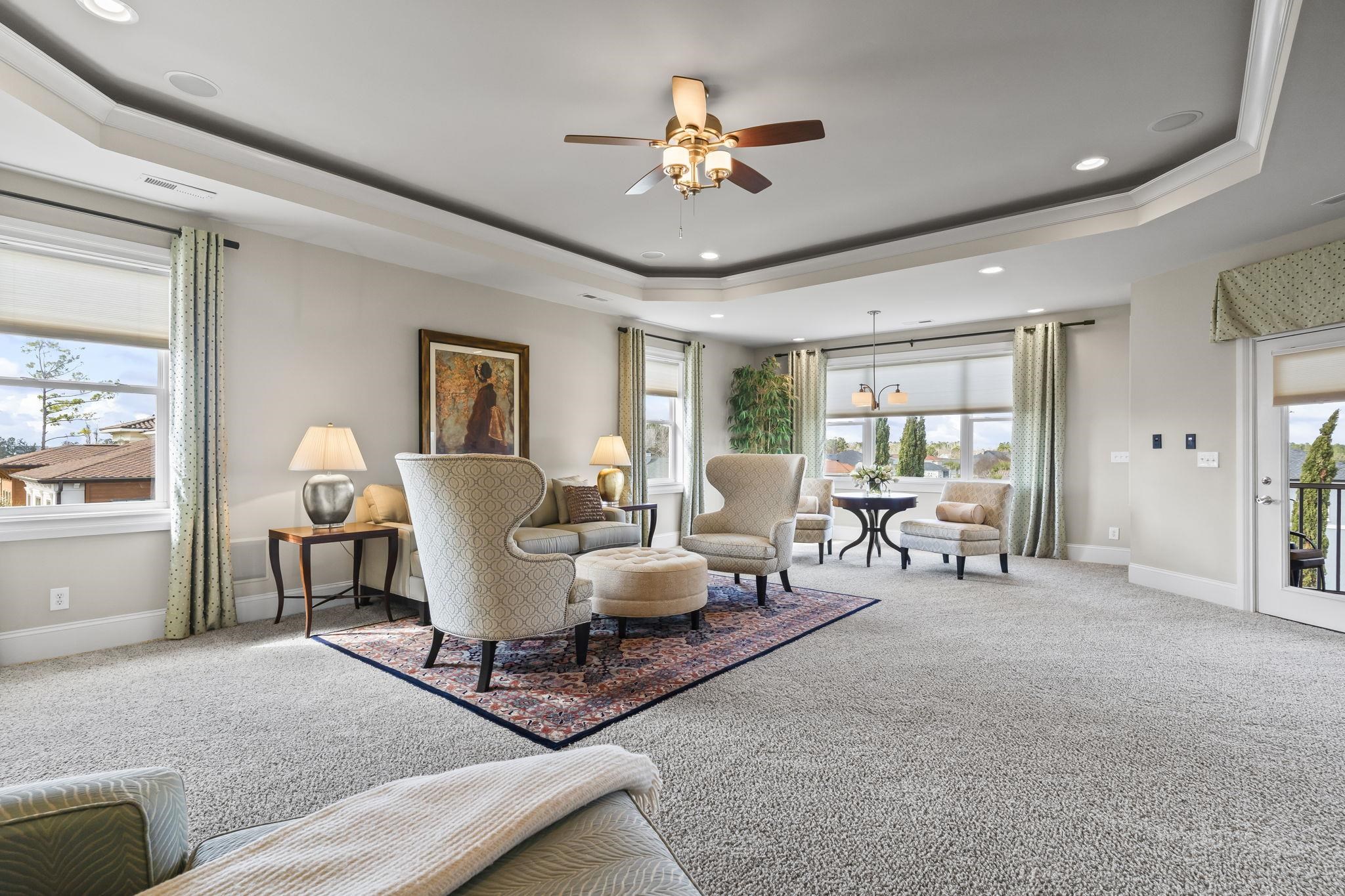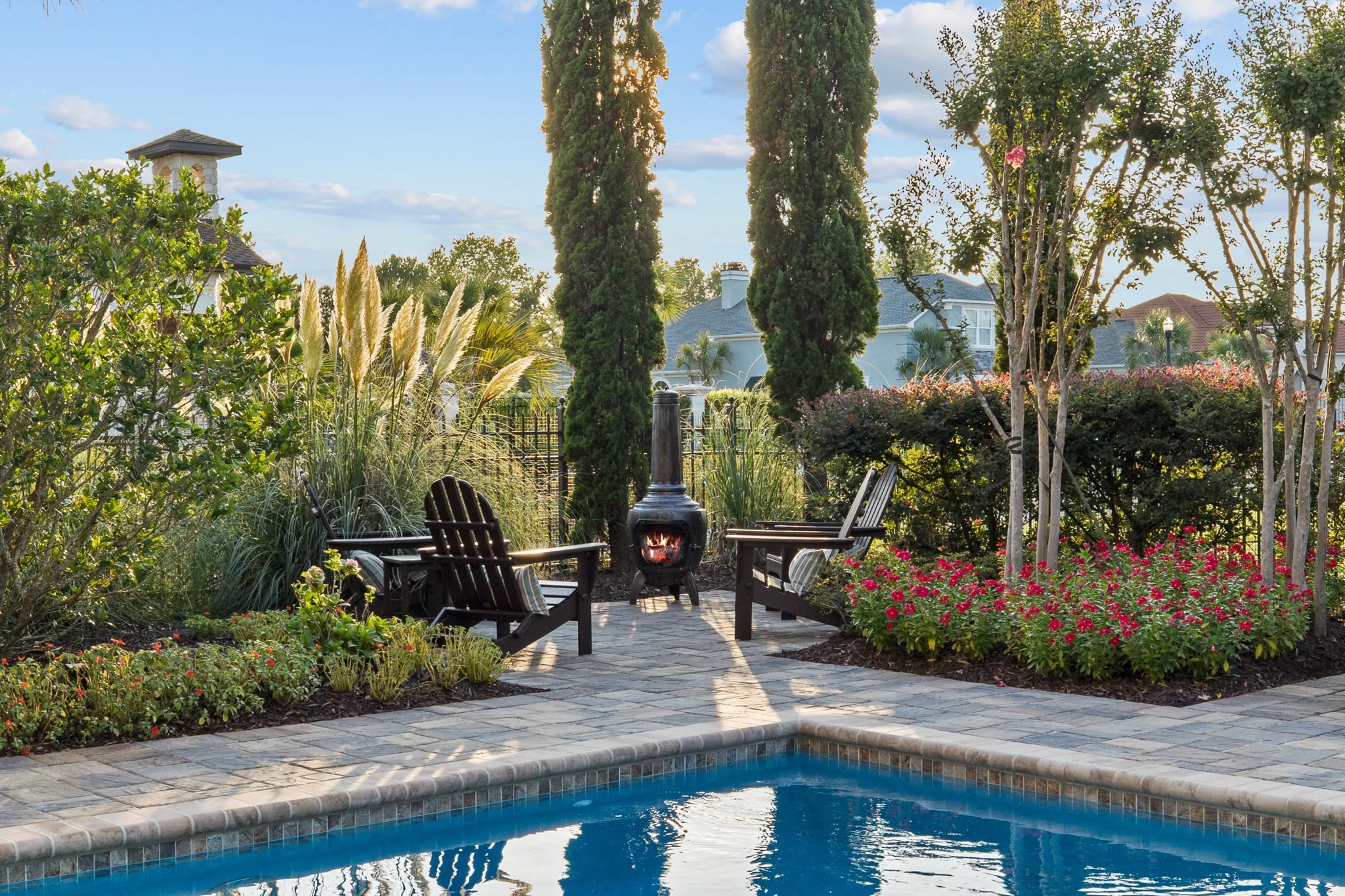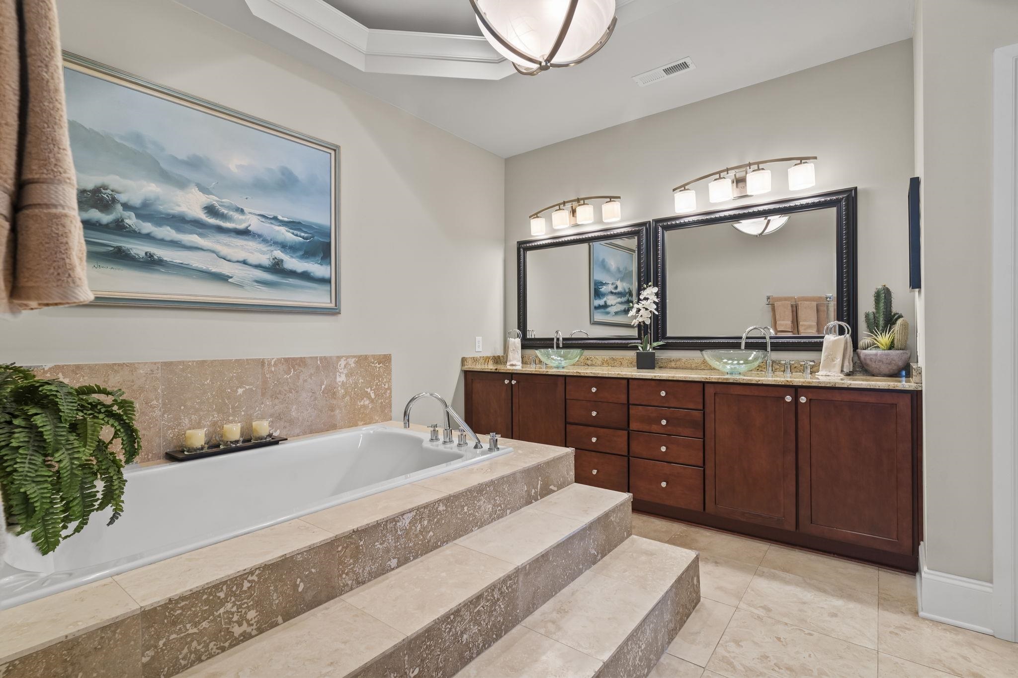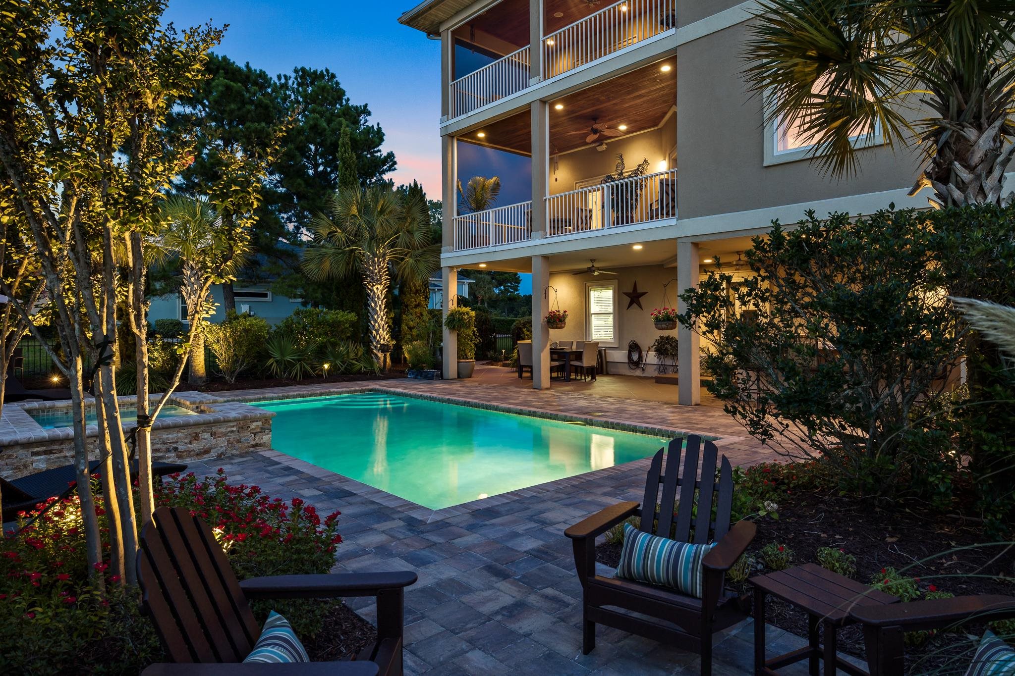 Luxury Lake Lot living in the prestigious Bluffs on the Waterway. This elegant 3-level stucco home with tile roof is situated on a prime corner lake lot and offers 5 bedrooms, 4 full baths, 2 kitchens, and a private in-law living suite. A 3-level elevator services all floors. The main level features a gourmet kitchen with gas cooktop, wall oven, island with wine storage and beverage cooler, bar seating, and a screened porch, plus formal dining and living areas with detailed ceilings and a propane fireplace. The lower level includes a full kitchen, living area, bedroom, bath, and private exterior access—ideal for guests or multigenerational living. The entire top level is dedicated to an expansive primary suite with sitting area, double-sided fireplace, spa-style bath, walk-in closet, wet bar, and screened porch overlooking the lake. Outdoor living includes a saltwater heated pool and spa, summer kitchen, lanai, firepit area, and aluminum fenced yard. Circular driveway, oversized garages, multiple HVAC systems, whole-home audio, and security system. Adjacent lot available separately.