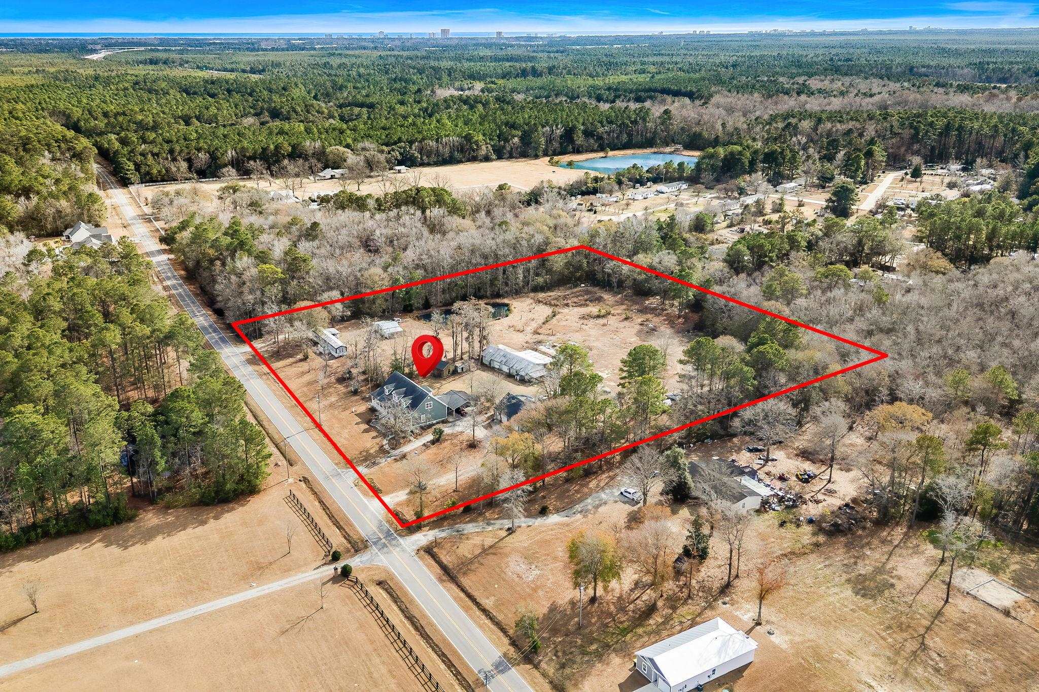 JUST SHY OF 7 ACRES, PERFECT LOCATION BY 22, ENDLESS POSSIBILITIES! Welcome to this peaceful retreat set on almost 7 acres, offering space, privacy, and timeless character. Step inside to a warm and inviting living room featuring rich color floors, recessed lighting, and a striking fireplace that anchors the space—ideal for cozy evenings or relaxed gatherings. Just off the living area, the formal dining room is designed for hosting and everyday elegance. This space showcases crown molding, wainscoting, and a beautiful chandelier, creating a refined setting for dinners and special occasions. Large openings connect the dining room seamlessly to the rest of the home, allowing natural light to carry throughout while preserving its formal feel. The kitchen is both stylish and functional, featuring an oversized island, abundant cabinetry, and stainless steel appliances—ideal for everyday living and entertaining. Pendant lighting, recessed lighting, and crown molding add a polished touch, while the open layout keeps the space bright and inviting. Just off the kitchen, the breakfast nook is surrounded by windows, creating a sun-filled spot perfect for casual meals or morning coffee with a view of the backyard. The spacious primary bedroom offers a true retreat with tray ceilings, hardwood flooring, and plenty of room for a sitting area or home office. The ensuite bathroom features a large tiled walk-in shower, and warm wood cabinetry. A dedicated vanity area adds extra functionality, while natural light brightens the space. Completing the suite is an oversized walk-in closet with custom shelving, providing exceptional organization and storage. There are other bedrooms and flex spaces offering versatility for all your needs. The spacious laundry room offers excellent functionality with abundant cabinetry, a utility sink, and plenty of counter space for folding and organization. The Carolina room offers a bright and versatile space with wood-paneled walls, hardwood flooring, and large windows that fill the room with natural light. Equipped with ceiling fans and ample square footage, this inviting area is perfect for relaxing, entertaining, or creating a flexible bonus space to fit your needs. Step outside to an expansive outdoor living area designed for both everyday enjoyment and entertaining. The oversized screened porch offers ample space for lounging, dining, or hosting gatherings, complete with ceiling fans and views of the surrounding yard. Just beyond, a large concrete patio creates even more room for outdoor furniture, grilling, or future enhancements. The backyard provides a peaceful setting with plenty of space to relax, garden, or customize to fit your lifestyle. The attached carport offers convenient covered parking with easy access to the home, providing protection from the elements and everyday functionality. With generous space for vehicles, bikes, or outdoor gear, it also doubles as a flexible area for unloading, storage, or additional outdoor use. Set on a sprawling, private parcel, this property offers a rare blend of space, flexibility, and country charm. The grounds include multiple outbuildings ideal for storage, workshops, equipment, or hobby use, along with a detached 3 car garage providing ample room for vehicles and toys with a one bedroom apartment on top. An above-ground pool adds a fun outdoor element, while the expansive yard offers endless potential for gardening, recreation, or future improvements. With mature trees, wide open areas, and a peaceful setting, this property delivers privacy and versatility just a short drive from everyday conveniences. Perfectly positioned, this home is just a short drive from shopping, dining, and everyday conveniences, while still offering a peaceful, private setting. Enjoy easy access to the beach as well—close enough for spontaneous coastal days without sacrificing space and tranquility. Buyer is responsible for verification.