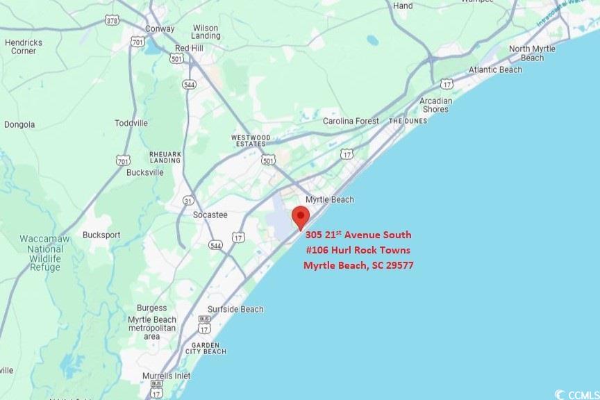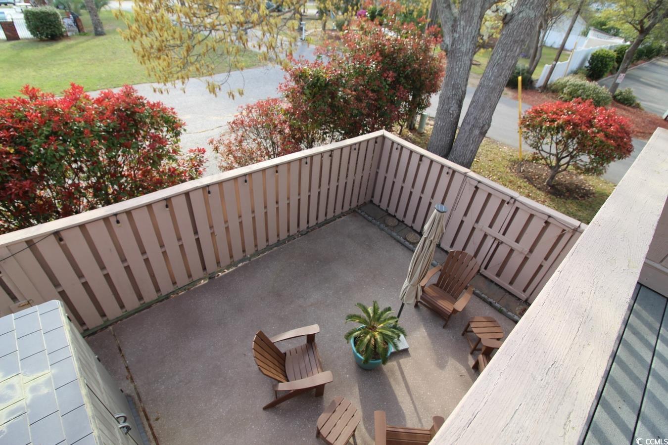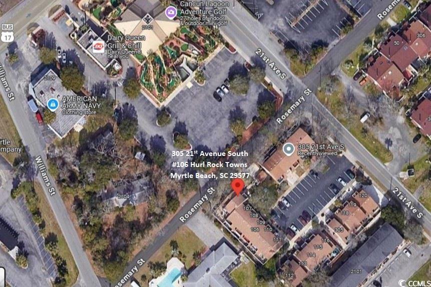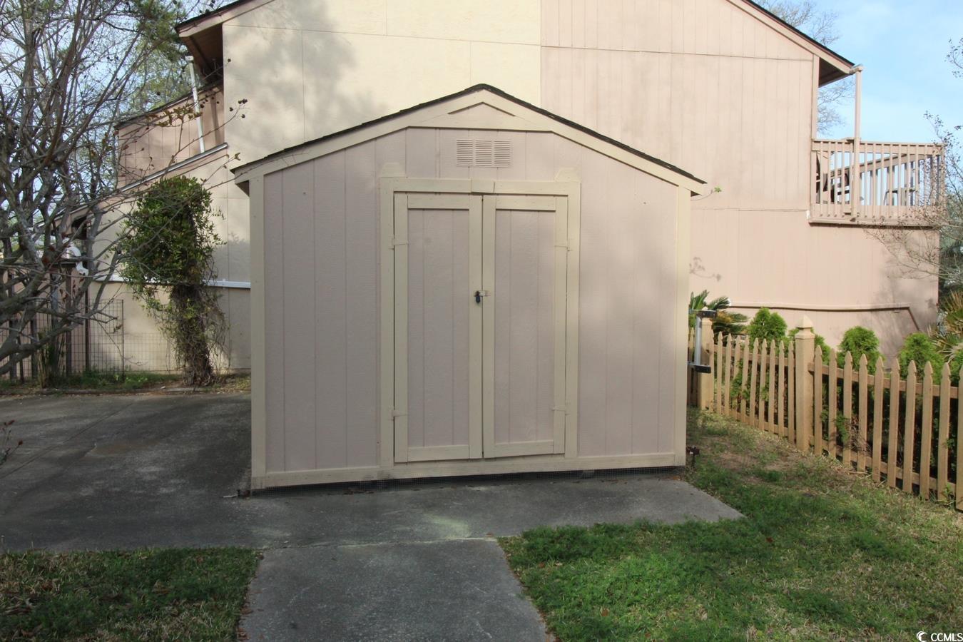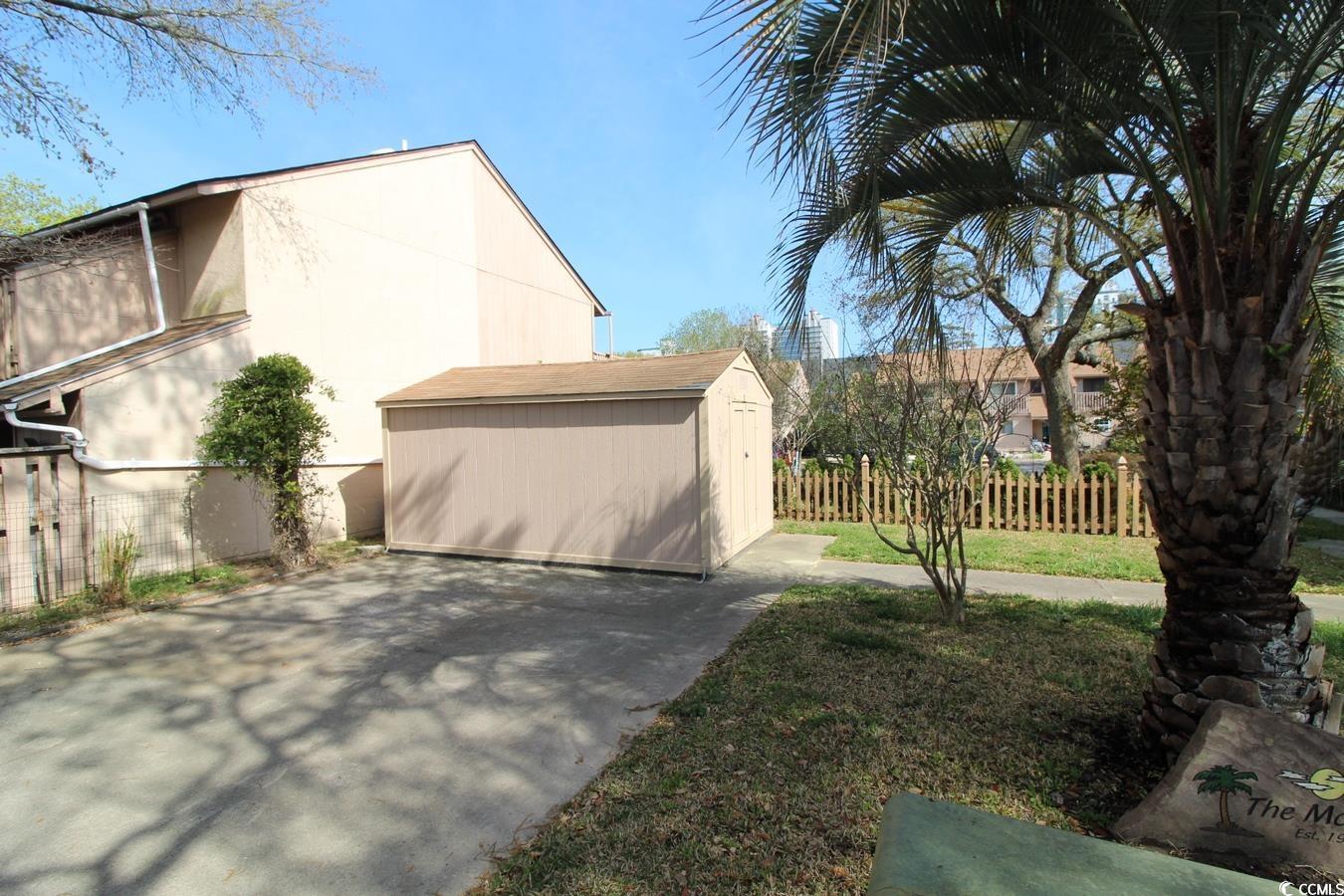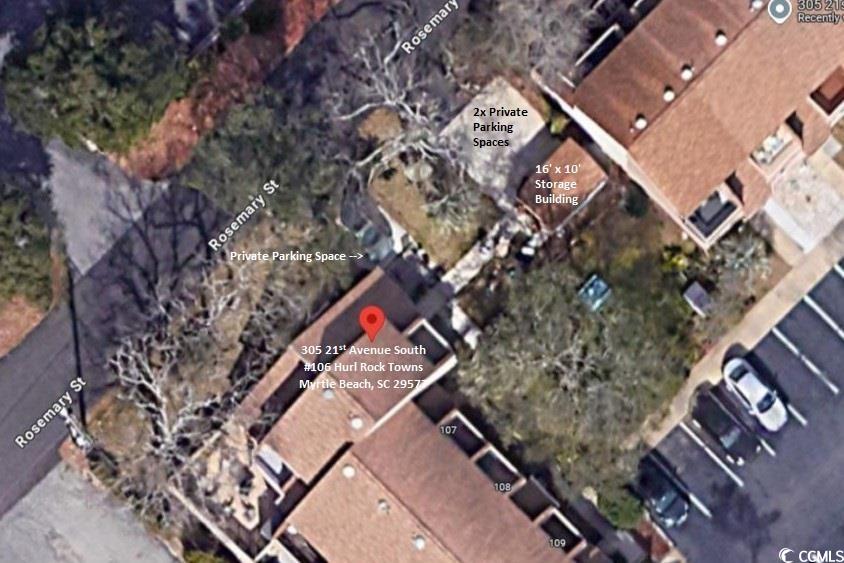This 3BR/2BA townhome is just a short ¼ mile stroll to the shores of the Atlantic Ocean. This two-story townhouse at Hurl Rock has a downstairs master bedroom suite and a private 24’ x 20’ fenced in back patio. Each of the upstairs bedrooms has a balcony from which you can enjoy the relaxing ocean breezes and southern sunshine. #106 is an end unit which has access to three private parking spaces off of Rosemary Street. There is also a 10’ x 16’ storage building which will convey. Tile flooring throughout the downstairs and waterproof laminate floors upstairs. Custom-built walk-in shower recently installed in the downstairs master bathroom. New full-size washer & dryer purchased in Sept 2024. Roof replaced in 2020. Irrigation system has access to well water. There are no HOA dues and short term rentals are allowed. Hurl Rock is conveniently located east of Hwy 17 Business, close to the beach, Market Commons, the Airport & downtown Myrtle Beach.