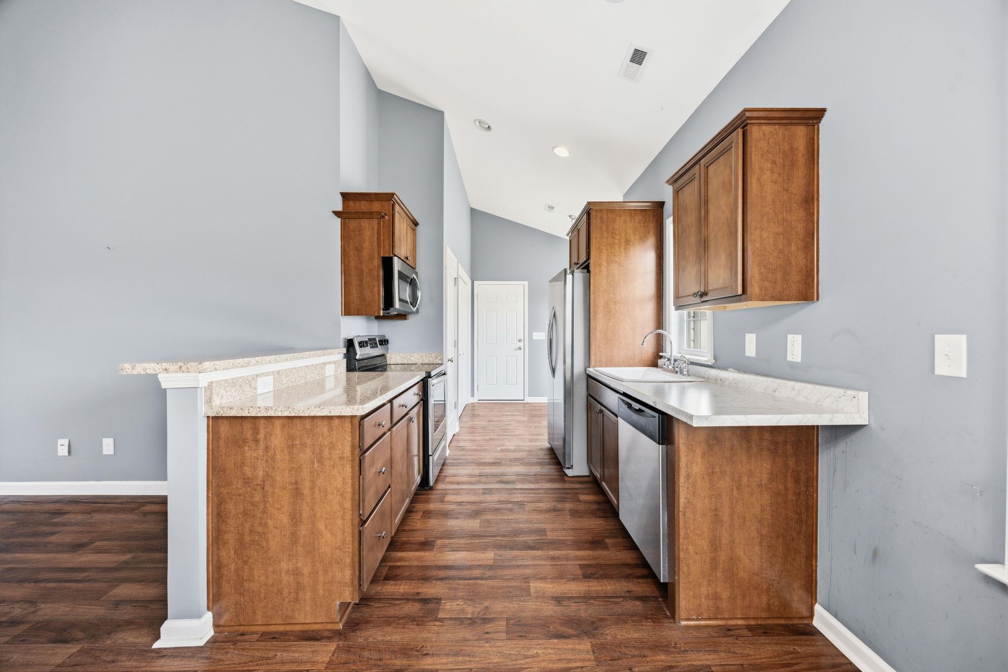 Charming single level home located in the popular community of Myrtle Lakes North. Conveniently located just off of highway 9 with quick access into Little River or North Myrtle Beach. Spacious and open floor plan featuring three bedrooms and two baths. Enjoy a combined living, dining and kitchen space with a vaulted ceiling. The primary suite is privately located on one side of the home with the additional second and third bedrooms on the other side of the living space. A hall bathroom services the additional bedrooms and can act as a guest powder room. A dedicated dining space opens into the living room with a galley style kitchen. Just off of the dining room a sliding door opens to a 10 X 14 screened porch overlooking a lovely pond. A smaller breakfast spot and laundry space are just adjacent to the garage. Both bathrooms offer a tub shower combo and vanity. Ceiling fans can be found throughout along with upgraded lighting and plumbing fixtures. Plantation shutters and cottage style doors give you a wonderful coastal feel. The kitchen offers medium stained wood cabinetry, pantry stainless appliances and plenty of storage space. Wood look vinyl flooring is throughout for low maintenance. This home conveys with all appliances including washer and dryer. Outside, the quarter acre home site has a water view and is well landscaped. A single car garage and extended driveway offer ample parking space. Exterior vinyl siding provides for a easily maintained exterior. Myrtle Lakes North offers a quiet and peaceful community in a prime location. A community pool and neighborhood sidewalks make this a great place to enjoy the beach life! Don't miss this great home and schedule your showing today. All information is deemed reliable, buyer is responsible for all verification.