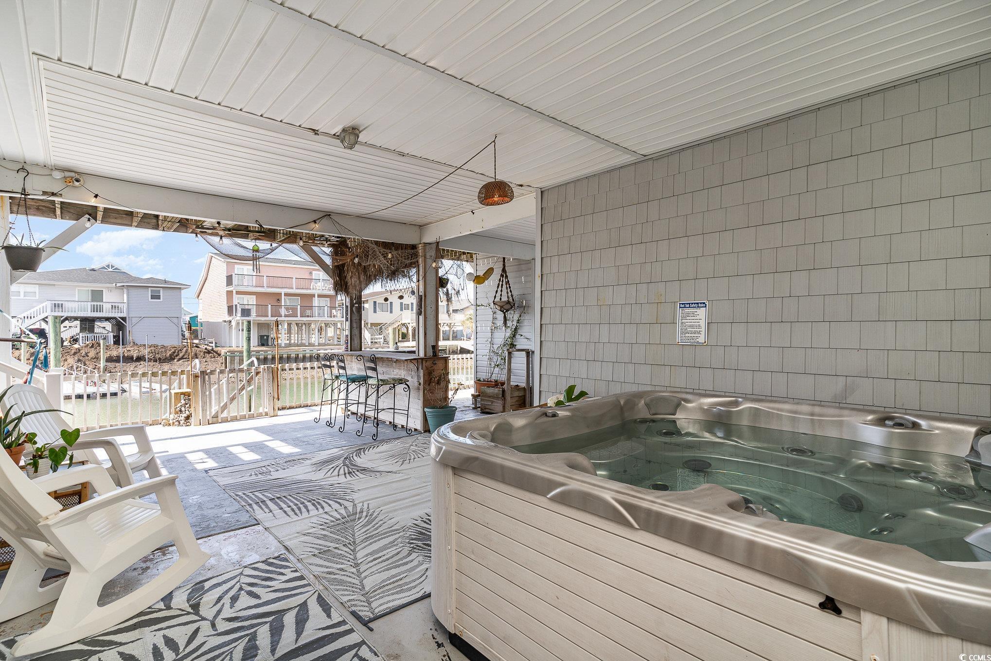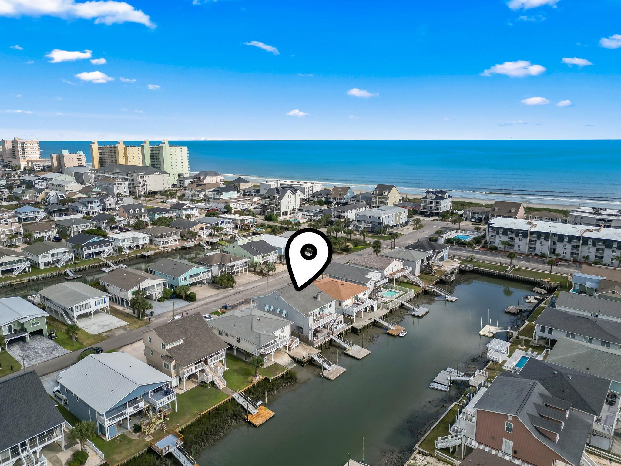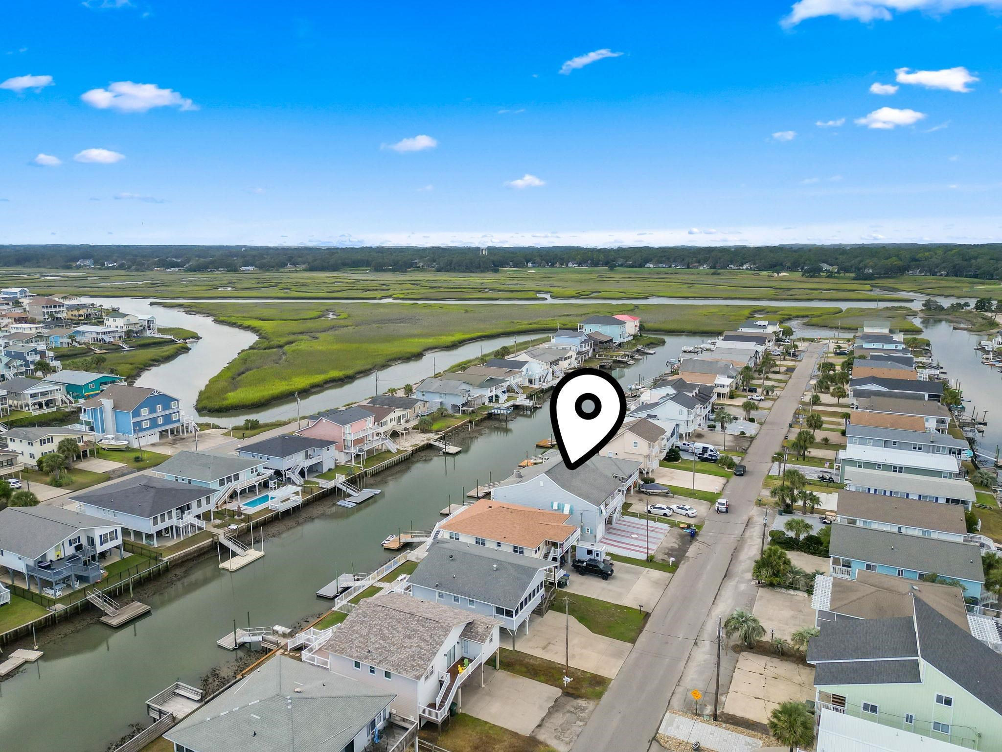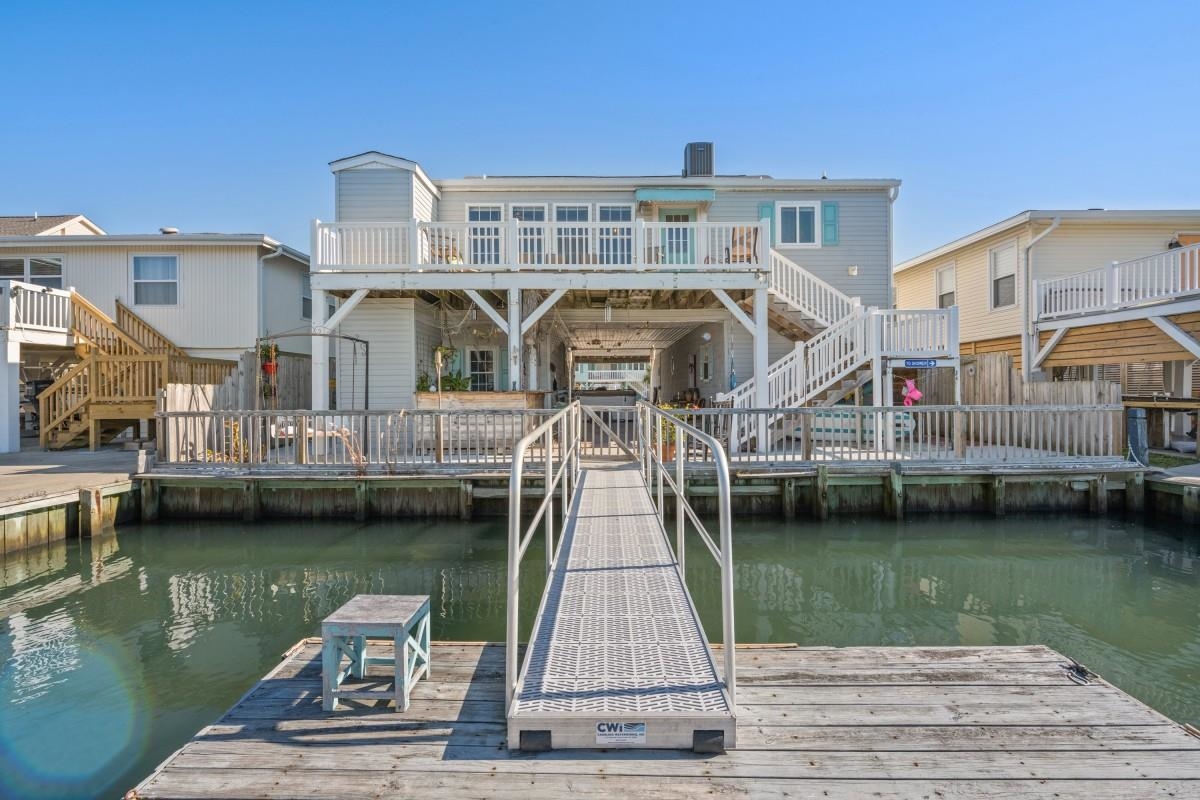 Waterfront beach house with direct ocean access! 1 block from the beach with private dock! Swim, fish, and boat to the marsh or ocean from your backyard. This huge raised 4-bedroom, 4-bath home offers ensuite bathrooms for EVERY bedroom and no shared bedroom walls — ideal for privacy, guests, or short-term rental. Enjoy sweeping water views from the upper deck, cast a line from your private oversized dock, or relax at the tiki bar beside an eight-person hot tub. Approx.. 200 steps to the beach! The bright, open floor plan features crown molding and multiple living areas including a sunroom. The spacious kitchen showcases a bar area with wine fridge, island, double oven, walk-in pantry, granite countertops, stainless steel dishwasher and microwave updated in 2025. The large primary suite includes a massive walk-in closet, double-vanity, and large tiled walk-in shower. A separate downstairs apartment provides flexible options — live in one level and rent the other, multigenerational living, or maximize STR income (property could sleep up to 18). Additional highlights: luxury hardwood flooring, electric fireplace, garage, workshop, expansive attic with vaulted ceilings (future conversion potential), 30-amp RV plug, hurricane shutters, and convenient access to 53rd Avenue fishing pier, boat ramp, and Heritage Shores Nature Preserve. Boat pictured does not convey. Seller is a licensed South Carolina Realtor.