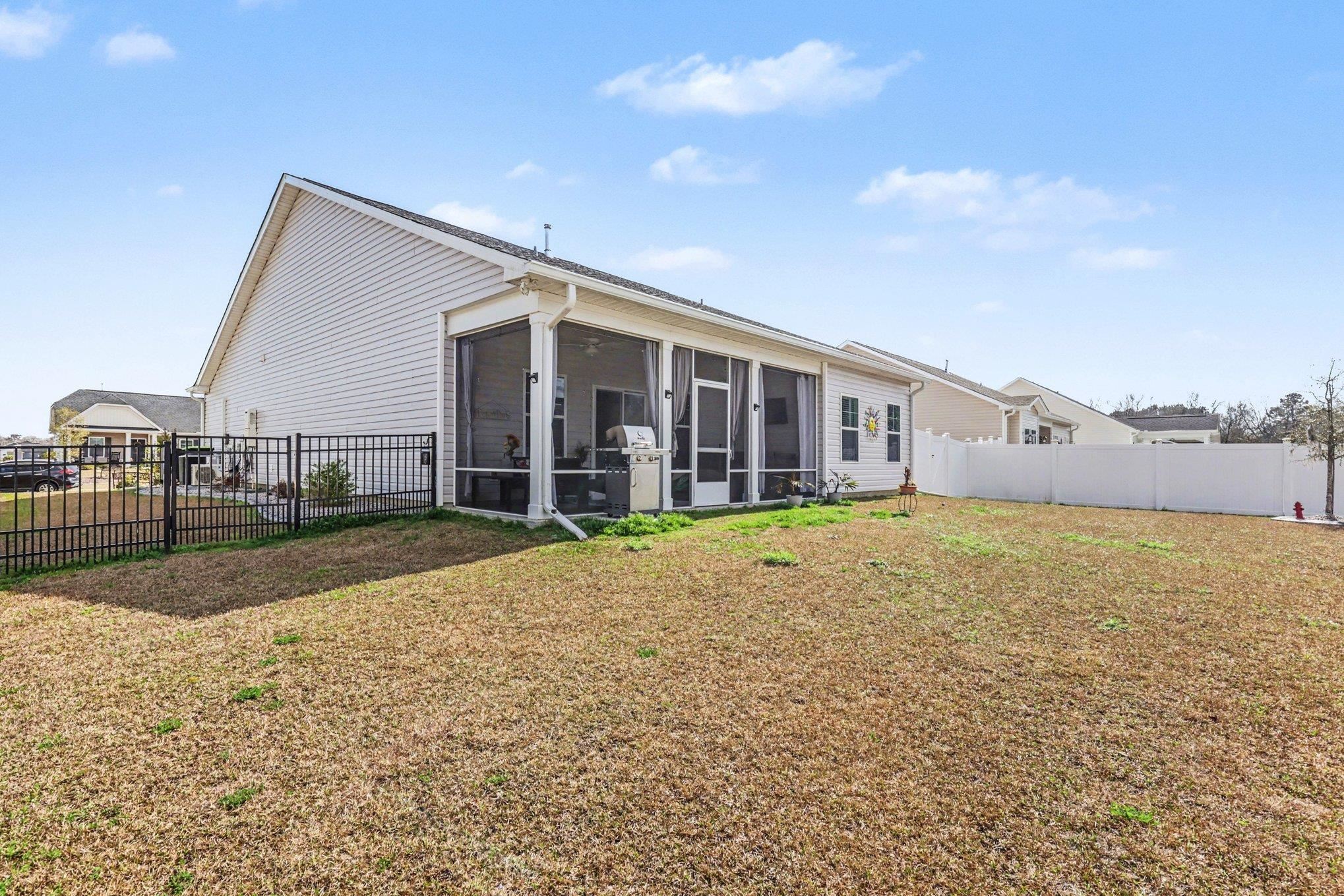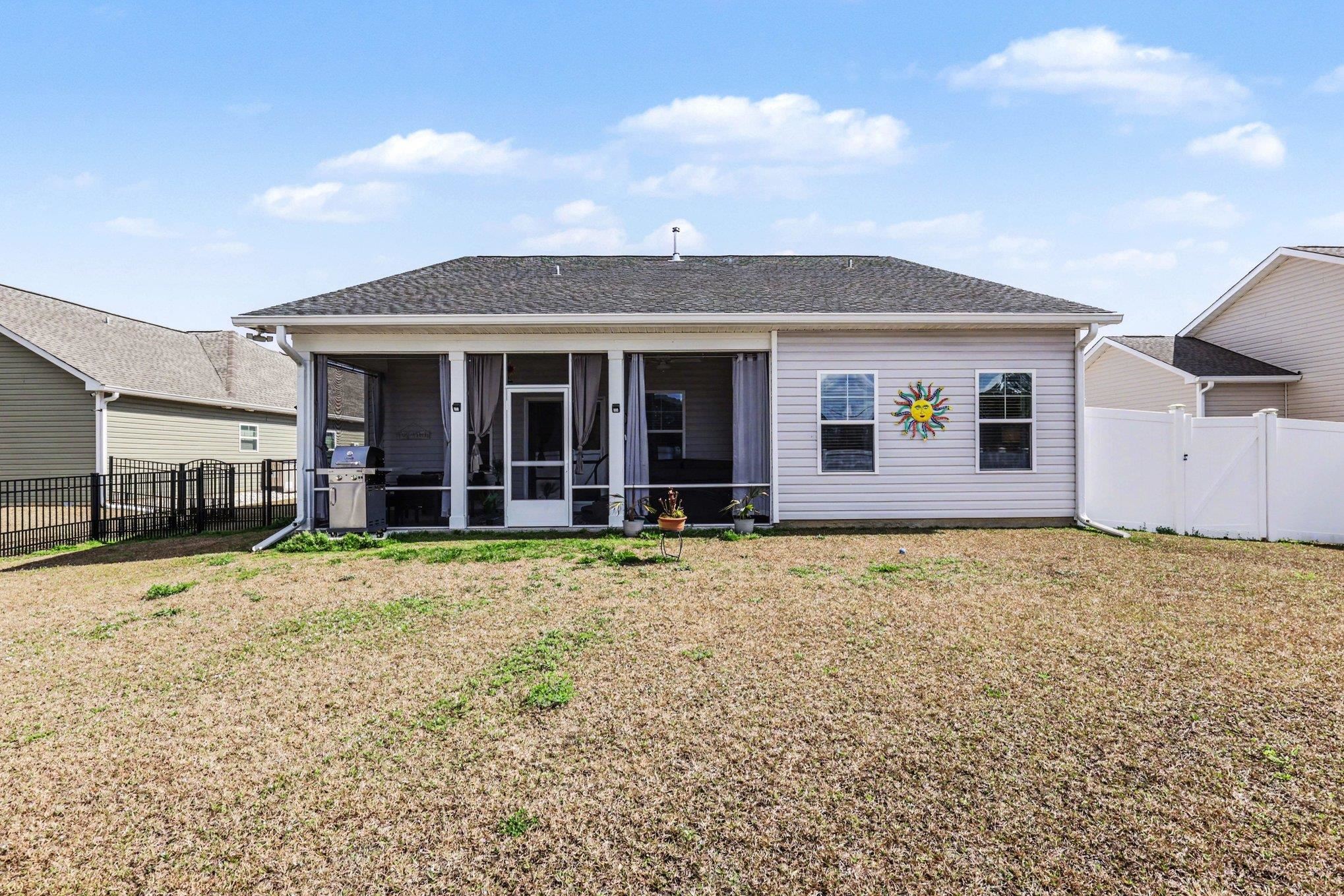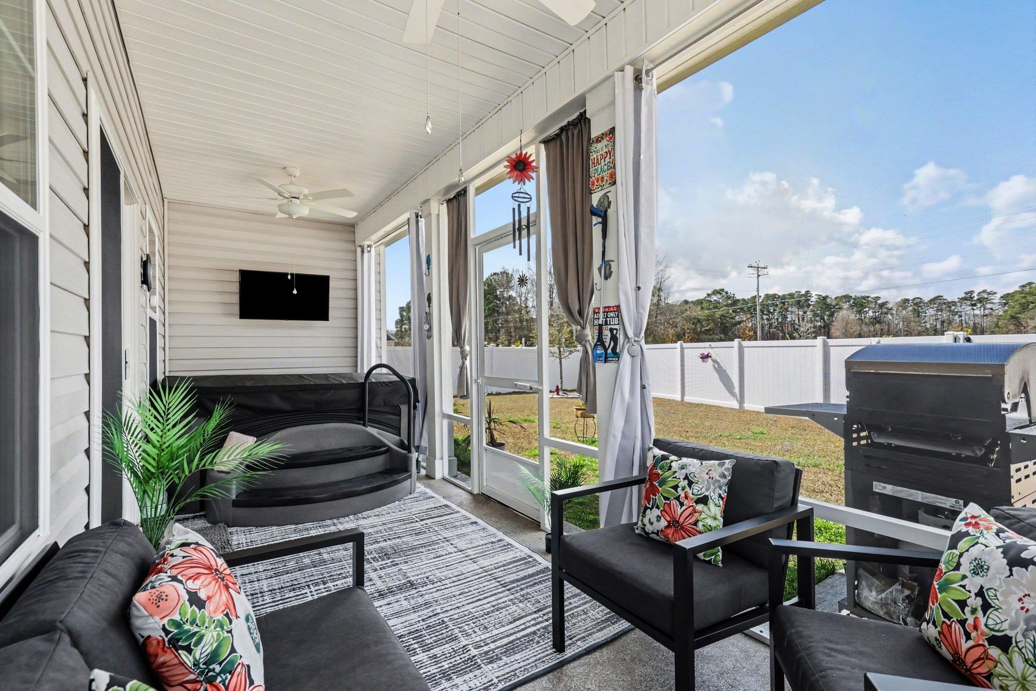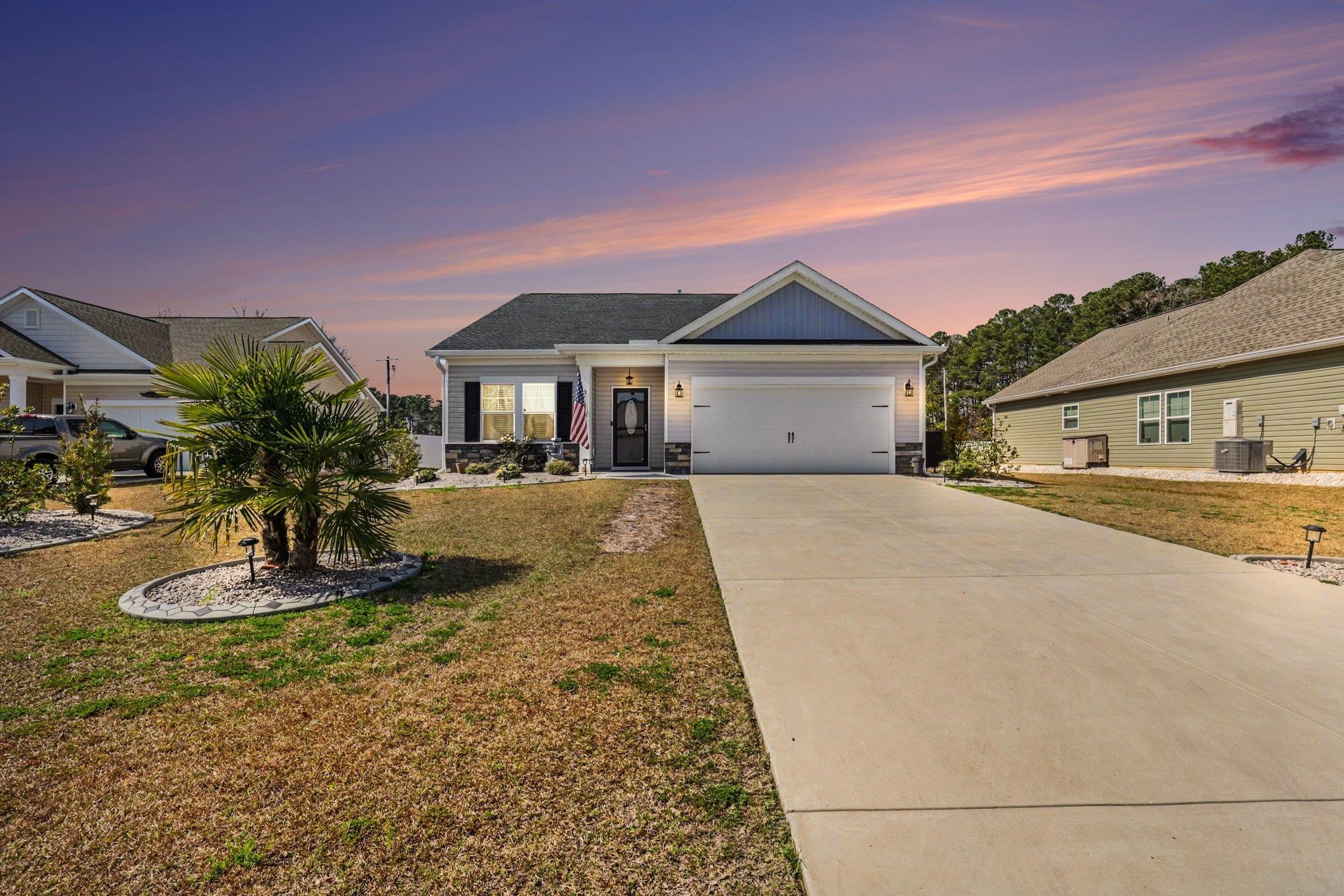 Welcome to this beautifully maintained home offering modern upgrades, open living space, and comfortable coastal living. This home features a bright and spacious open floor plan with luxury flooring throughout the and an exquiste feature wall, creating the perfect space for relaxing or entertaining. The kitchen is designed for both style and functionality with stainless steel appliances, ample cabinetry, a large peninsula with bar seating, pendant lighting, and updated track lighting. A spacious walk-in pantry provides excellent storage and convenience. The primary suite offers a peaceful retreat with a generous bedroom, large walk-in closet, and an ensuite bathroom featuring dual sink vanities and a beautifully tiled shower. Additional bedrooms provide flexible space for guests, a home office, or hobbies. Outdoor living is just as inviting with a screened-in back porch that provides the perfect place to enjoy the Carolina weather year-round. The garage features durable epoxy flooring for easy maintenance and a polished look. The garage has also been upgraded with its own air split system, making it ideal for a workshop, gym, or additional flex space. Additional upgrades include a brand new front door and smart switches throughout the home. With its thoughtful upgrades, open layout, and convenient location just minutes from North Myrtle Beach, golf courses, shopping, and dining.This move-in ready home is ready for you to enjoy. Buyer is respsonsible for verification.