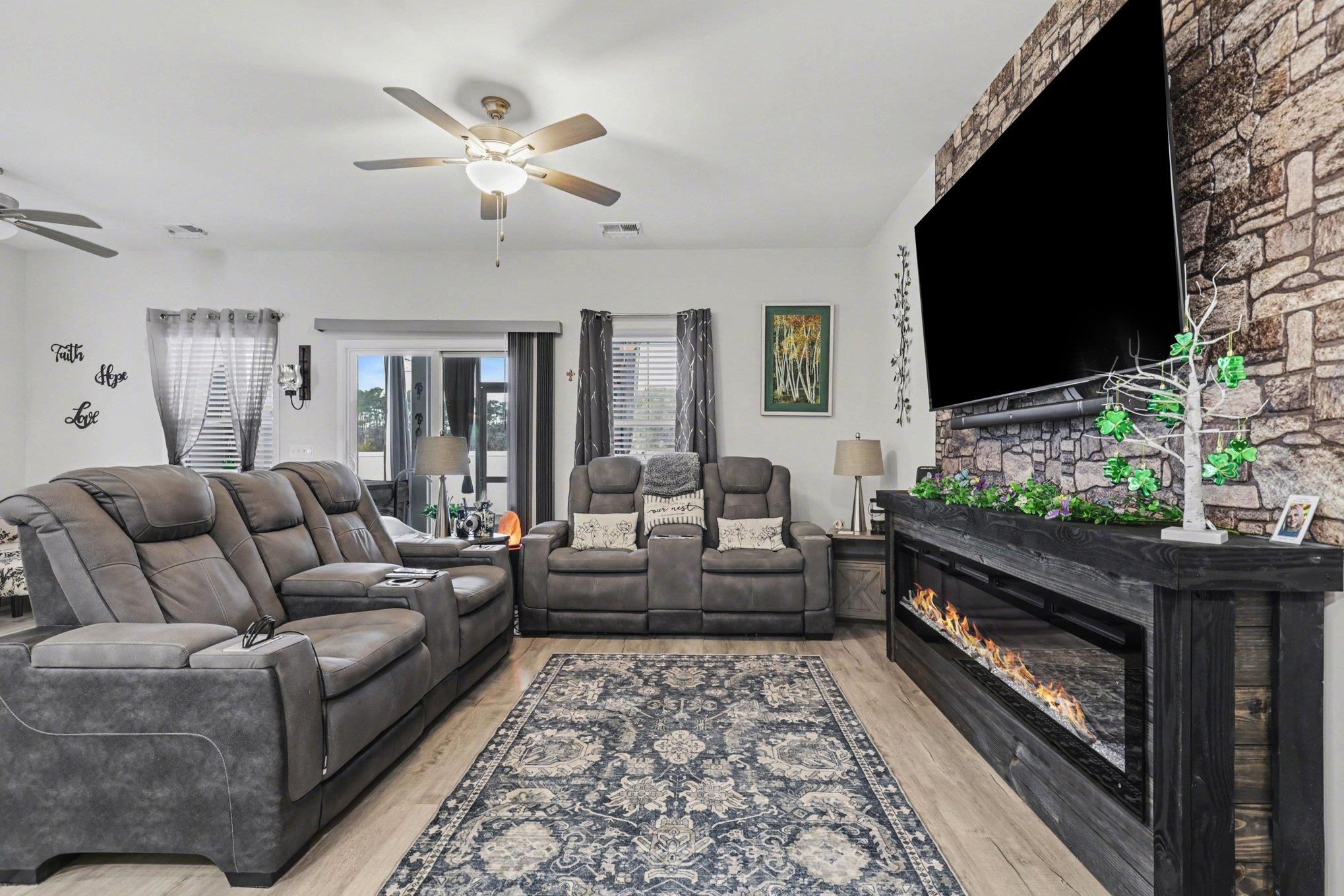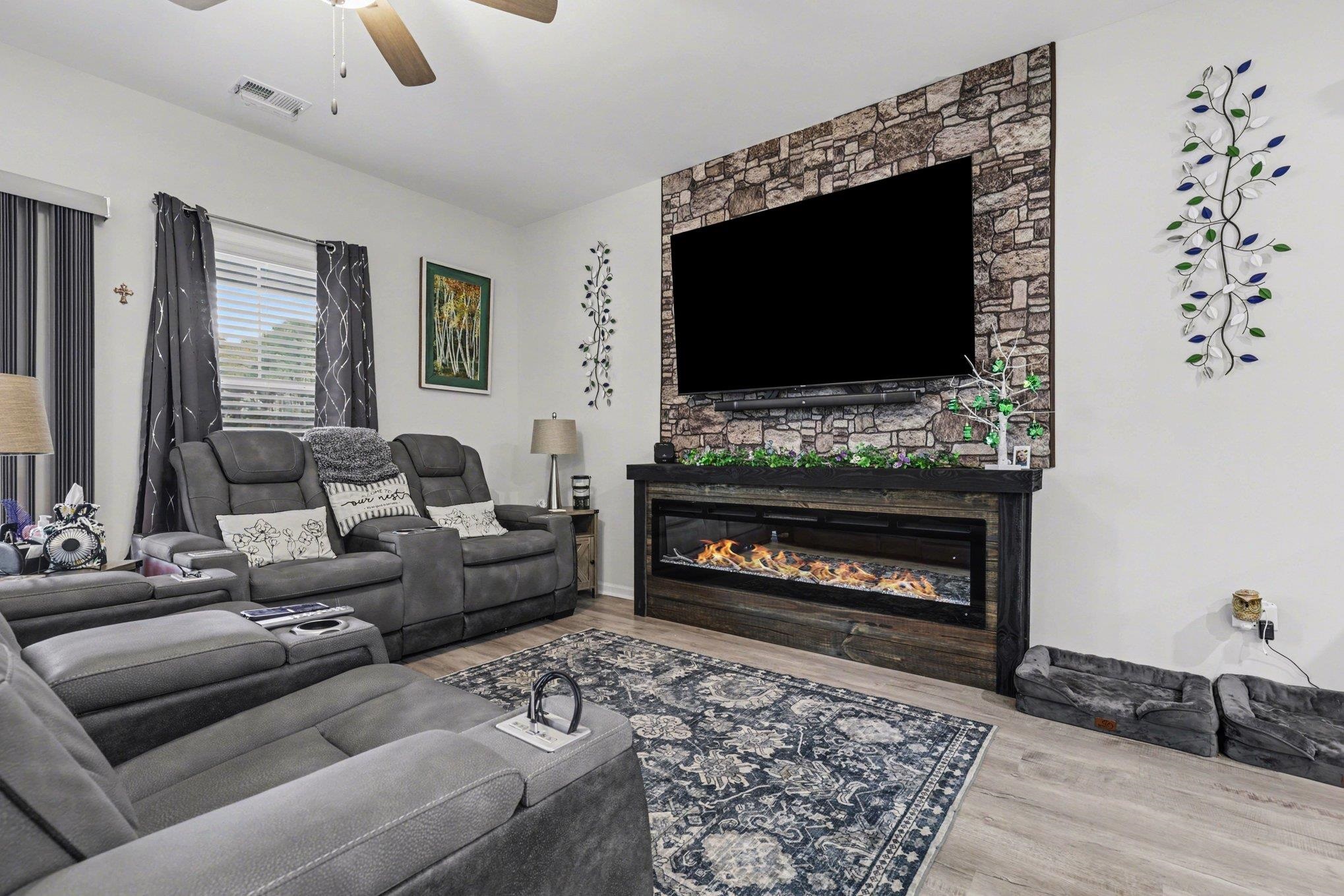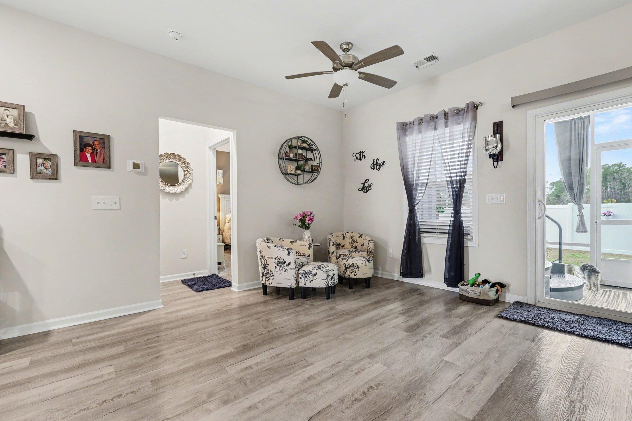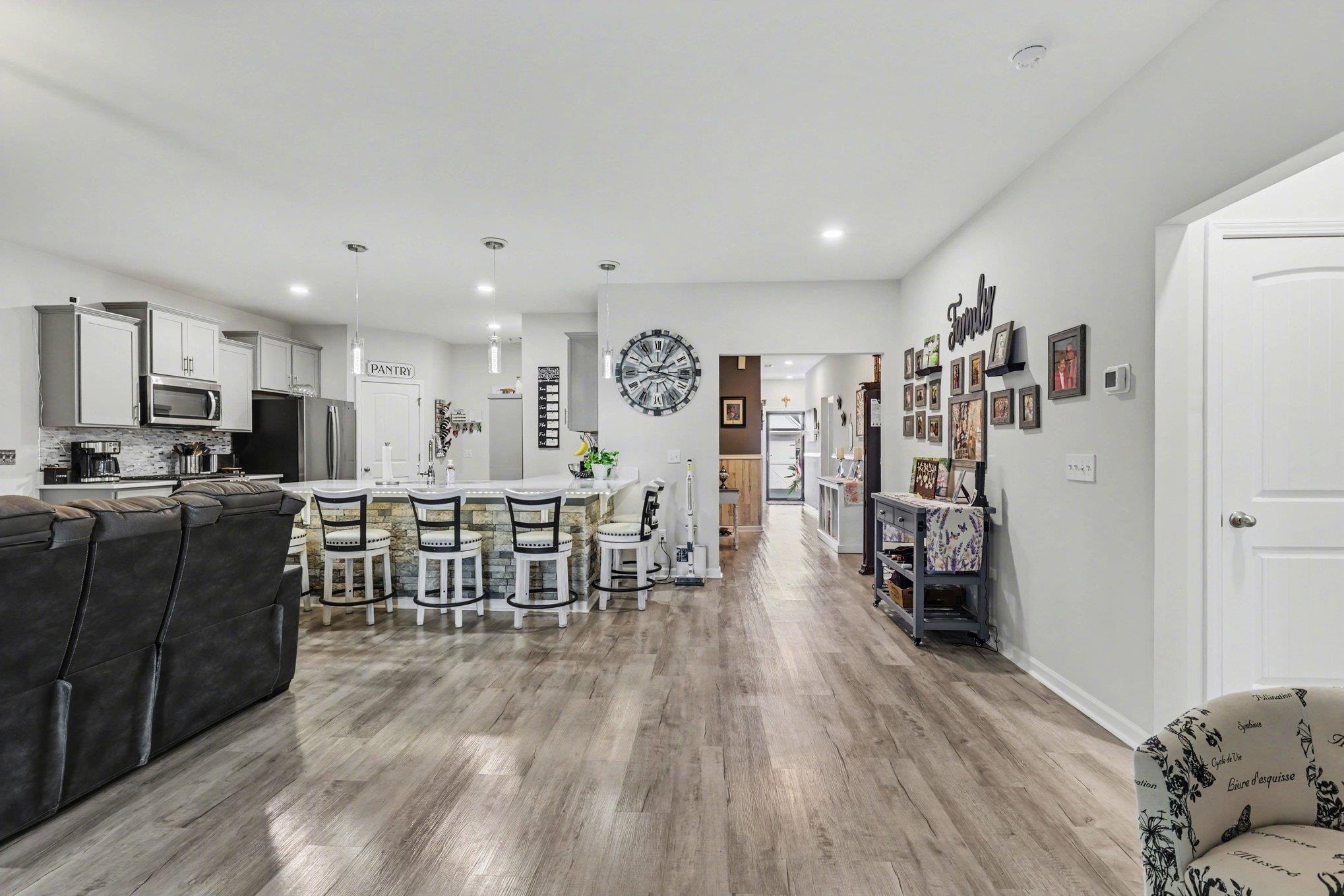 Welcome to this beautifully maintained home offering modern upgrades, open living space, and comfortable coastal living. This home features a bright and spacious open floor plan with luxury flooring throughout the and an exquiste feature wall, creating the perfect space for relaxing or entertaining. The kitchen is designed for both style and functionality with stainless steel appliances, ample cabinetry, a large peninsula with bar seating, pendant lighting, and updated track lighting. A spacious walk-in pantry provides excellent storage and convenience. The primary suite offers a peaceful retreat with a generous bedroom, large walk-in closet, and an ensuite bathroom featuring dual sink vanities and a beautifully tiled shower. Additional bedrooms provide flexible space for guests, a home office, or hobbies. Outdoor living is just as inviting with a screened-in back porch that provides the perfect place to enjoy the Carolina weather year-round. The garage features durable epoxy flooring for easy maintenance and a polished look. The garage has also been upgraded with its own air split system, making it ideal for a workshop, gym, or additional flex space. Additional upgrades include a brand new front door and smart switches throughout the home. With its thoughtful upgrades, open layout, and convenient location just minutes from North Myrtle Beach, golf courses, shopping, and dining.This move-in ready home is ready for you to enjoy. Buyer is respsonsible for verification.