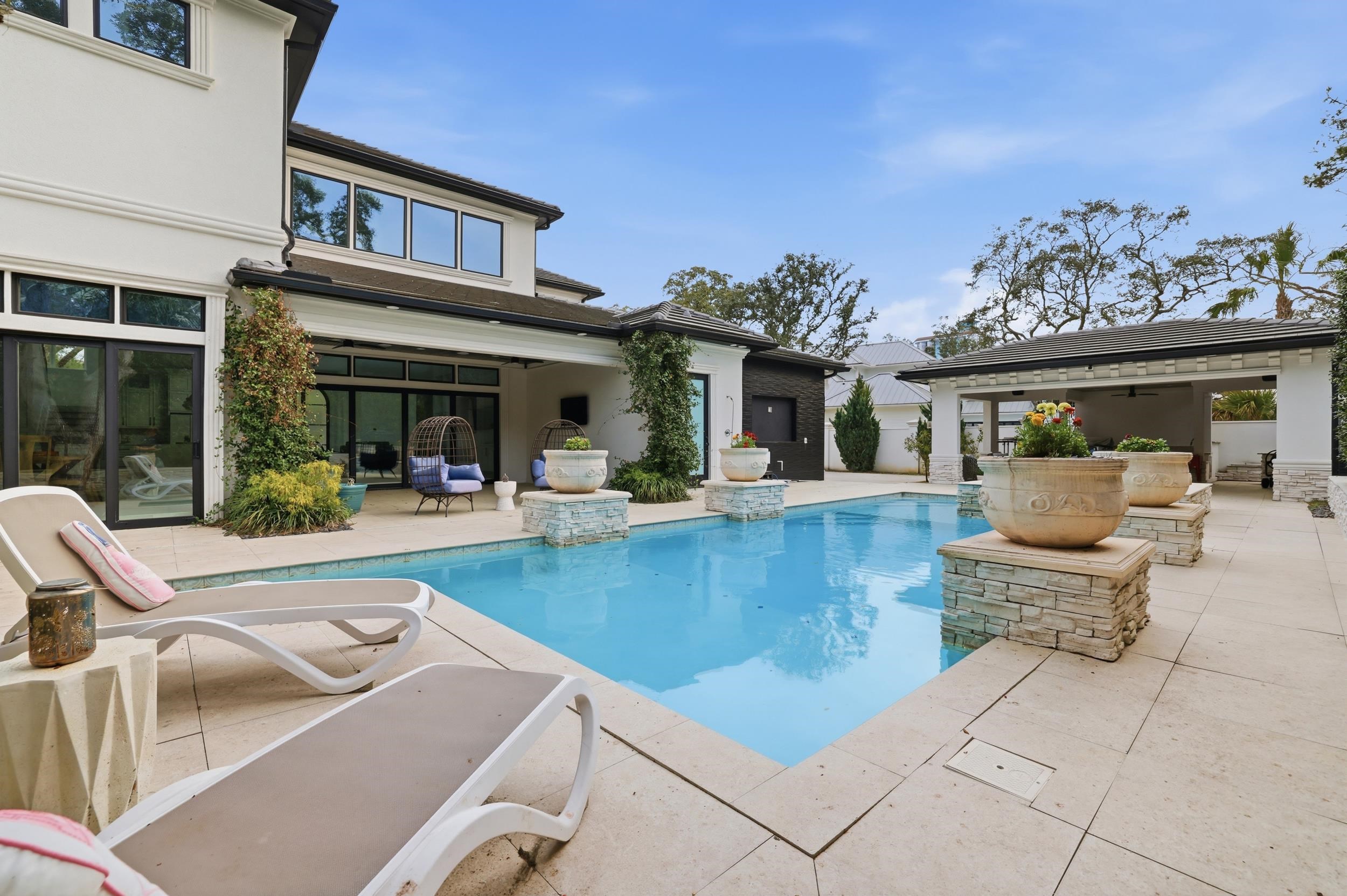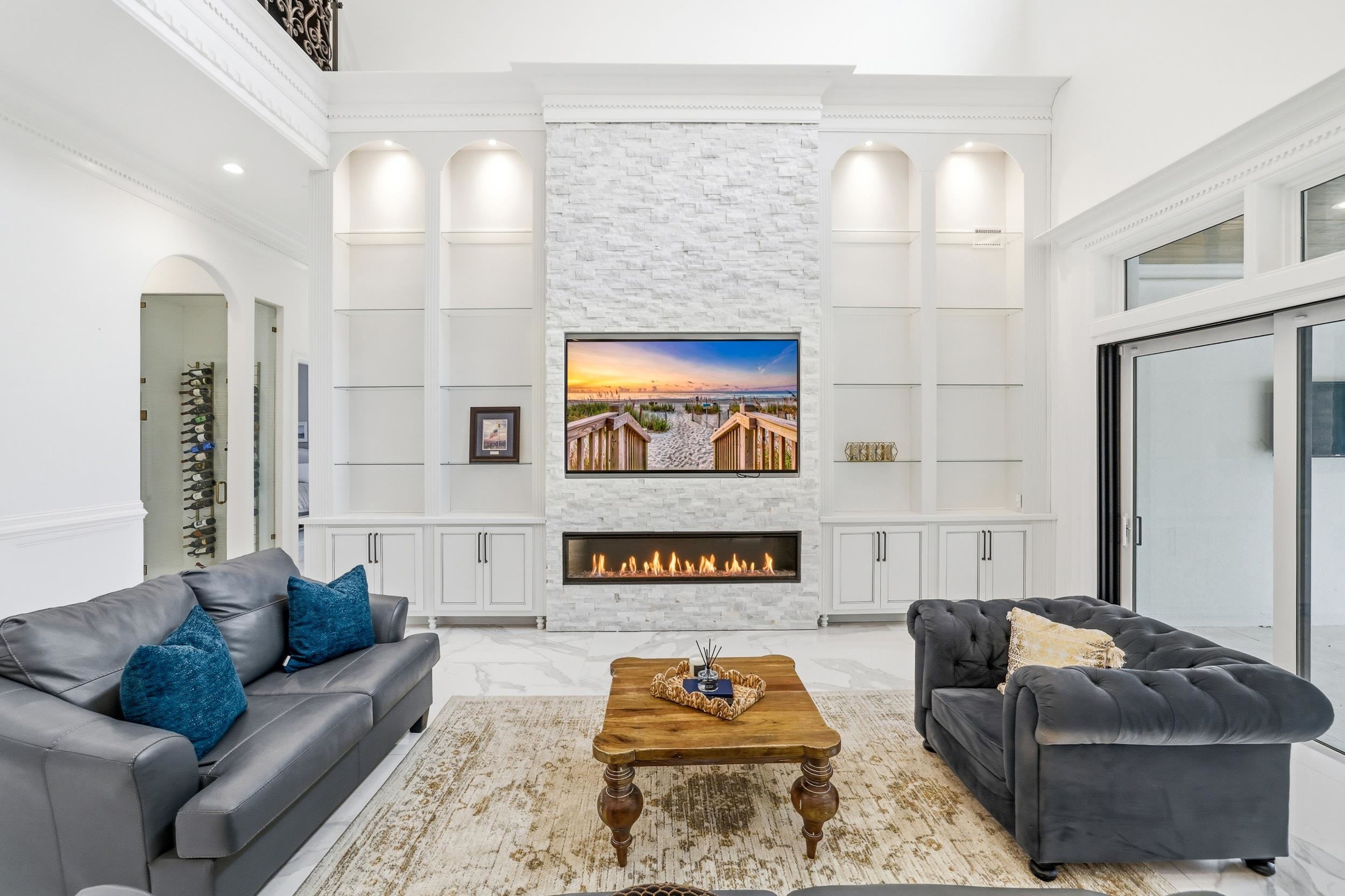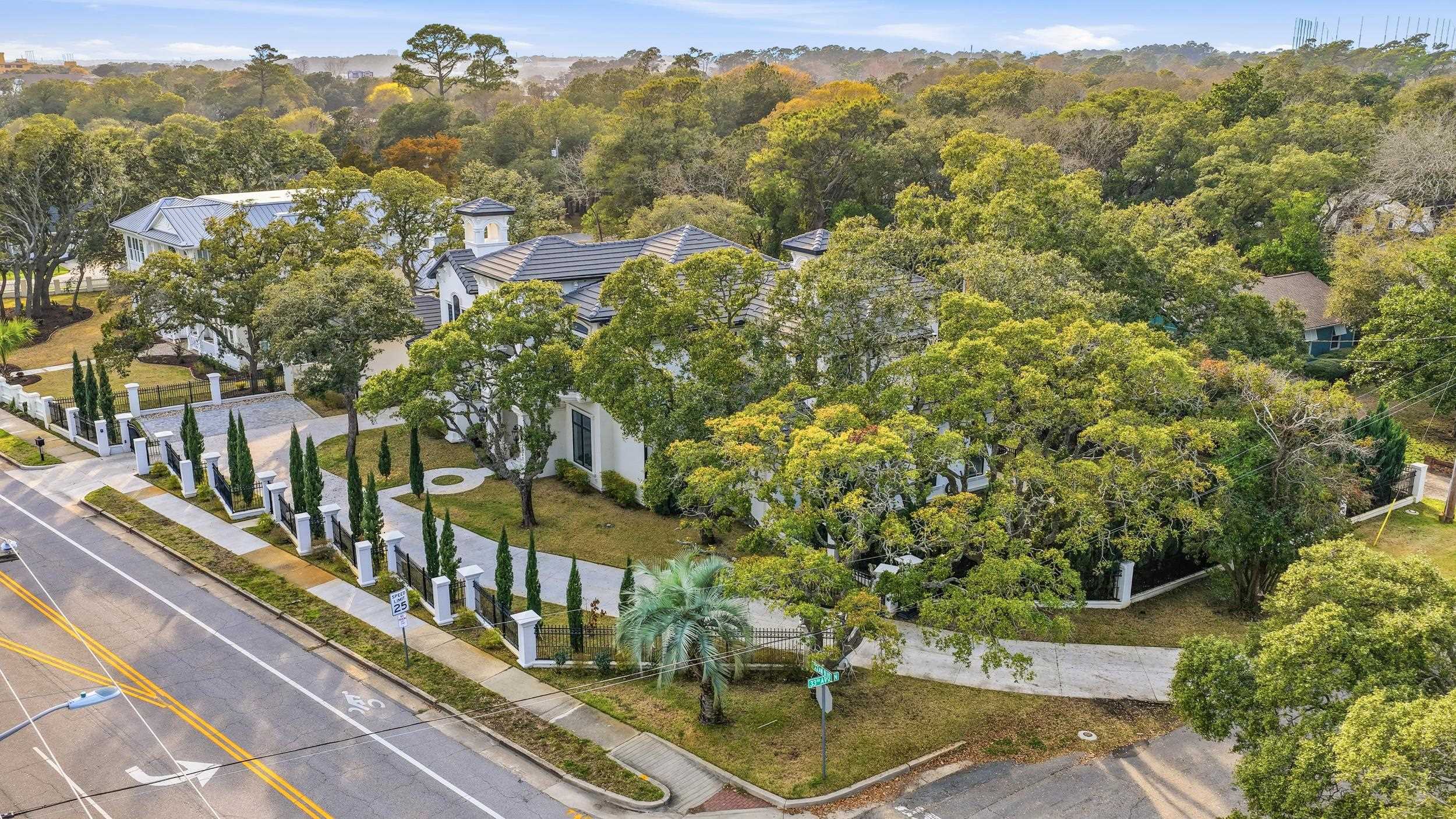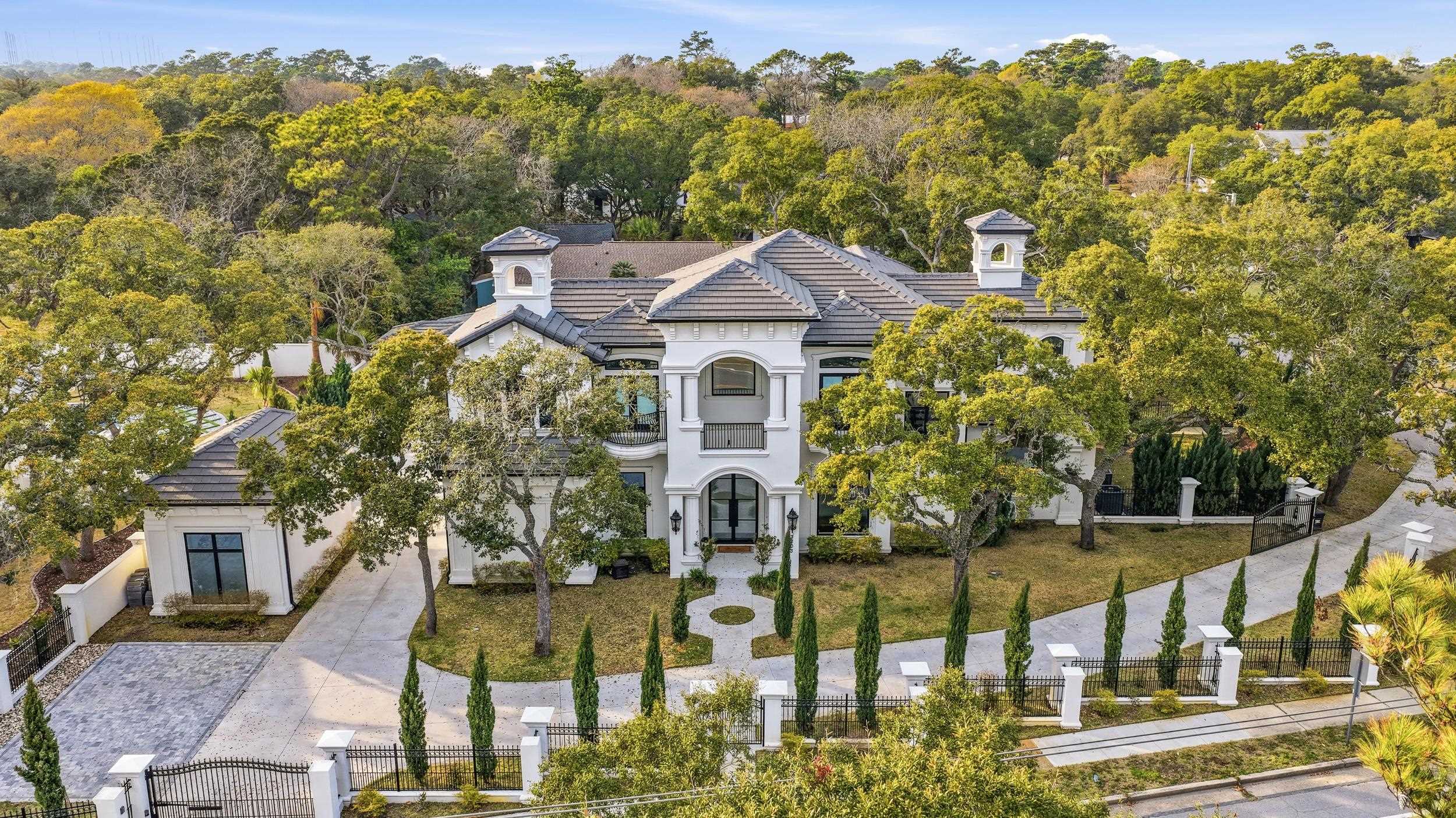 Welcome to 3203 Ocean Blvd. N, a rare opportunity to own a custom luxury home on the prestigious Golden Mile in Myrtle Beach- just across the street from the Atlantic Ocean. Situated on a fully gated corner lot, this Mediterranean-style residence offers 6 bedrooms and 5 full baths and two half baths with nearly 5,000 heated square feet of upgraded living space. The main level features two bedroom suites, a formal office, spacious living areas with two fireplaces, a gourmet kitchen with waterfall-edge counters, two custom islands, large walk in pantry, two oversized refrigerators with one being a Sub-Zero refrigerator, and a new dishwasher. Upstairs includes four additional bedrooms, a loft with built-in office space, and a dedicated media/movie room that comes including the cinema screen , projector and oversized furniture. TVs, washer, dryer, and much of the furniture can convey, including an art-style framed TV in one bedroom. Outdoor living is designed for entertaining with a heated saltwater pool, hot tub, gazebo, fire pit table, outdoor TV, and a fully equipped kitchen featuring a Coyote grill, two-burner cooktop, and ice storage as well as an upscale half bath outdoors with pool access. The backyard also includes an outdoor shower, fresh landscaping mulch, and updated irrigation with a new pump. Additional highlights include a four-car garage with new paver parking area, electric vehicle charging station, new pool heater and pumps, and a fully fenced yard with added puppy guard. This exceptional property combines luxury, privacy, and an unbeatable coastal location close to golf, dining, and shopping.
