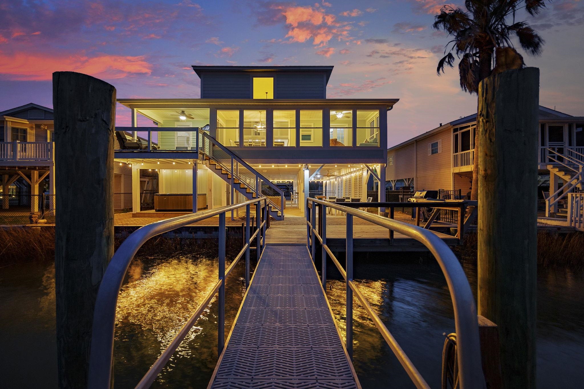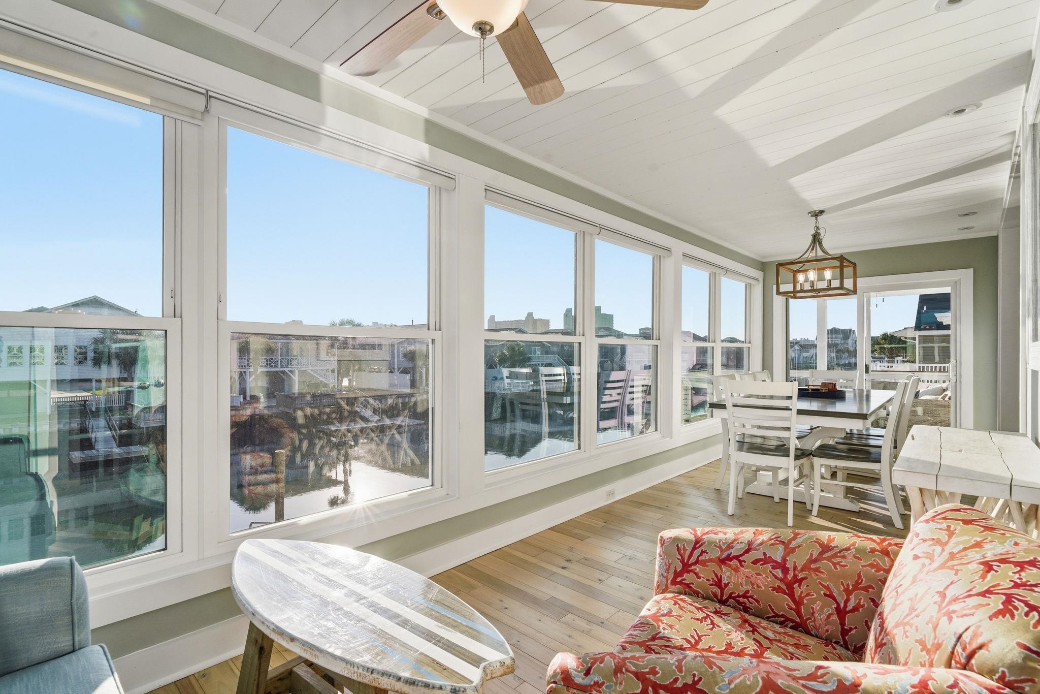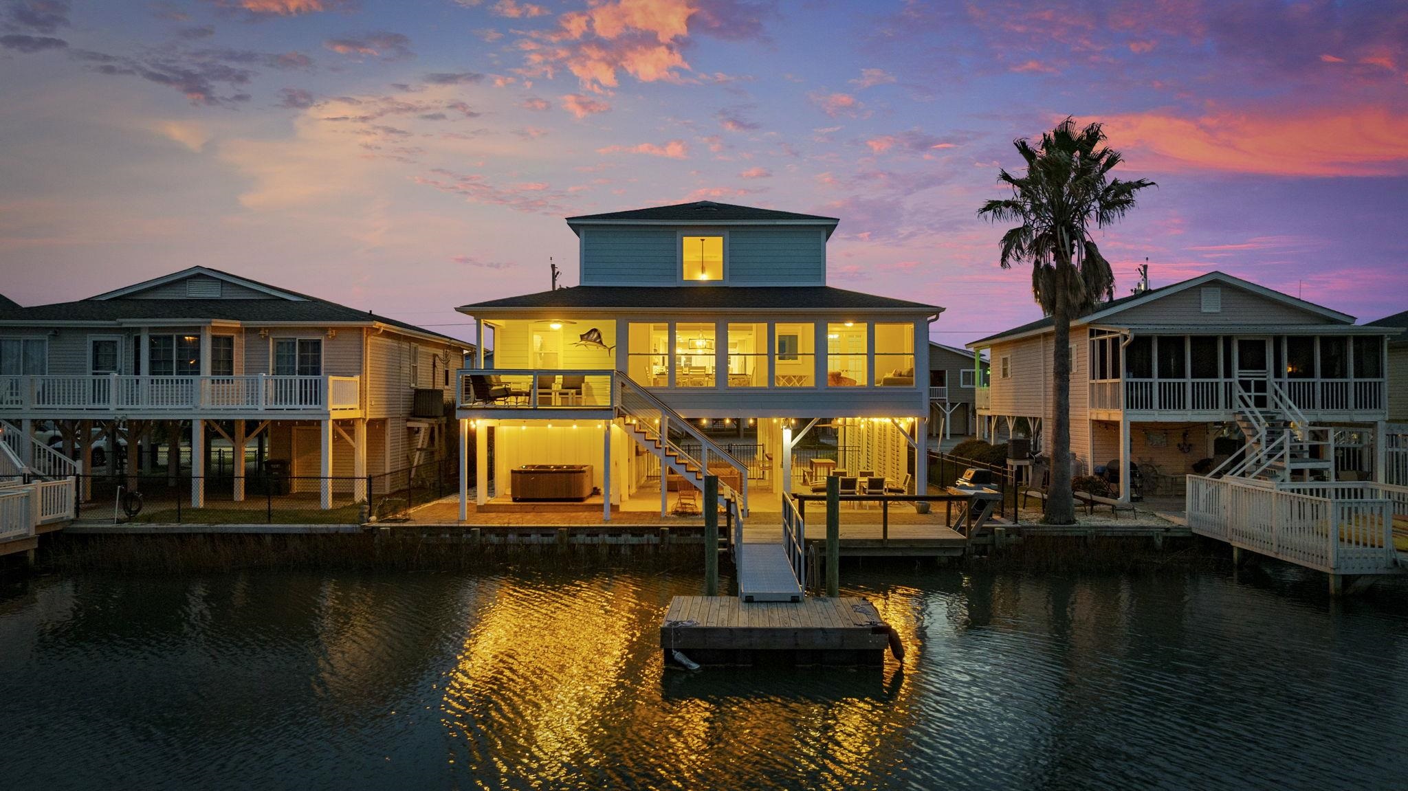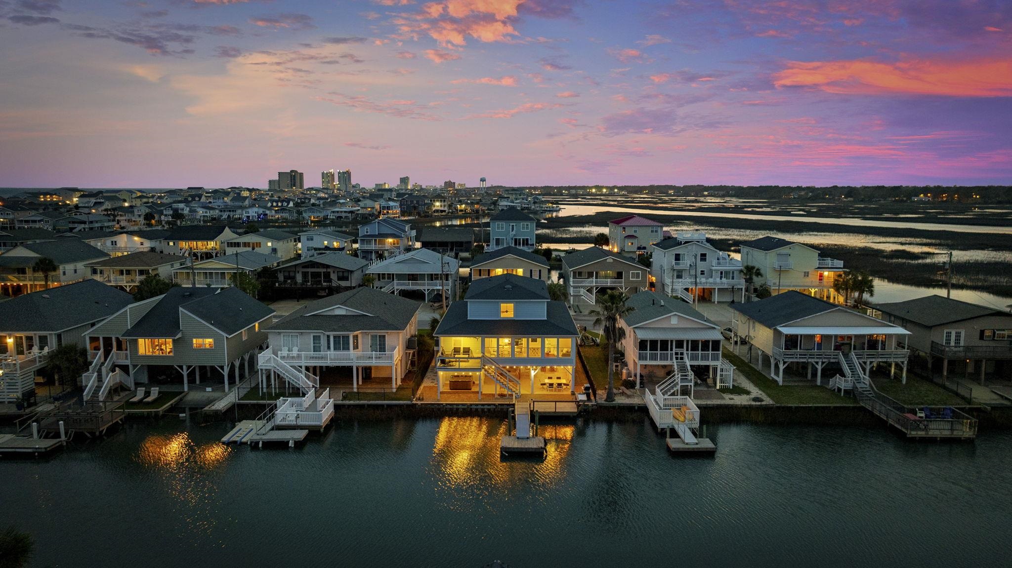 Experience the pinnacle of coastal living in this impeccably renovated 4-bedroom, 3.5-bath channel home in the heart of Cherry Grove. Reimagined from the studs up between late 2018 and 2019, this residence offers the rare peace of mind that comes with having all heated living space situated safely above the flood zone. Inside you'll find authentic hardwood floors, tongue-and-groove ceilings, and a modern aesthetic defined by contemporary cable railings and designer lighting. The chef’s kitchen is a focal point of the main level, featuring granite countertops, a classic subway tile backsplash, and custom cabinetry. Three of the four spacious bedrooms boast walk-in closets, while the bathrooms offer fully tiled showers and updated plumbing fixtures throughout. The renovation included a new seawall and a large oversized paver patio which you don't see often in Cherry Grove. The exterior features a new fence installed in 2023, a custom outdoor shower with composite decking, and professional stone landscaping. For those who need extra utility, the ground level provides a massive two-section workshop with built-in shelving and an additional finished storage room equipped with quartz countertops, sink, and a refrigerator. The perfect property for a Primary Residence, Home at the Beach, or a high-income producing Rental property, it is truly a gem in Cherry Grove with nothing quite like it!