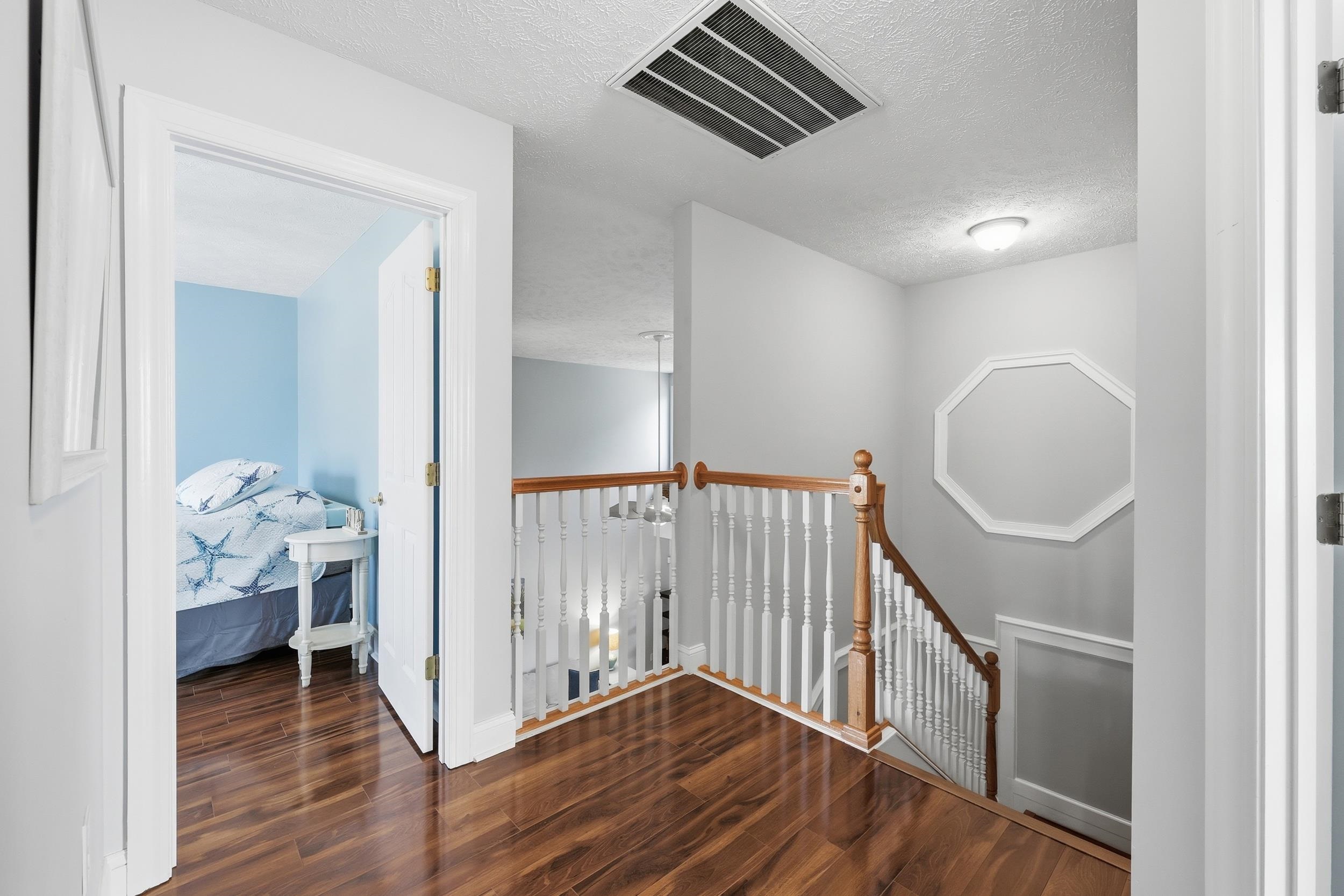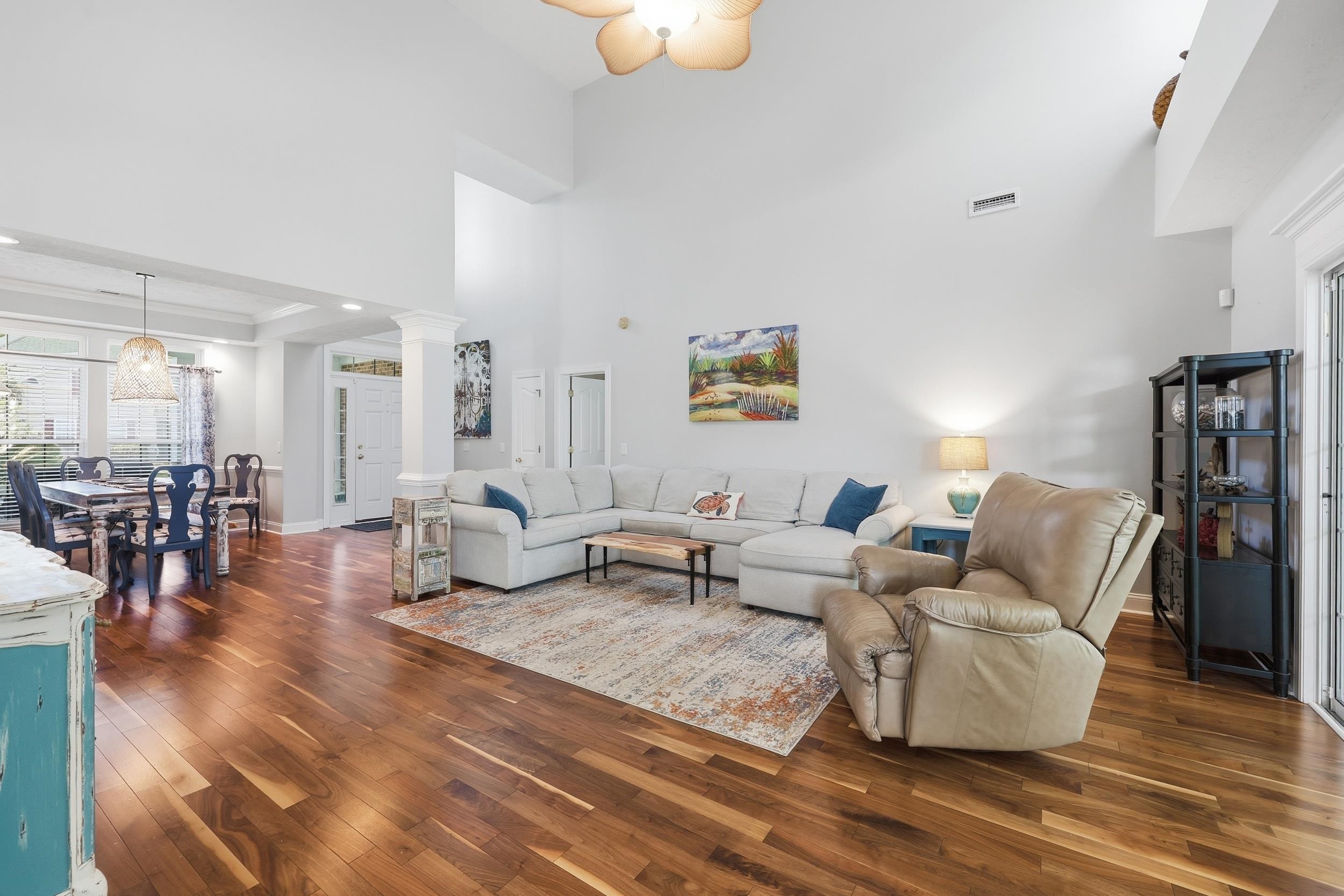 Welcome to this stunning 4-bedroom, 3.5-bath home located in the sought-after gated community of The Bays of Prince Creek, where comfort and lifestyle come together. Nestled on a spacious 0.41-acre lot with a serene lake view, this home immediately impresses with its mature, professionally designed landscaping and beautiful stamped concrete driveway. Step inside to a breathtaking living space featuring a soaring 18-foot ceiling and rich walnut hardwood floors that create a warm yet grand atmosphere. Plantation shutters throughout add timeless charm, while the open floor plan seamlessly connects the living room to the eat-in kitchen, making it perfect for both everyday living and entertaining. The kitchen is a true centerpiece, offering quartz countertops, a custom backsplash, and stainless-steel appliances. The first-floor master suite is a private retreat, complete with a spacious walk-in closet featuring custom built-ins and a luxurious ensuite bath with dual vanities, a garden tub, and a separate shower. Also on the main level, you’ll find a convenient laundry room and half bath. Upstairs, additional bedrooms provide ample space for family or guests. Step outside to your fenced backyard oasis, where a stamped concrete patio overlooks the peaceful lake, perfect for relaxing evenings or hosting gatherings. Additional features include a central vacuum system, intercom system, and a mop sink in an attached 2-car garage. Living in Prince Creek means more than just owning a beautiful home, it’s about embracing a lifestyle. Residents enjoy access to top-tier amenities including two pools, a clubhouse, tennis courts, pickleball, basketball, volleyball, handball, and cozy fire pit areas. Located in the heart of Murrells Inlet, you’re just minutes from the Marsh Walk, known for its waterfront dining, live music, and breathtaking coastal views, as well as close to golf courses, shopping, and the beach. This home offers the perfect blend of luxury, comfort, and community, come experience it for yourself.