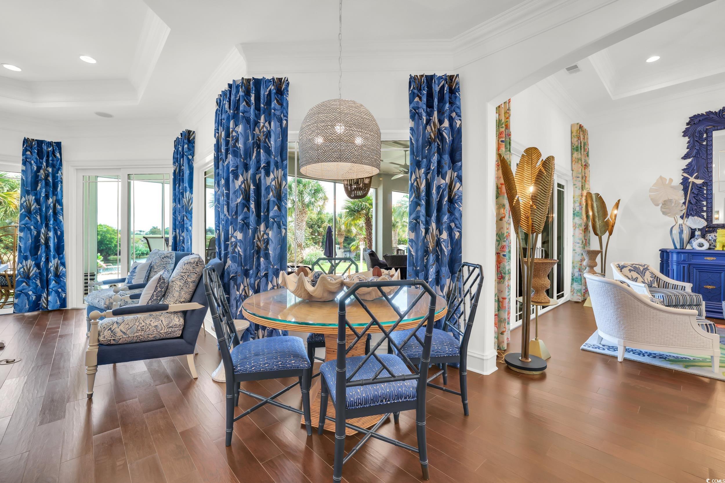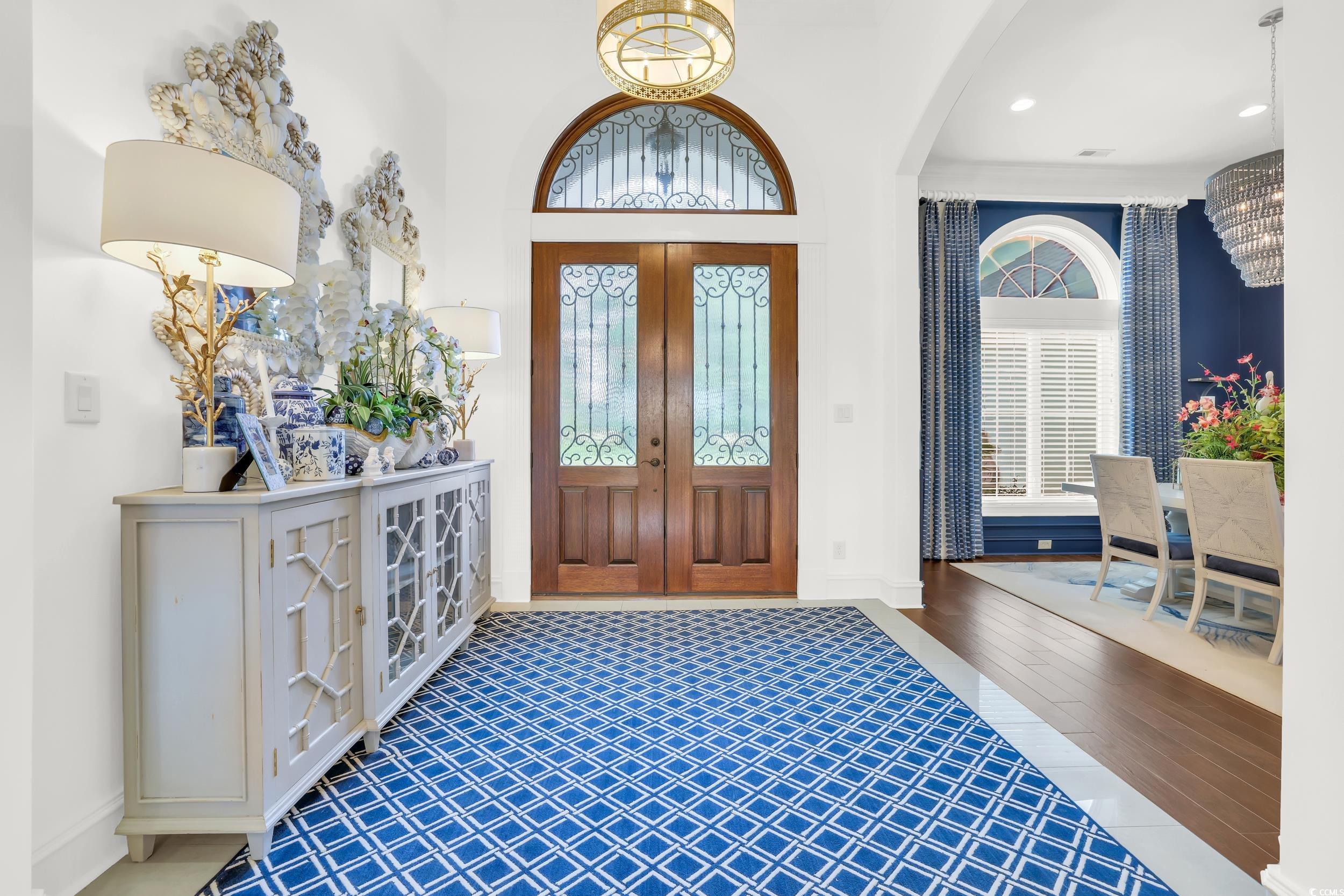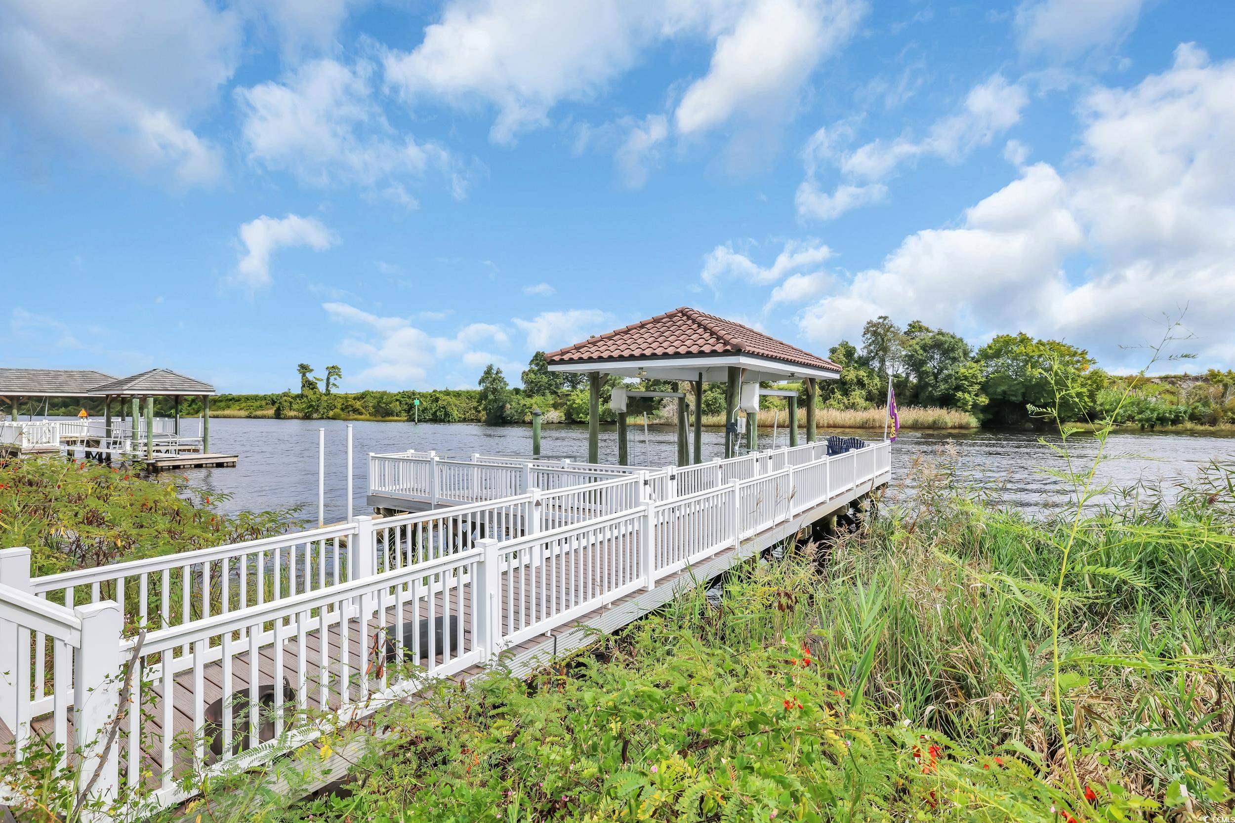 Waterfront home in the gated Dye Estates at Barefoot Landing. This 4-bedroom, 3-bathroom residence features a mostly single-level layout with an open floor plan, a well-equipped kitchen with professional Viking appliances, and versatile spaces including an upstairs bonus room and a separate office or workout room. Stacking sliding doors connect the living room to a screened patio, creating seamless open-air living. The outdoor area is designed for relaxation and entertainment, with a pool, hot tub, covered lanai with summer kitchen, and direct Intracoastal Waterway access including a private dock with lift. Owners also enjoy access to the Barefoot Resort beach cabana, with the beach only a short drive away. The Dye Estates provide a secure setting near golf, shopping, dining, and entertainment at Barefoot Landing.