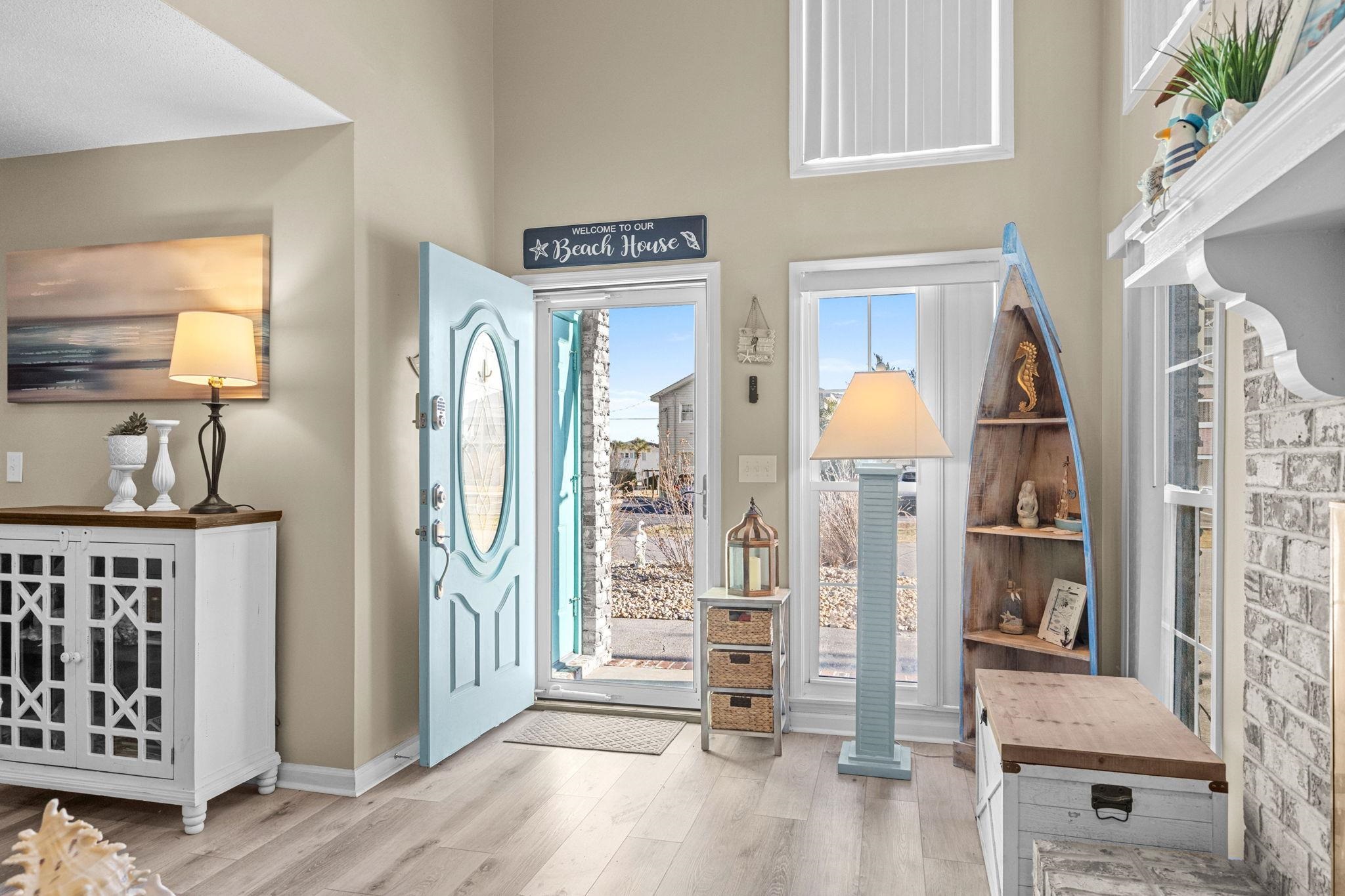 Crescent Beach coastal home that checks all the boxes! Located only 2 blocks from the beach, Turn-key, and No HOA! Many recent updates including furnishings, new roof, mini splits in both upstairs bedrooms, and New LVP throughout both levels with wood stair treads professionally painted to match.Perfect for entertaining the main level is open concept with dining room french doors leading to the covered and tightly secured patio/ BBQ area where you can relax and listen to the sounds of the ocean and feel the coastal breeze.New kitchen & dining room: custom cabinets(2024), quartz countertops (2024),tile backsplash (2025), and stainless appliances(2025).Washing dishes isn't such a chore when you can see the ocean from your very own kitchen window!Living room offers lots of light with vaulted ceilings and a cozy fireplace.Main level master bedroom with walk-in closet. Bathrooms have been completely updated with stand up tile showers, frameless glass doors, custom vanities, lighting, and flooring. The aqua colored newly added Bermuda shutters with painted doors to match gives you that tropical curb appeal vibe.Investors take note of this one! No restrictions on min. days rentals, golf carts & motorcycles allowed, parking for 4 vehicles, outdoor shower, and close walking distance to area amenities. Ideal for the area in Flood Zone X (low risk for the area).