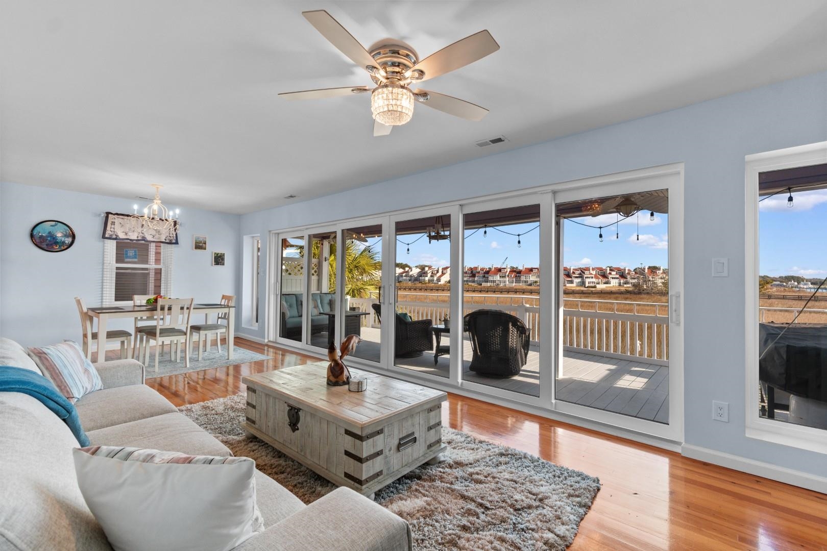 Tucked inside the intimate, 18-home gated community of Crystal Pointe, this waterfront retreat with private boat dock is one of those rare finds that truly stops you in your tracks. Set along the Intracoastal Waterway in Little River, the home comes partially furnished and delivers some of the most breathtaking views you'll find anywhere on the Grand Strand---views you can soak in from not one, but two oversized decks. Morning coffee, sunset cocktails, or watching boats drift by---this home makes every moment feel special. If life on the water is your dream, you'll love the private 30-foot boat slip, complete with a 10,000-lb boat lift and two floating jet ski slips. When it's time to entertain, the home truly shines. The 800-square-foot recreation area beneath the home opens directly onto a marsh and waterway terrace and is set up for fun with a bar, kitchenette with fridge and microwave, comfortable seating, and TV. And if you prefer more parking space down the road, the garage-grade porcelain tile flooring and operational garage doors allow for easy conversion back to parking. Inside, the main living area is designed to connect you to the outdoors. A full sliding glass wall opens wide---left, right, or from the center---letting in coastal breezes and blurring the line between inside and out. The first-floor primary suite includes a private sitting or office area and an ensuite bath, creating a peaceful retreat at the end of the day. Thoughtful details throughout include oak and Brazilian cherry flooring, Corian countertops, stainless steel-finish appliances, a cozy gas fireplace for cooler evenings, and even double Murphy beds in one of the guest rooms for flexible living space. Major updates provide peace of mind, including a brand-new roof (2025), water heater (2025), newer HVAC system (2022), and updated windows and sliding glass wall (2023). The home also features in-ground irrigation and plenty of storage for coastal living. Crystal Pointe residents enjoy a community boat ramp, day dock, and private boat and jet ski slip area reserved for select owners---making this a true boater's paradise. Whether you're entertaining friends, heading out on the water, or simply enjoying the view, this home offers a lifestyle that's hard to match!