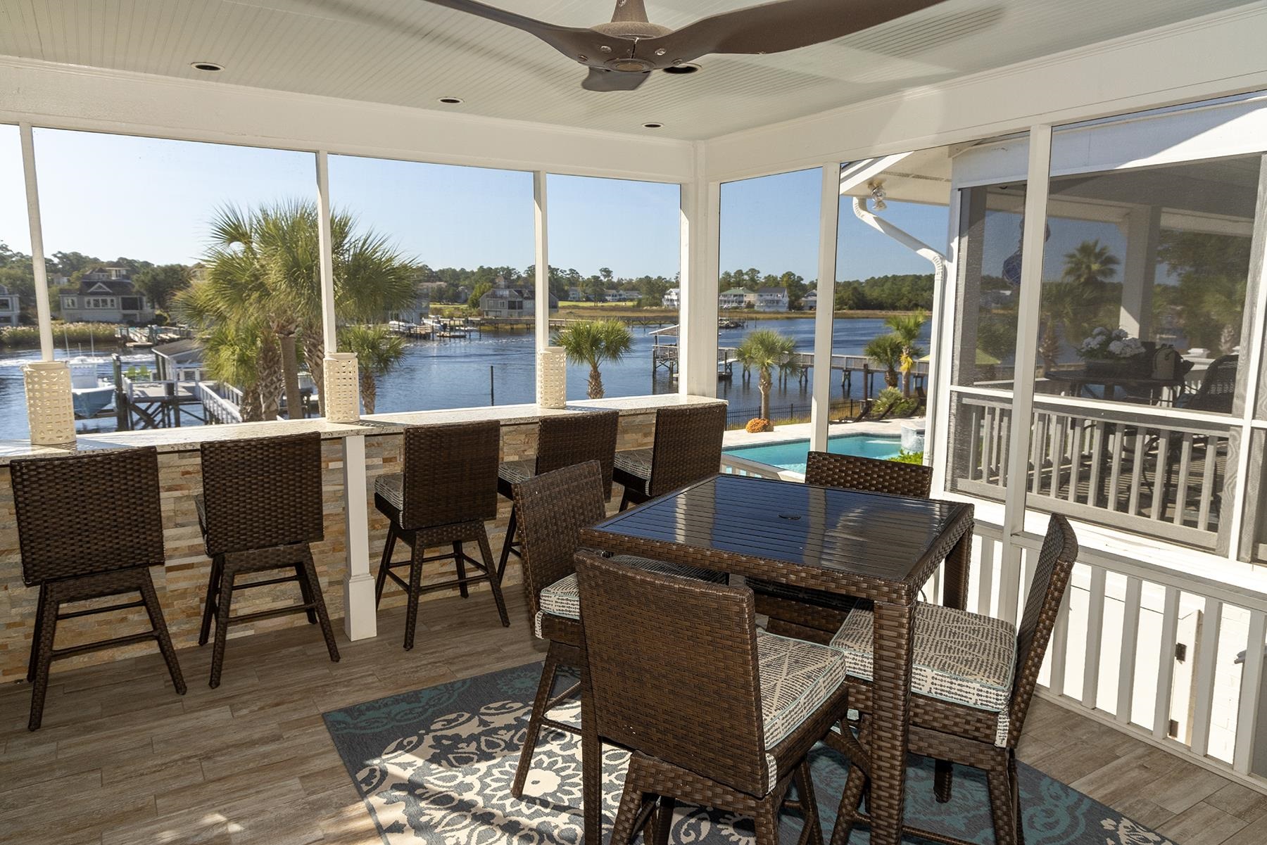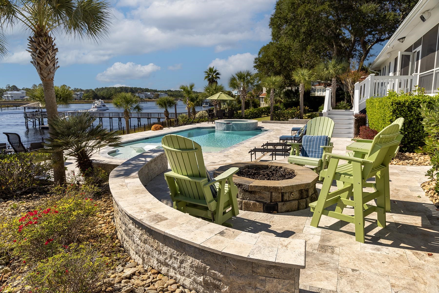 This stunning waterfront estate elevates coastal living to an unparalleled level, offering direct Intracoastal Waterway access in the heart of the charming seaside town of Little River, South Carolina. Located in the secluded Eastport community, this exceptional property spans approximately 2.17 acres of meticulously manicured grounds and boasts nearly 210 feet of pristine waterfront—an exquisite setting for the discerning buyer. Nestled at the end of a private drive, the residence offers approx 3,477 sq. ft. of thoughtfully designed heated living space, blending luxury, privacy, and sophisticated coastal charm. Inside, you’ll find three beautifully appointed bedrooms, each with its own full en-suite bath. The primary suite serves as a true retreat, featuring a spa-inspired bath with a double shower, a luxurious soaking tub, and an elegantly designed walk-in closet. The gourmet kitchen is a chef’s masterpiece, equipped with a Gas Thermador Range, Sub-Zero full refrigerator and freezer, and an expansive scullery complete with a steam oven, second dishwasher, and dedicated ice machine. The adjoining great room includes a refined wet bar with an additional ice maker and wine cooler, creating the ideal space for entertaining. A spacious formal dining area further enhances the home’s exceptional hosting capabilities. Resort-style outdoor living defines the property’s beautifully designed grounds. Enjoy a 20' x 38' heated pool and spa, a fully equipped outdoor kitchen, a charming fire pit perfect for evening gatherings under the stars, and a fenced backyard with aluminum fencing for added appeal. The covered dock includes a 16,000-lb boat lift, jet ski lift, and captivating landscape and dock lighting creating an enchanting ambiance along the waterfront. Distinguished extra features include a whole-house Generac propane generator, encapsulated crawl space, white oak hardwood floors throughout, underground utilities, and a comprehensive irrigation system. The property also offers a two-car attached garage, a detached two-car garage and a separate storage building. Exuding timeless elegance and exceptional craftsmanship, this waterfront estate offers a rare opportunity to enjoy luxurious, secluded coastal lifestyle in the peaceful Eastport community. Truly a fisherman’s and boater’s paradise, this property provides serene waterfront living with direct Intracoastal Waterway access—an ideal retreat for those who cherish life on the water and all if has to offer.