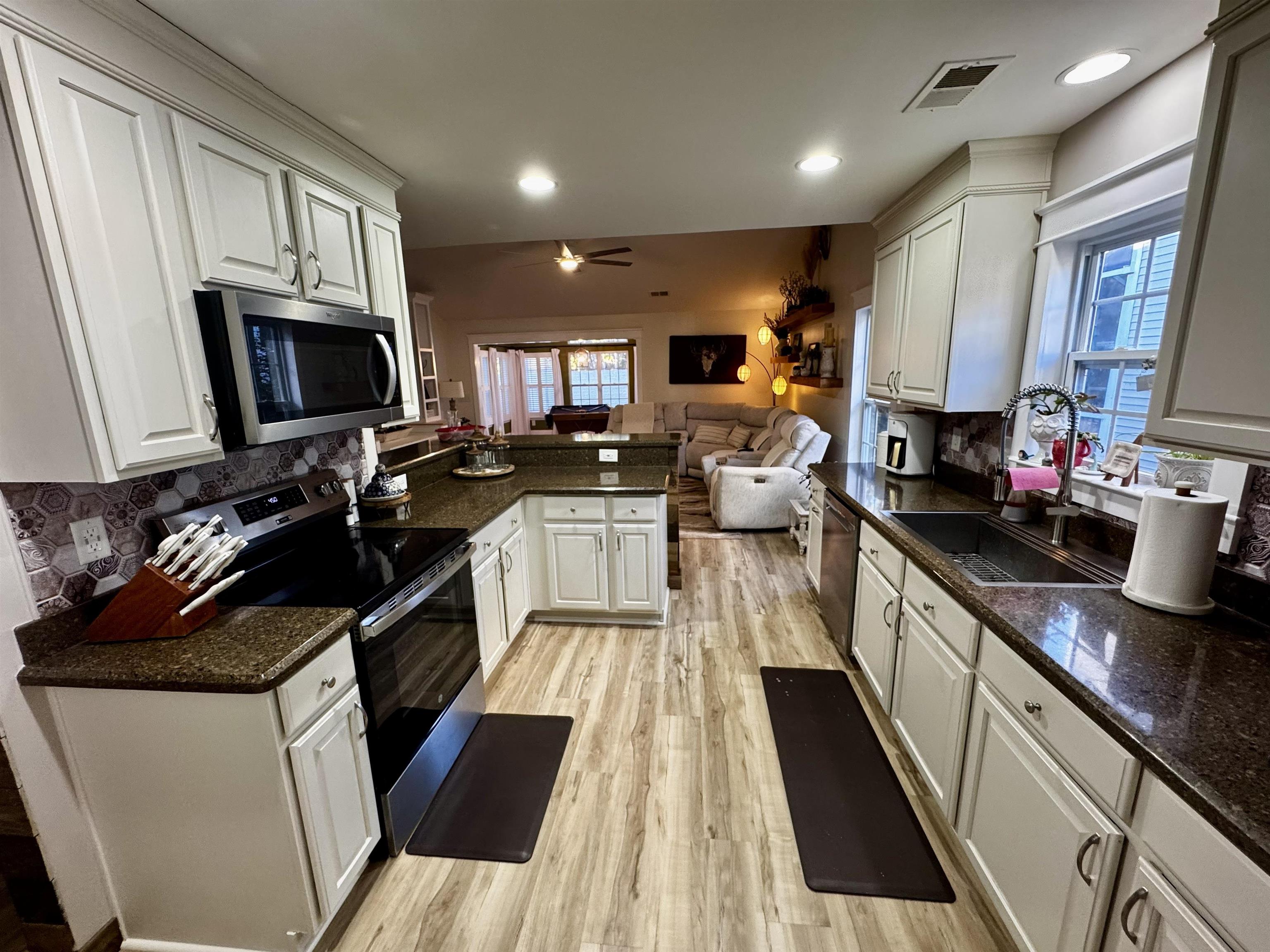 Updated and located in Barefoot Resort. This updated, move-in ready home in the highly sought-after Barefoot Resort & Golf community of North Myrtle Beach, where coastal living meets premier golf and resort-style amenities just minutes from the ocean. Inside, you’ll find a bright, open-concept layout designed for both everyday living and entertaining. The kitchen flows seamlessly into the living room and Carolina room, creating an inviting space filled with natural light. Recent updates include luxury vinyl flooring throughout, granite countertops, and a beautifully remodeled primary bathroom featuring a spa-like walk-in tile shower. Vaulted ceilings add to the home’s spacious and airy feel. This well-maintained home offers four spacious bedrooms and thoughtfully updated interiors that blend comfort with modern style. Step outside to a pergola-covered patio overlooking a large, fenced backyard — perfect for entertaining, pets, or relaxing coastal evenings. With the attached and transferable membership you will enjoy access to four championship golf courses. Ownership includes access to multiple community pools, and the exclusive Residential Owners Club with a fitness center and resort-style pool. Ownership also includes access to a private oceanfront beach cabana and a complimentary seasonal shuttle for easy beach days. Ideally located near Barefoot Landing, you’re just minutes from shopping, dining, entertainment, and the Intracoastal Waterway. Listing agent is owner