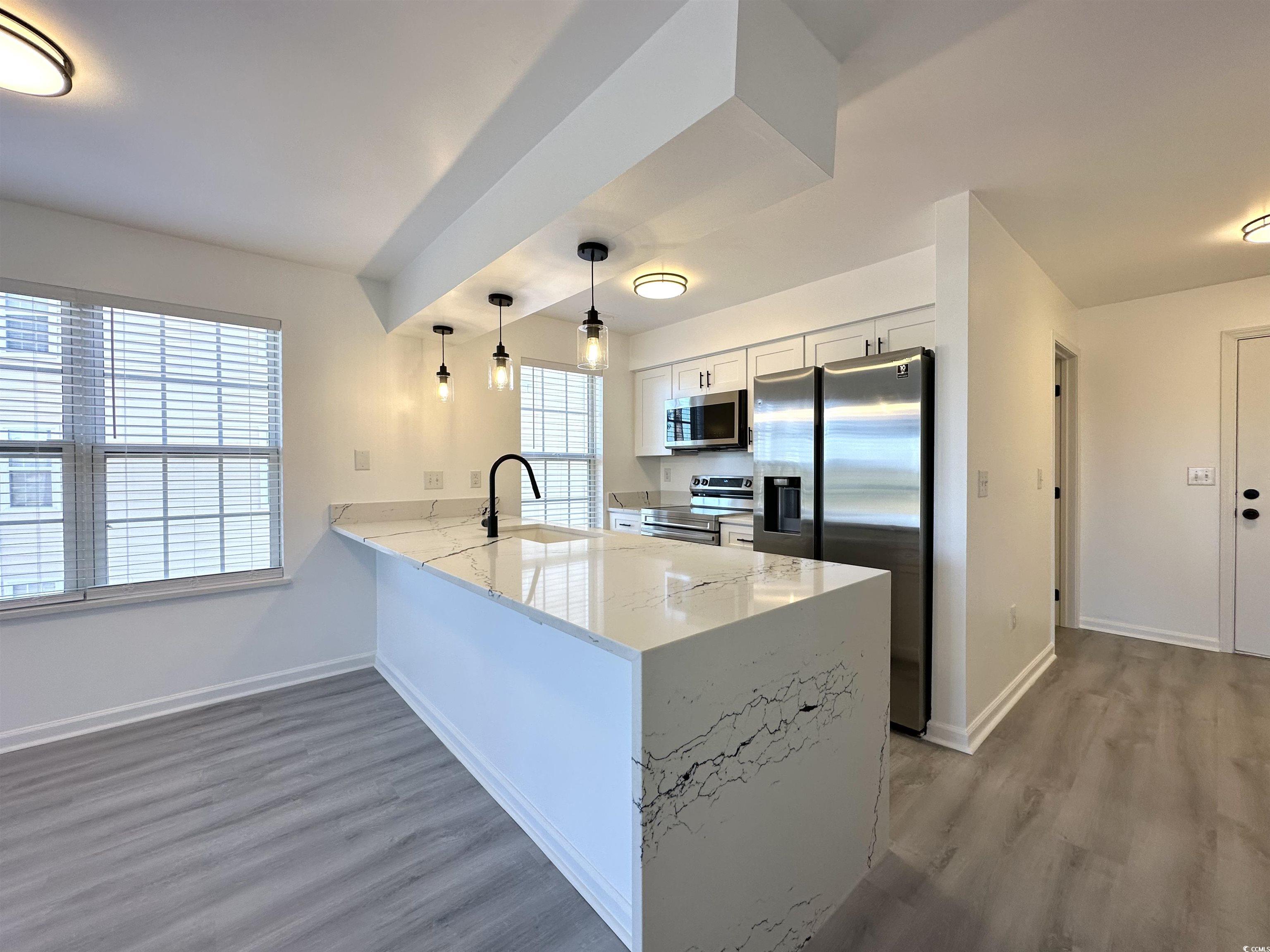 MOTIVATED SELLER!!! A MUST SEE!!! This fully remodeled two bedroom, two bathroom is move-in ready! Designed with neutral colors, new LVP flooring, black light fixtures and freshly painted. The kitchen is a chef’s dream, featuring brand new cabinets, Quartz countertops and stainless steel appliances, all that overlooking the famous Wizard Golf Course! Situated on the second floor, this end-unit condo offers lots of natural light, amazing views and an inviting open-concept layout with a generously sized screened-in rear porch that had porcelain tile installed. The HVAC was replaced in 2022, and the water heater was also upgraded in 2022. The spacious master suite boasts a walk-in closet and private access to the patio, a full bathroom with double sinks, LED mirrors and an oversized shower-tub combo. The community also features fantastic amenities, including swimming pool, clubhouse, playground and grilling stations, ensuring a perfect blend of relaxation and convenience. Whether you’re looking for an investment opportunity, a primary or second home, this condo is a perfect match, located a short drive to the beaches and all the attractions of Myrtle Beach, surrounded by several of the area's finest golf courses, great school district and easy access to 501 and 31. Call your Real Estate agent or the listing agent today for a showing!
