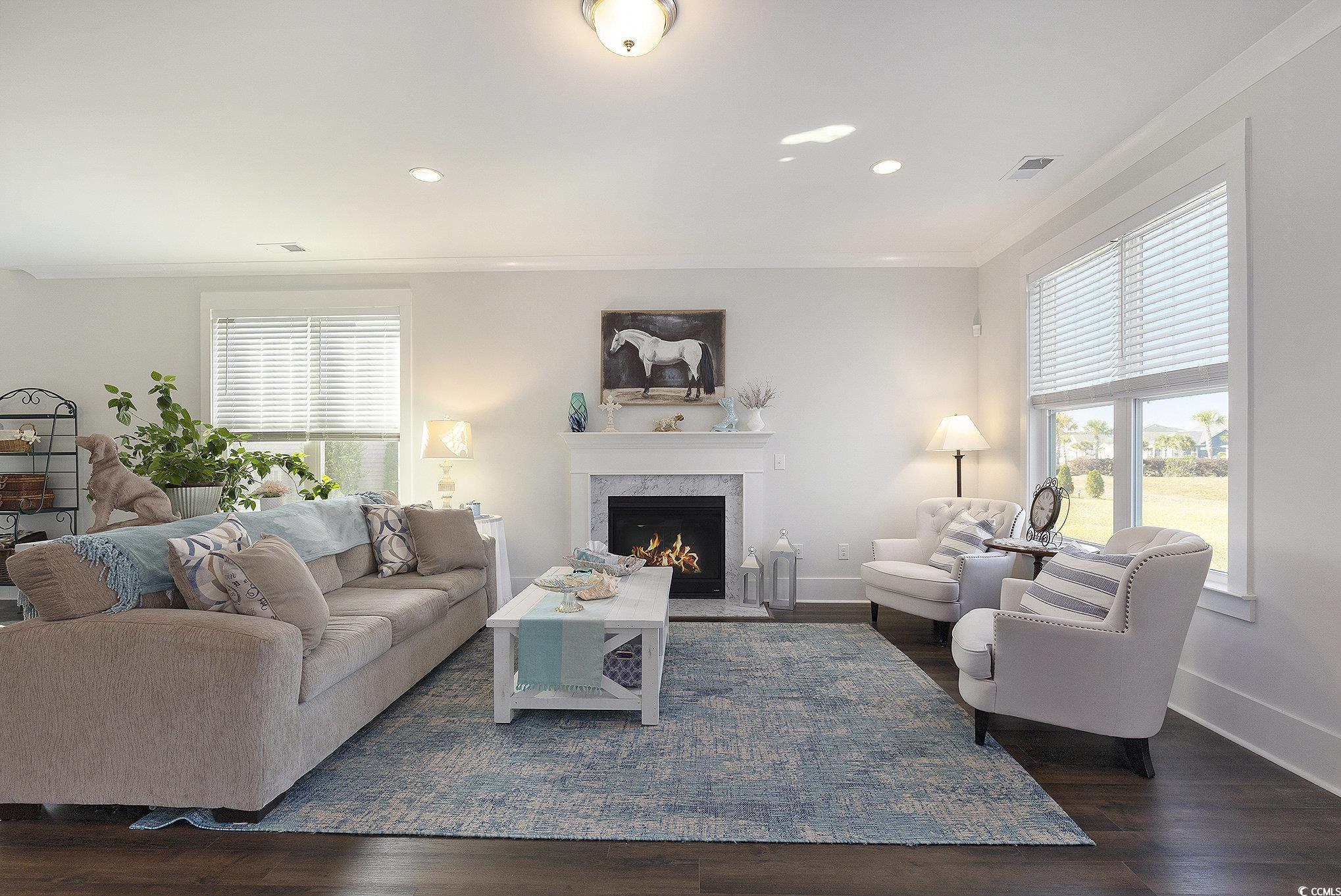 Welcome to this beautifully upgraded 3-bedroom, 2.5-bath home in the highly sought-after Clear Pond at Myrtle Beach National community. Enter through the foyer into an open first-floor layout featuring LVP flooring and craftsman-style molding throughout. The living room is bright and inviting with crown molding and a natural gas fireplace. The kitchen offers stainless steel appliances, quartz countertops, a breakfast bar, pantry, tiled backsplash, and under-cabinet lighting. Off the kitchen is a charming dining room with a coffered-beam ceiling and wainscoting. At the rear of the home, the Carolina room fills with natural light and provides access to the concrete patio overlooking the pond. The first floor also includes an office and a half bath. Upstairs, the spacious owner’s suite features a tray ceiling, pendant lighting, LVP flooring, and a private balcony. The suite includes two walk-in closets. The first is located directly off the bedroom for easy access. The second, even larger walk-in closet is located inside the owner’s bathroom and offers direct access to the tiled laundry room creating an extremely convenient layout. The owner’s bathroom has a garden tub, walk-in shower, double-sink vanity, and tiled flooring. A loft sits at the top of the stairs, and two additional bedrooms complete the second floor, each featuring custom accent walls and carpeted flooring. Additional highlights include oak tread stairs leading to the second floor, surround-sound wiring, a natural gas hookup on the patio, and a two-car garage equipped with a slop sink and cabinetry. Clear Pond amenities include two pools, a clubhouse, fitness center, walking trails, and playgrounds. Conveniently located near Coastal Carolina University, Conway Hospital, shopping, dining, golf, and just minutes from the beach. Schedule your private showing today! Seller is a SC licensed Real Estate Agent