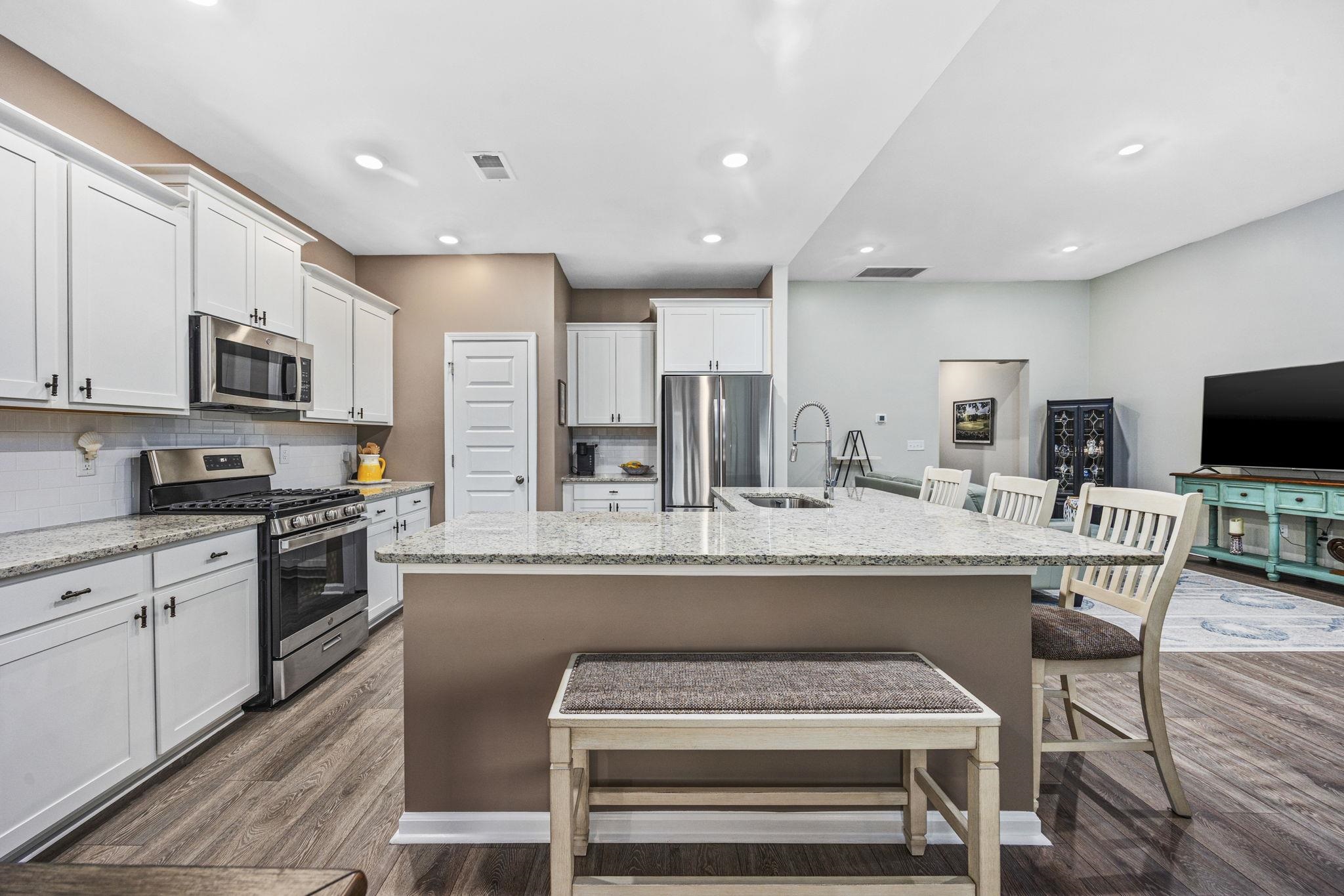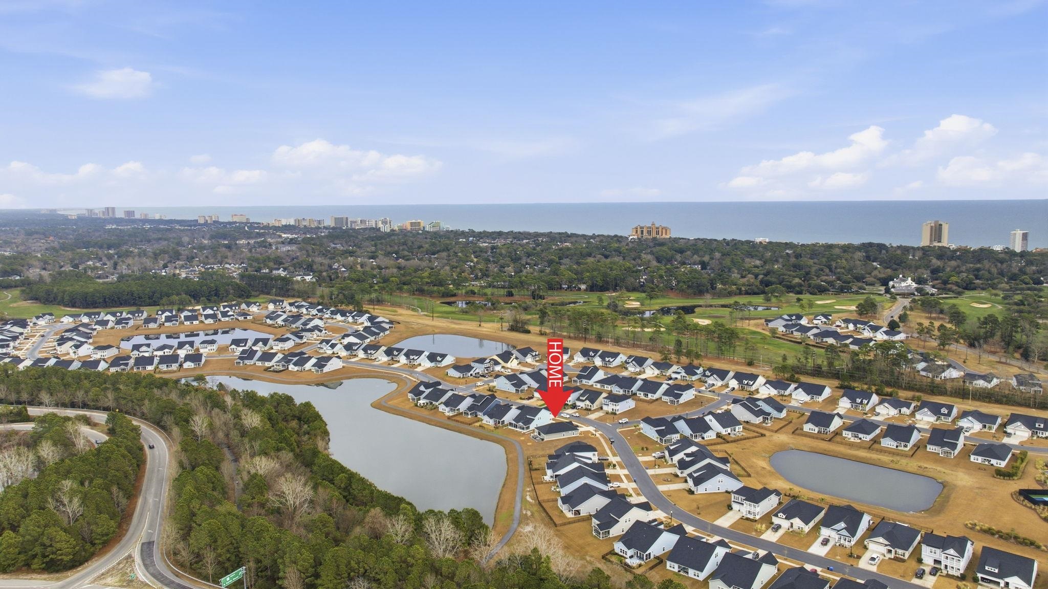 Welcome home to this stunning 3-bedroom, 2-bath lakefront home with a flex room, featuring fresh paint throughout with a stamped concrete patio that adds style and charm to the outdoor space. Perfectly situated on the water, this home offers an attached 2-car garage, professional landscaping, and a warm, inviting interior. Step through the foyer into an open-concept living area filled with natural light and serene lake views. The kitchen is the heart of the home, ideal for everyday living or entertaining, and showcases stainless steel appliances, a gas range, granite countertops, custom tile backsplash, and a breakfast bar with island. The dining area is surrounded by windows and opens directly to the screened back porch, creating a seamless indoor-outdoor living experience. The primary suite features a tray ceiling, peaceful lake views, and an ensuite bath with tile flooring, a walk-in glass shower, and a spacious walk-in closet. The flex room also boasts a tray ceiling and French doors, making it perfect for a home office, den, or guest space. Two additional bedrooms share a separate full bath, and a dedicated laundry area adds convenience. Window treatments convey, along with the washer and dryer and the TV in the flex room. Furniture is negotiable, offering a move-in-ready opportunity. Outside, enjoy the screened back porch with ceiling fan, back patio, and an epoxy-finished garage. A golf cart ride takes you straight to the beach, and residents of this sought-after community enjoy resort-style amenities including a sparkling pool, walking trails, and tennis/pickleball courts. Conveniently located just minutes from the beach, dining, entertainment, and Highway 17.