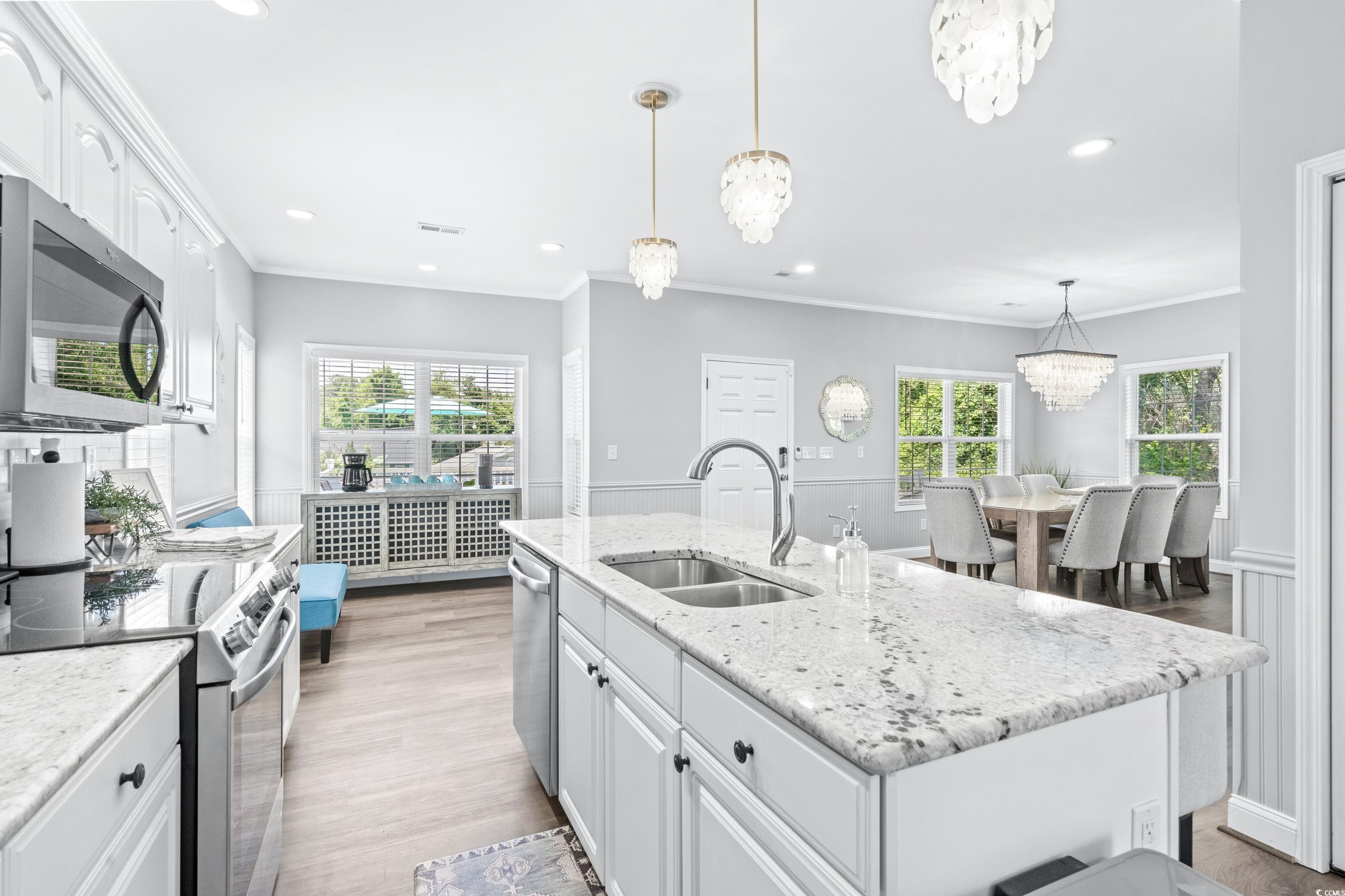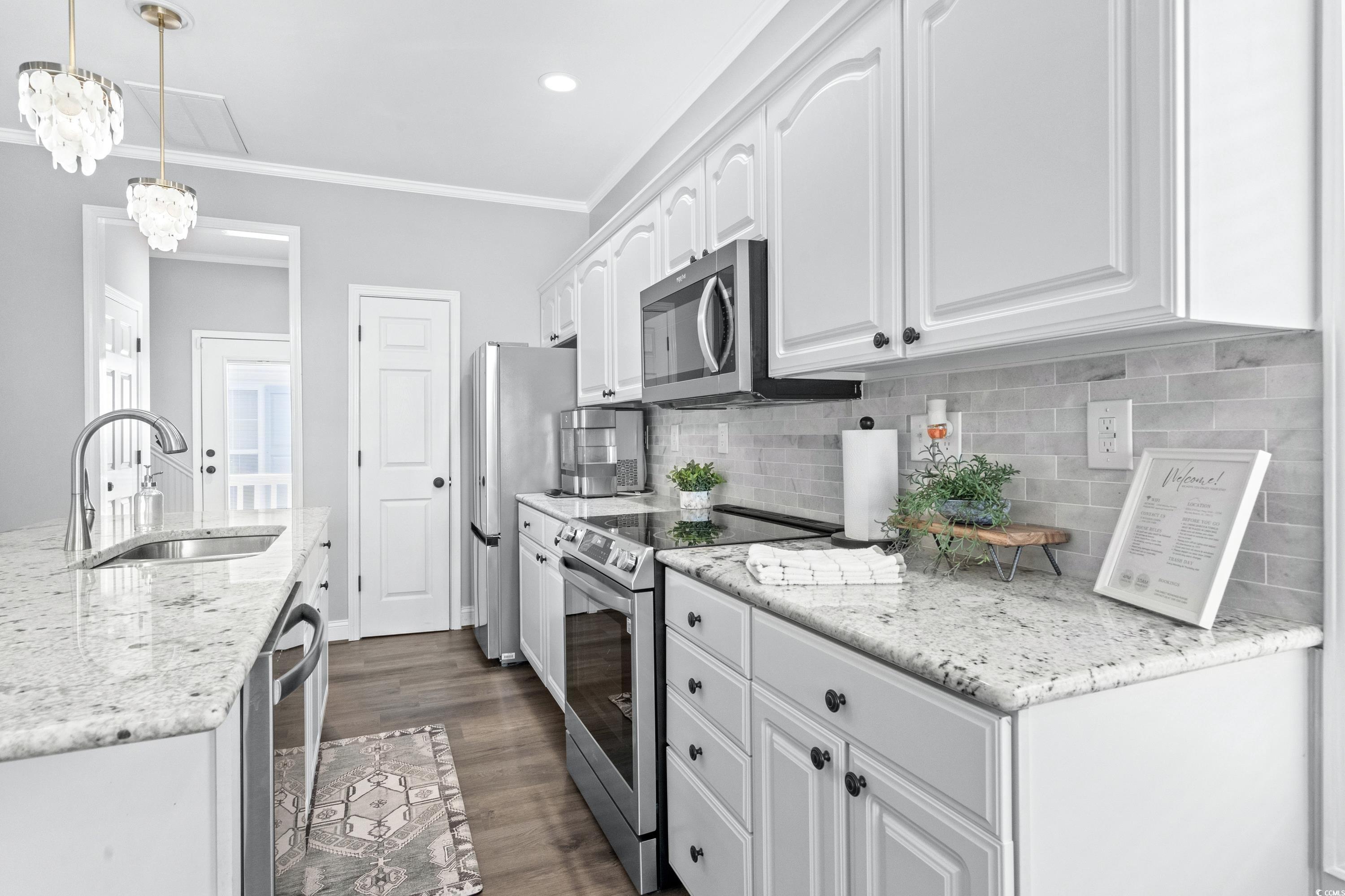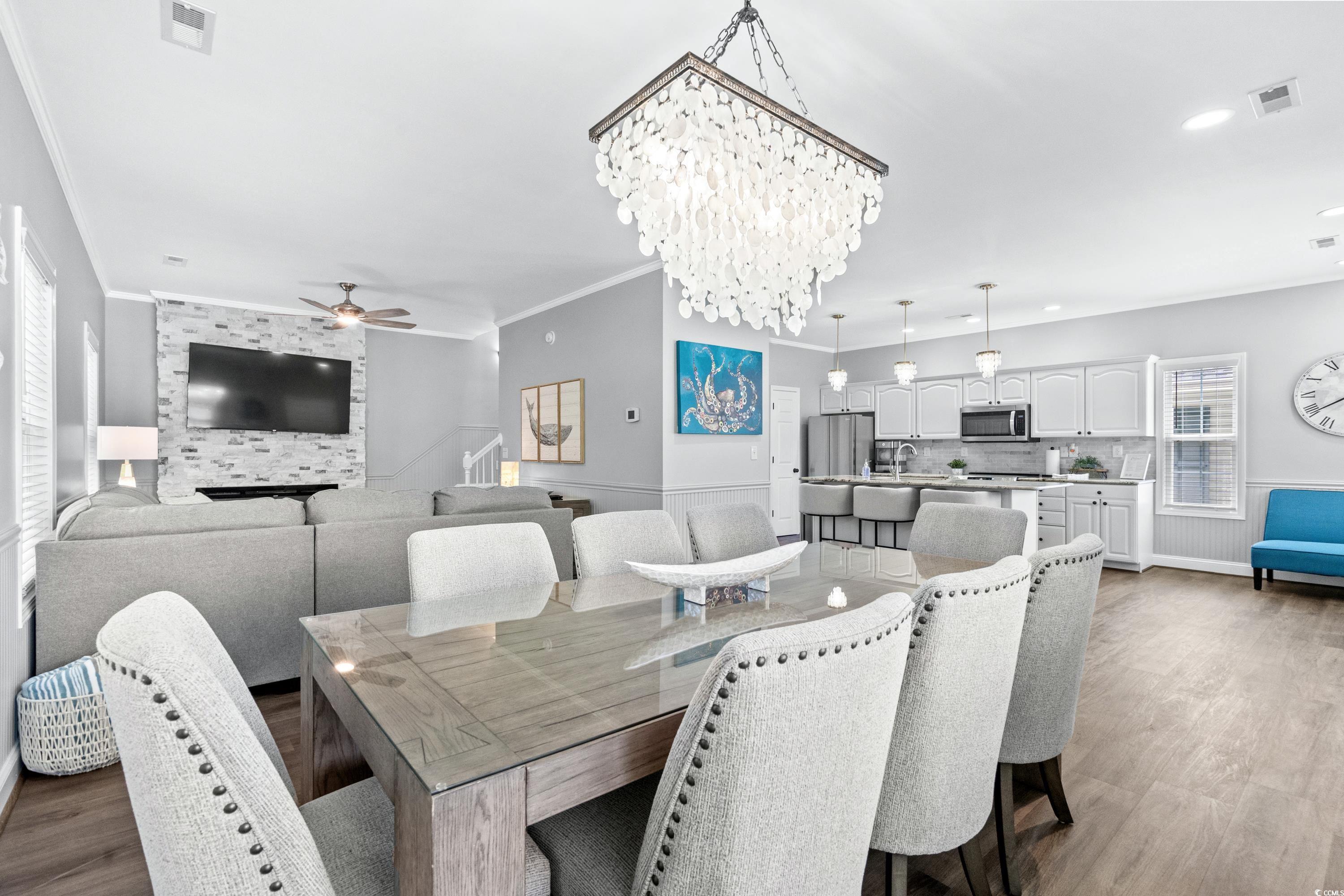 1556 is a beautiful newly remodeled 4BED/ 2.5BATH corner lot home with over-sized deck, & extra parking on a dead-end street. 2 King Beds, 1 Queen Bed, 1 Bunk Room with 3 Twins & 1 Full, & SLEEPS 11. Stepping inside you have an open concept dining, living room, and kitchen, LVP flooring, accent wall with fireplace, kitchen with granite counters, island, tile backsplash, stainless steel appliances and full-size washer/dryer. All bedrooms along with 2 full baths are located upstairs, leaving main lever for entertaining with 1/2 bath. Located close to the ocean and all amazing amenities that Ocean Lakes has to offer.