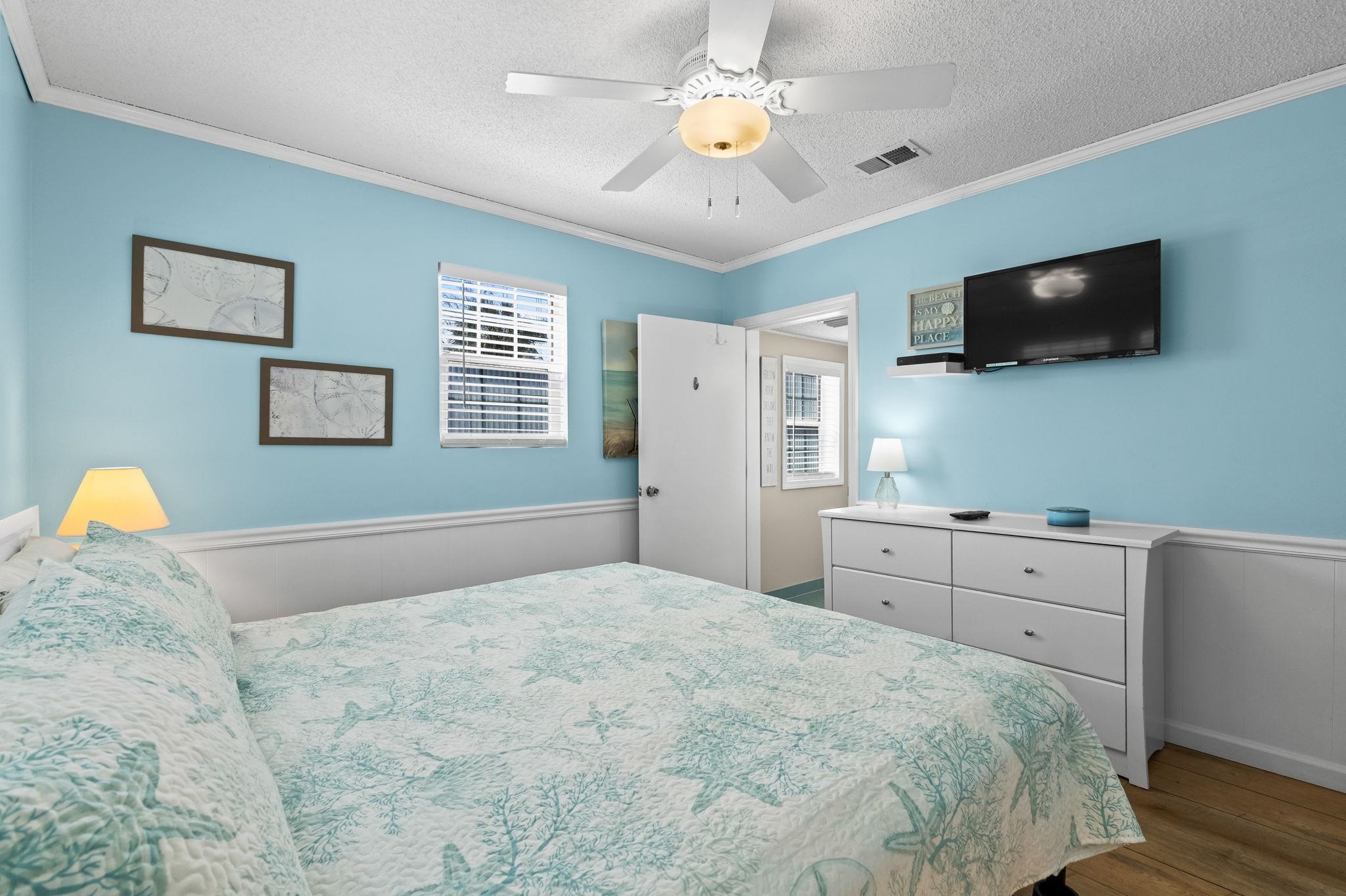 Welcome to 1562, this turnkey 3-bedroom 2 bath home is perfectly situated on a dead-end street, super close to the beautiful Atlantic Ocean and short golf cart ride to all amazing amenities like the waterpark, SandyMart or arcade. Relaxing on the covered front porch will provide morning sun and afternoon shade. East facing side deck is perfect for someone looking to work on their tan! Private fenced back yard is a rare find in Ocean Lakes and 1562 has it! The oversize outside building has storage on the left for a golf cart and your personal belongings. The right side has laundry room with full-size washer/dryer and water heater. Entering inside you have a coastal decorated living room and ceiling fan, to the right is the dining area and fully stocked kitchen. Down the hall you have a bunk room on the left, across the hall is full bath #1 with walk-in tiled shower, further down the hall on the right is bedroom #2 with queen bed, and finally at the end of the hall is the primary bedroom with king adjustable bed, closet, and attached full bath #2. Primary bath recently had the soaker tub reglazed and sealed. Outside shower with hot/cold water. Entire home has been deep cleaned and ready for rental season including pressure washed!. Don't delay, a home in this location and at this price will not last long. Ask agent for rental information. Golf cart is not included but negotiable.