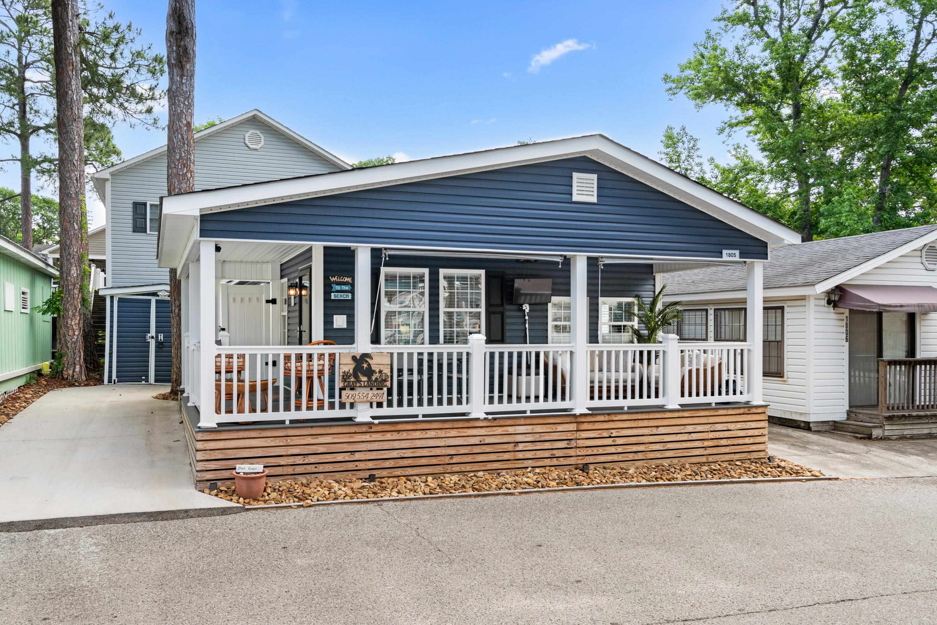Completely remodeled 2 bedroom/1 bath property located in Ocean Lakes. 2023 improvements: New roof, vinyl siding, covered front porch, side porch, composite decking, underpinning, huge outdoor shower, water heater, granite counters, furniture (including outdoor furniture), paint, blinds, appliances including dishwasher and washer/dryer (2025), concrete driveway, lighting, ceiling fans, and décor. This is a must see! Comfort, elegance, and front porch relaxation can be found here at site 1805 located within the gates of the award-winning Ocean Lakes Family Campground. With 2-bedroom, 1 full bathroom and a spacious kitchen with stainless steel appliances, this home is perfectly situated on the south side of the campground. Home offers a large and open living room, a generously proportioned kitchen with plenty of counter and prep space, and a fully updated bathroom with new (2025) washer/dryer. On the exterior of the home, you will be sure to love the large covered front porch, TV, and ceiling fan, a concrete driveway, and a spacious outdoor storage building. As you enter you have a large living room with dining area, off the living room is the updated kitchen with stainless steel appliances, granite counters, tile backsplash, and island. Bedroom #1 has a king size bed and connects to the full bath. Bedroom #2 is off the living room that also connects to the full bath with a sliding barn door. Enjoy relaxing on the huge covered front porch with TV and ceiling fan. Owner has installed sun screens to enjoy the porch and provide shade on those hot summer afternoons. Outside storage building offers plenty of space for a golf cart and additional storage. Home is being sold fully furnished (new washer/dryer is negotiable, golf cart isn't included but may be sold separately). This home is perfectly situated for outdoor entertainment after those long days at the beach. The kitchen offers an island with granite counter. The possibilities of this home are endless! Don't let this one pass-by! Home is conveniently located close to all the amazing amenities Ocean Lakes has to offer! Amenities included are indoor/outdoor pools, lazy river, waterpark, mini-golf, arcade, basketball courts, volleyball courts, and much more! Come check out this property today! All measurements are approximate and not guaranteed. Buyer responsible for verification. "Back on the market at no fault of seller"