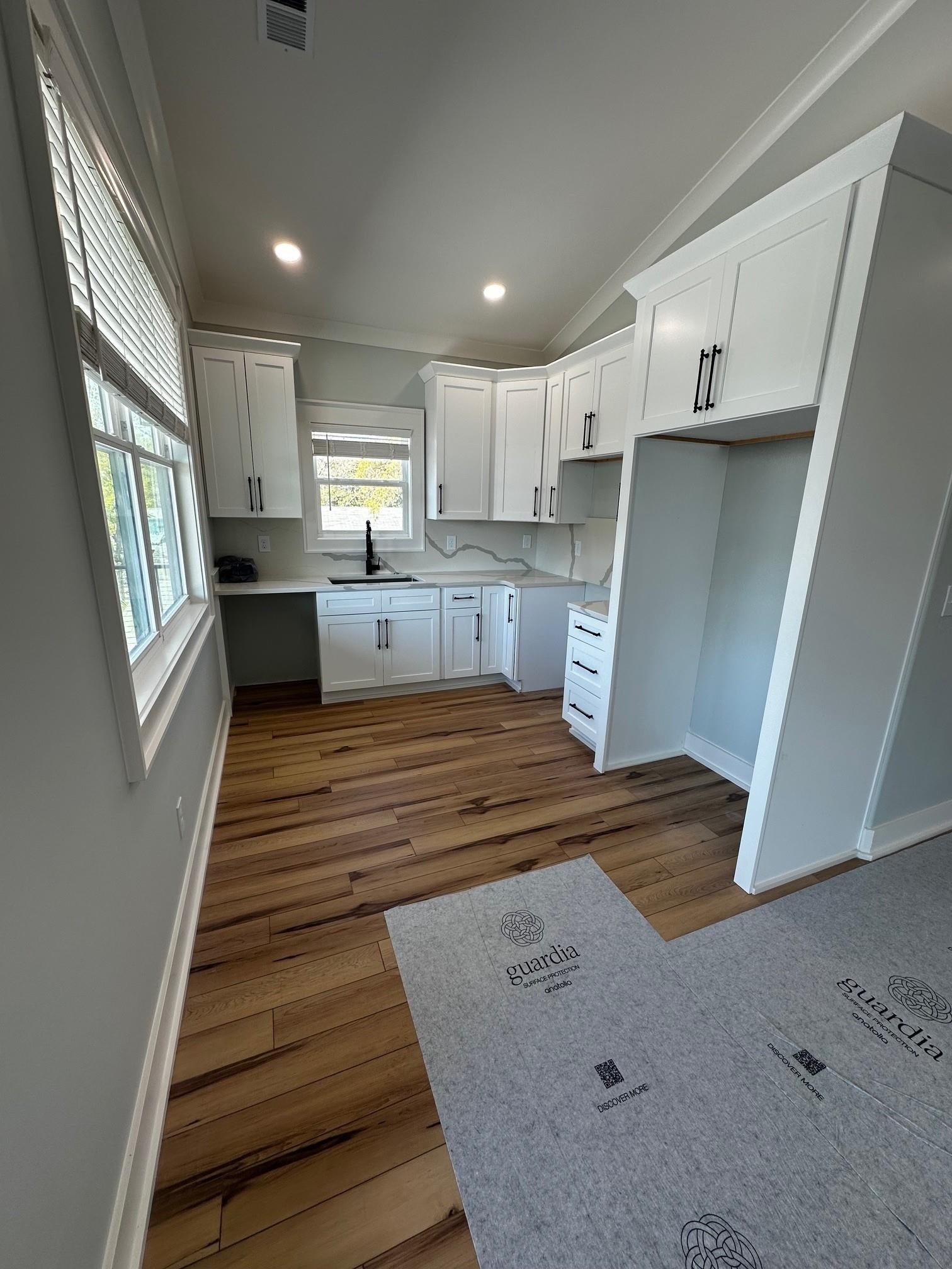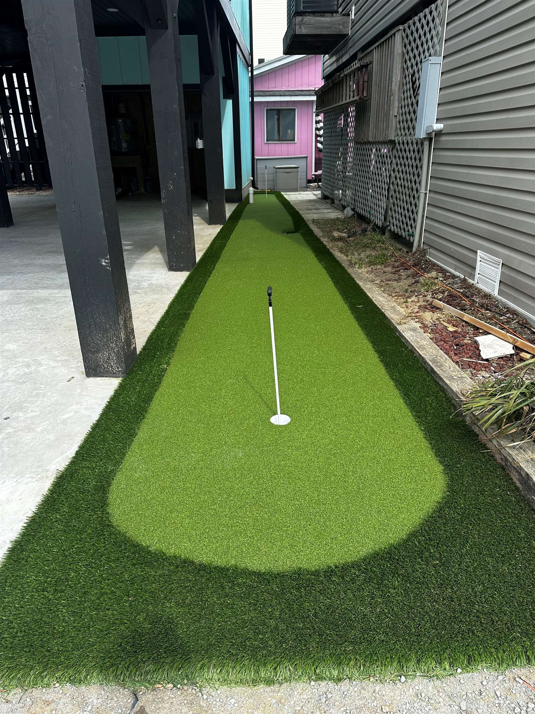 NEW 2026 BUILD, the ONLY raised beach house on the market with black 24 gauge standing seam metal roof, Hardie board and batten siding, custom cabinetry, built in closets, quartz countertops, full quartz backsplash, quartz bathroom vanities, CROWN MOLDING throughout, bullnose finish on drywall corners, spray foam insulated roof deck, black trim windows, trex decking, black aluminum handrails, LVP flooring, custom tile shower in primary bath with glass door, full tile surround in guest bath with soaker tub. Exterior color is Sherwin-Williams SPA SW6765, interior color is Benjamin Moore Healing Aloe 1562, and LVP flooring is Smartcore Lanier Hickory waterproof Luxury Plank Flooring. Stamped concrete, privacy louvers, 144 sqft garage, blacked out piers, Hardie board and batten outdoor shower with hot/cold water, trex ground decking, and MANY other upgrades! SINGLE HOLE PUTTING GREEN WILL BE INSTALLED on east side of home. Across the street from the popular waterpark, Meet-N-eat, and Sandy-Mart. Completion date is just a week away. Professional pictures to come once completed!