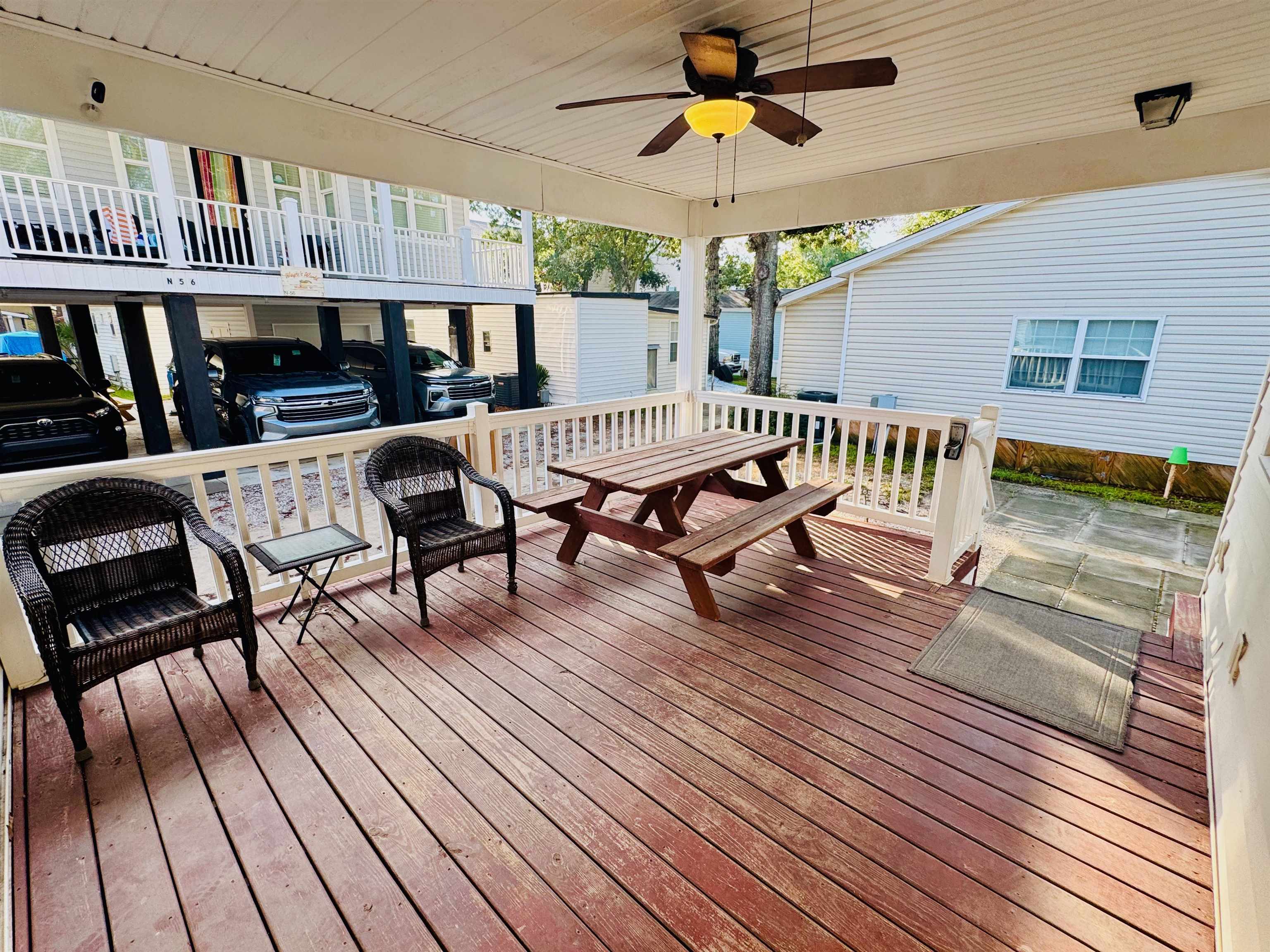 EXCELLENT PRICE ON THIS WELL CONSTRUCTED STICKBUILT, BEACH HOUSE CENTRALLY LOCATED IN THE HEART OF OCEAN LAKES. MUST SEE! Home features an open split floor plan with a large family/living room, spacious kitchen, utility/laundry room and excellent outdoor space with a big covered porch, outdoor shower w/ hot water and a separate water heater and a detached garage to store your golf cart and all your beach gear. Excellent home for full-time beach living or a second family home with great rental potential. Owner financing considered! New HVAC installed in 2024. Metal roof installed in 2016. Sold fully furnished! Now Showing! Measurements are not guaranteed and are the responsibility of buyers and/or their agent. There is no HOA in Ocean Lakes, each home is located on leased land with yearly lease, which is payed in two semiannual payments due in January and July. Amenities abound in Ocean Lakes' gated community and include almost a mile of white sand beach, 24 hour security, 7 fishing lakes, free trash pick-up, free cable TV, weekly community activities, indoor/outdoor swimming pools, large water park/slides, lazy river, kid's splash zone, new dog park, new beachside coffee house and ice cream bar, playgrounds, full size basketball courts, miniature golf, fire pit, corn hole, shuffle board, horseshoes, ping-pong, Sandy's Down-under skatepark, recreation building, arcade, general store, golf cart rentals, Sandys Meet & Eat restaurant and more!