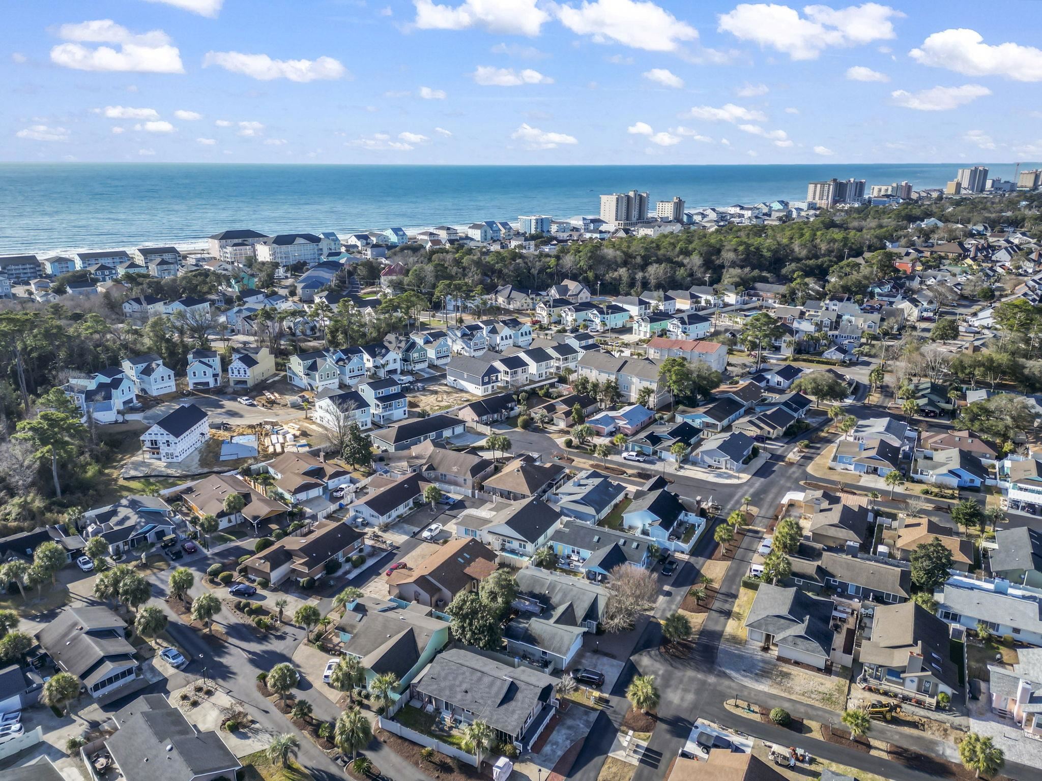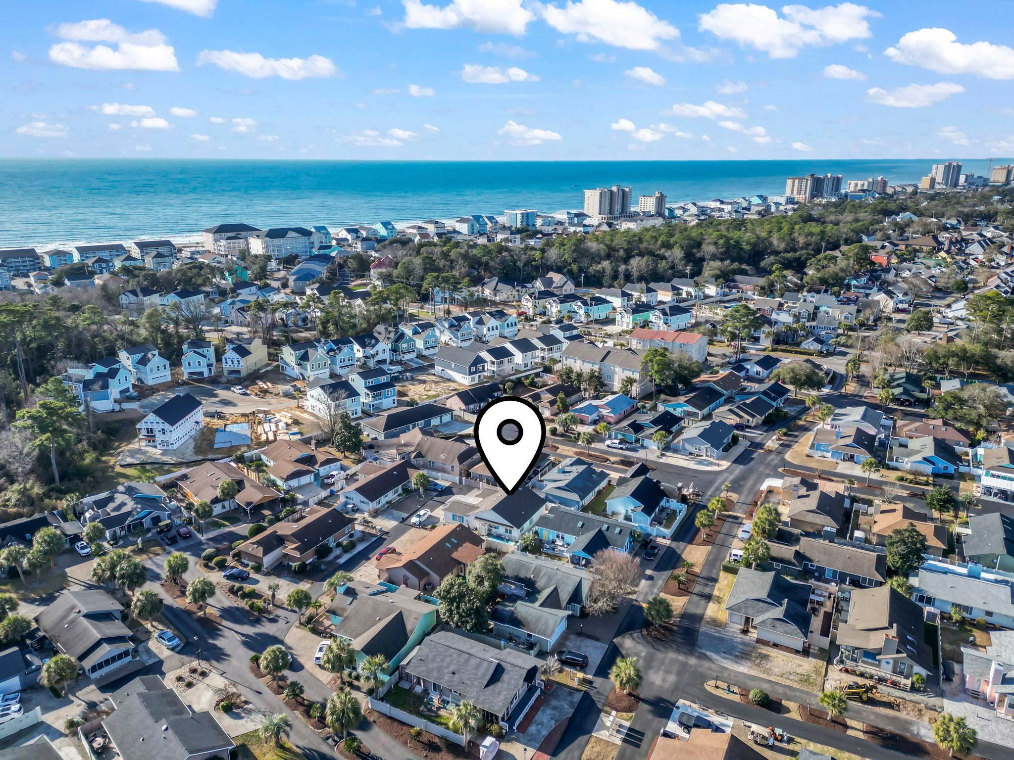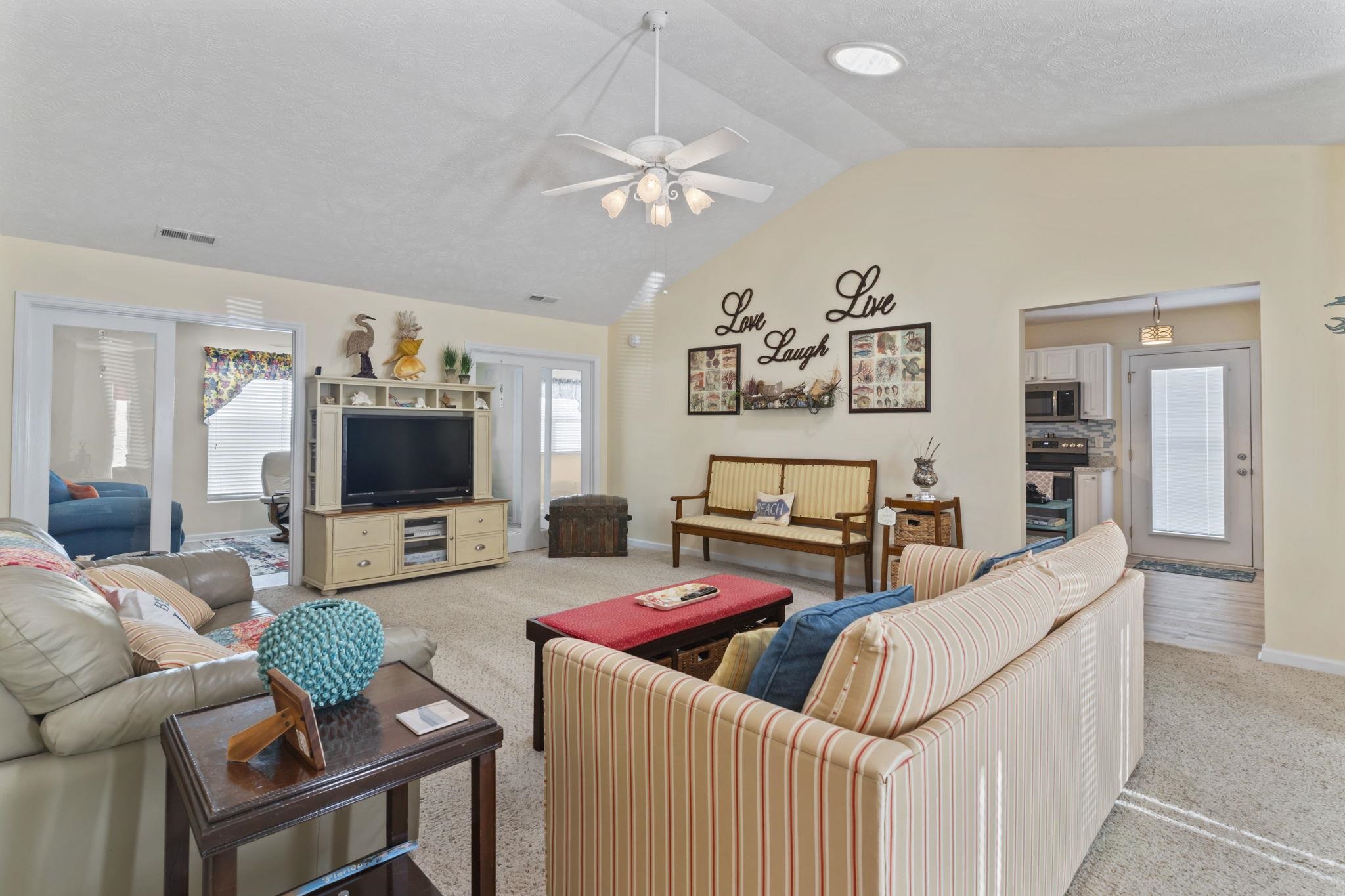 Welcome to 622 Persimmon Ln, a move in ready home in the desirable Ocean Oaks Plantation golf cart community, located less than half a mile from the ocean and just a short walk to the beach. Situated at the end of the street for added privacy and east of Highway 17, this well maintained single story home features 2 bedrooms and 2 bathrooms with an open concept layout, vaulted ceilings, and abundant natural light throughout. Bright LVP flooring installed in 2023 enhances the kitchen, entryway, sunroom, dining area, and bathrooms, creating a fresh coastal feel. The kitchen offers stainless steel appliances, solid surface countertops, a pantry, and ample cabinet space, while the sunroom provides flexible space for a third bedroom, home office, or additional living area. The exterior features durable HardiePlank siding, a one car garage for added storage and convenience, and outdoor living highlighted by a large concrete patio with an enclosed outdoor shower, perfect after a day at the beach. Conveniently located near Barefoot Landing, shopping, dining, golf courses, and entertainment, this property is ideal as a primary residence, second home, or investment opportunity, with major updates including a roof replaced in 2022, hot water heater in 2023, HVAC system in 2018, and exterior paint completed in 2025.
