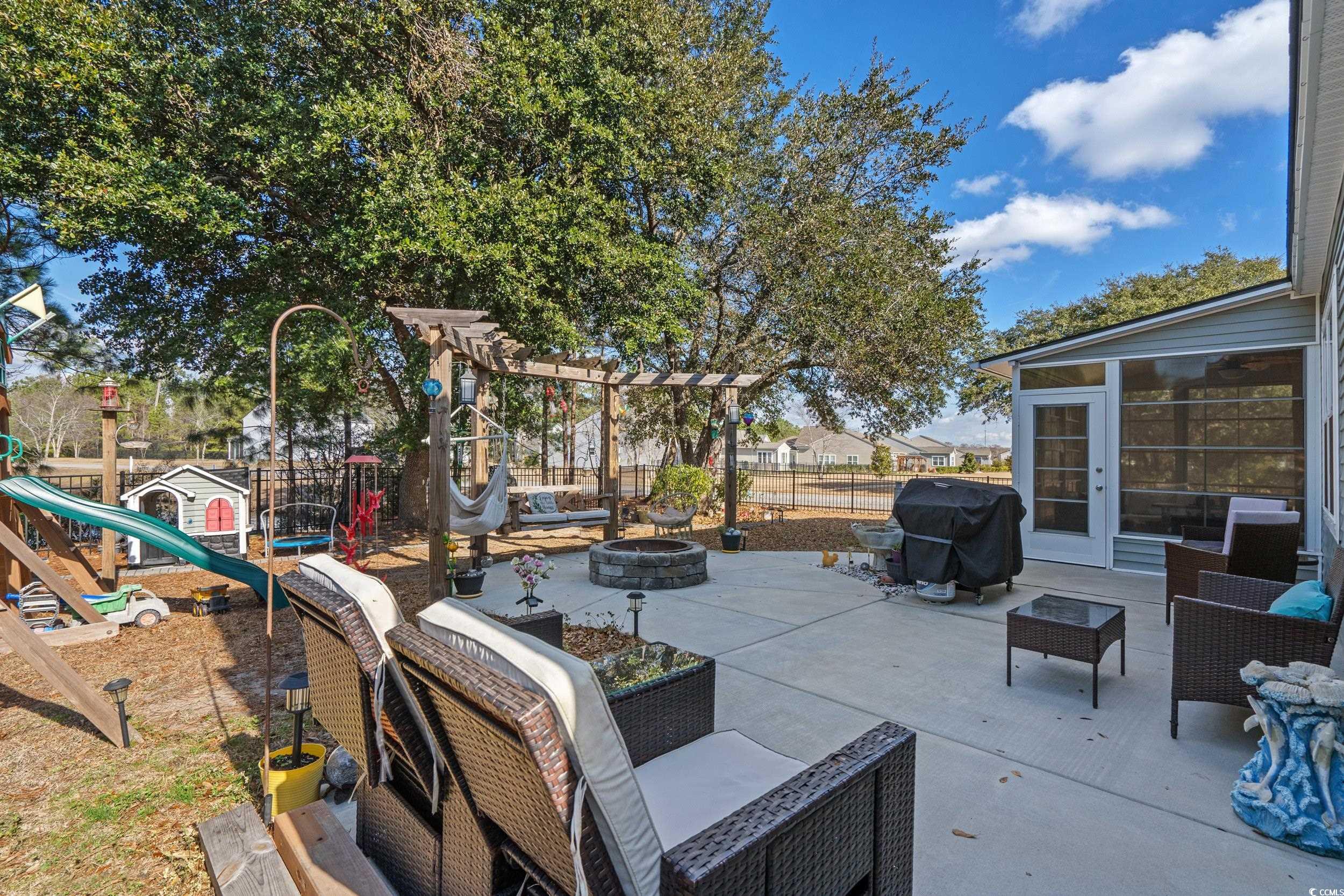 Welcome to this stunning two-story, 5-bedroom, 3-bath home, perfectly located just 15 minutes from the beach! Built in 2018 and lovingly maintained by its original owner, this property offers modern comfort and exceptional outdoor living. Step inside to an open-concept floor plan featuring a bright, airy living space and a gourmet kitchen complete with stainless steel appliances. Upstairs, you’ll find a large loft perfect for a media room, playroom, or second living area. Enjoy the outdoors year-round in the Carolina room enclosed in 2023. Owners added on a spacious back patio featuring a built-in fire ring and pergola with attaching swings—all overlooking a peaceful pond lot with 4-foot black fencing for privacy and safety. The garage includes a built-in work area, perfect for hobbies or storage. Located in a desirable community offering a pool and ample guest parking, this home truly has it all!