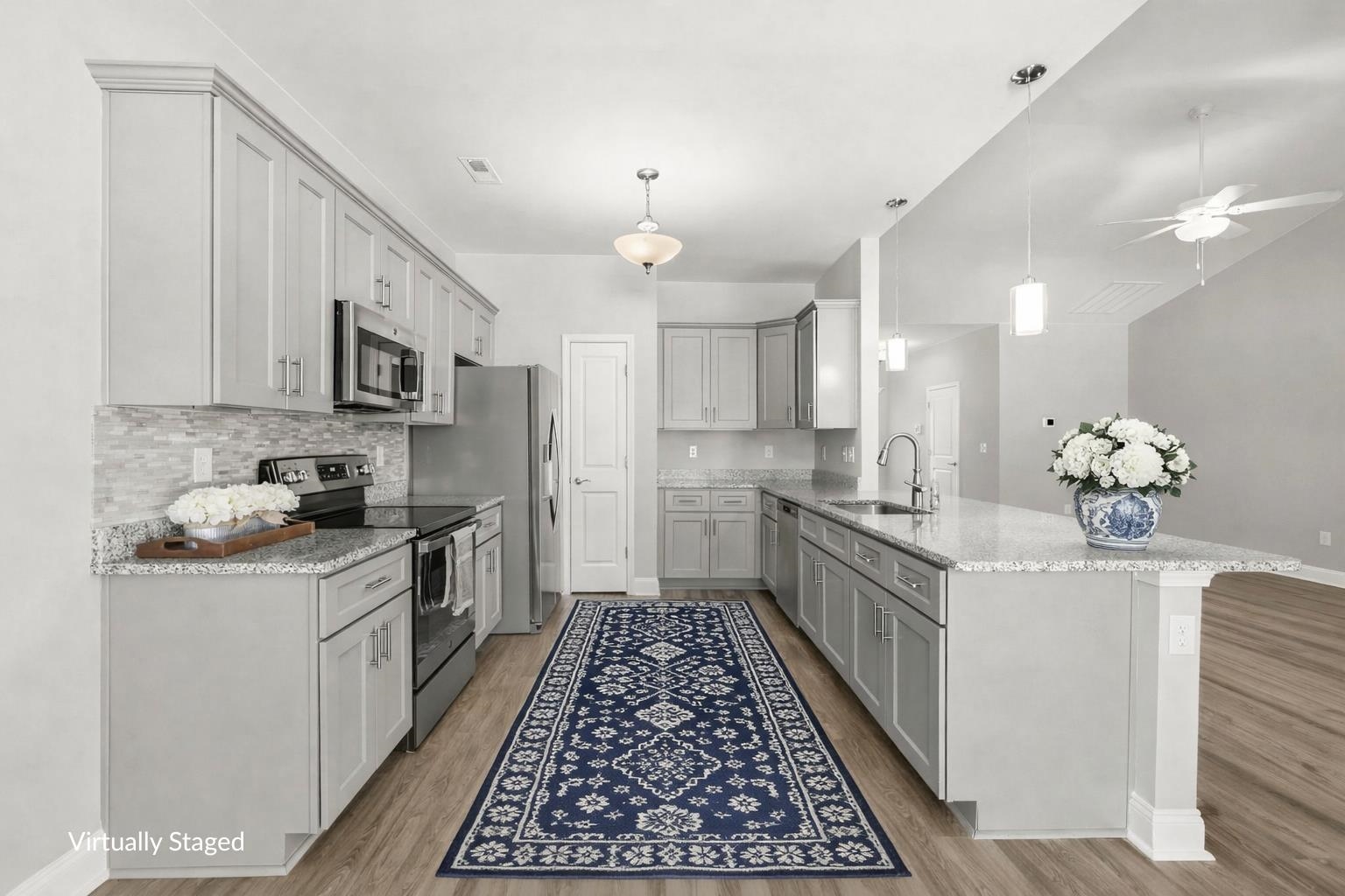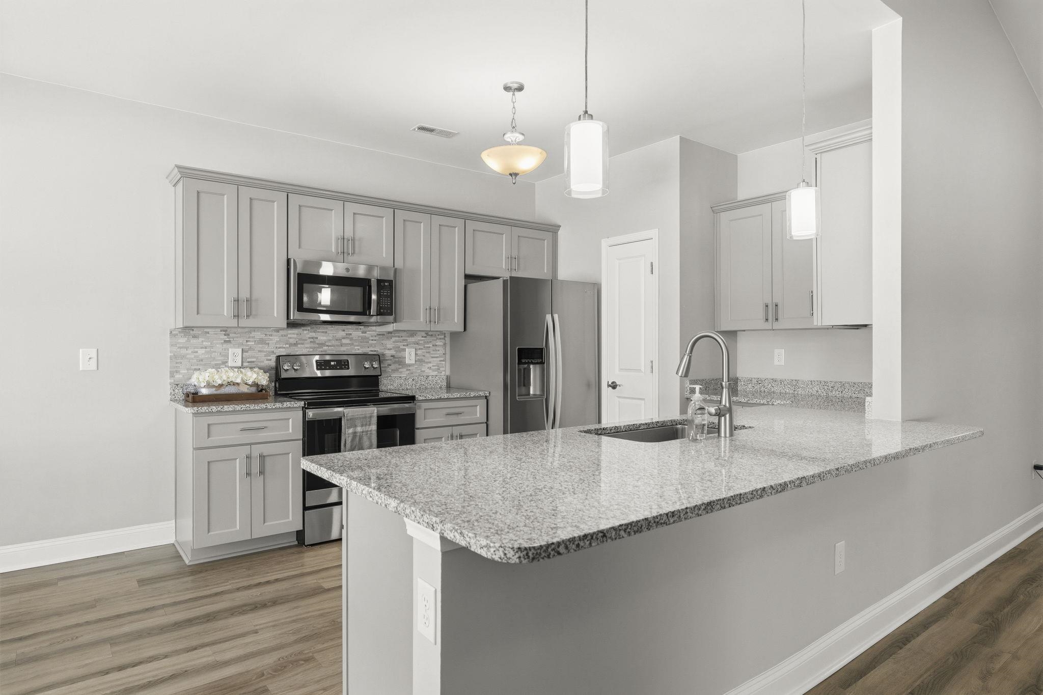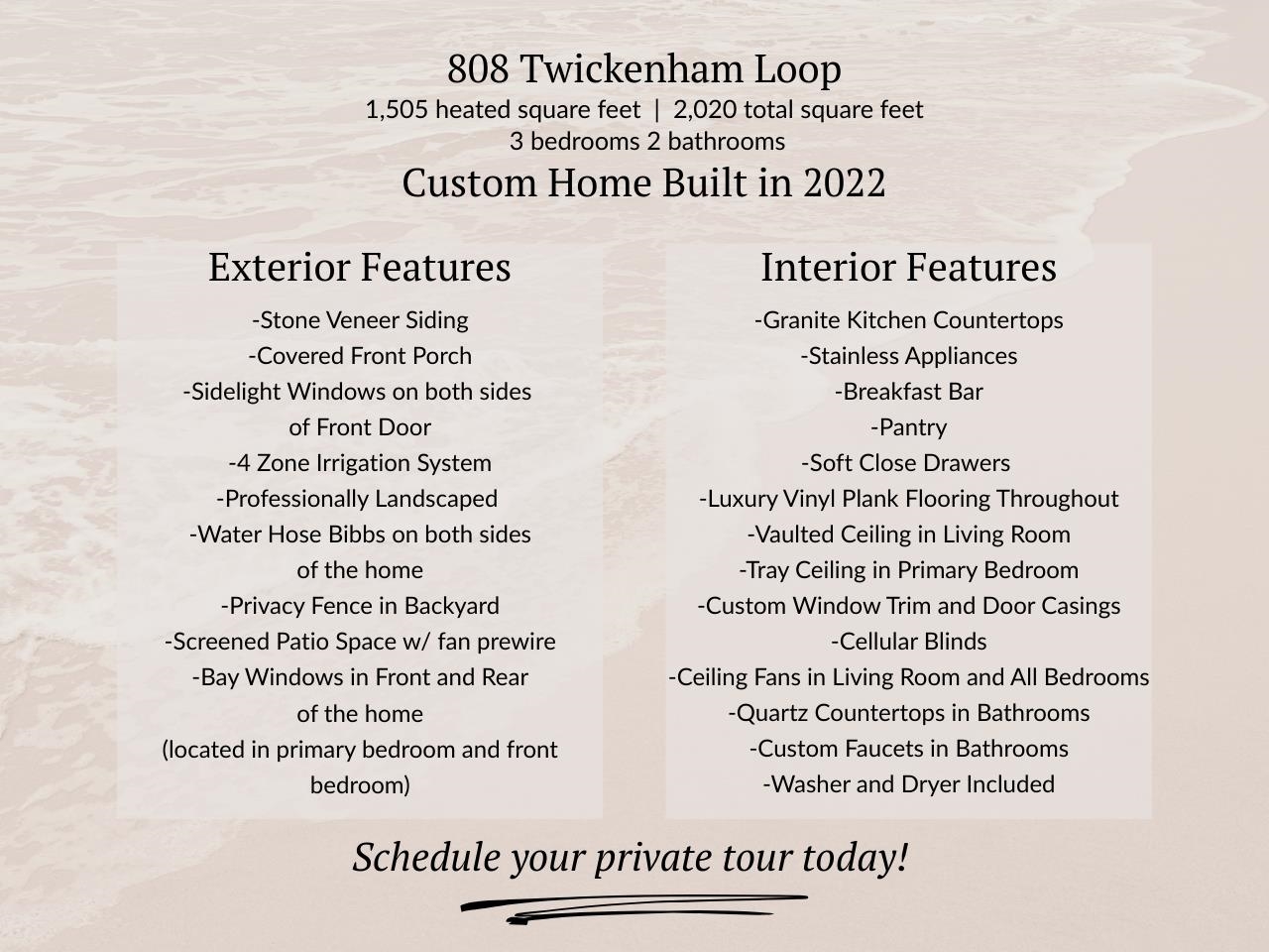 *Fully completed neighborhood- Move right in* This home comes with everything- just bring furniture* Newly built in 2022, this custom home offers the winning combination of fresh construction, refined design, and easy living. What makes it even better' In fifteen minutes, you're at the beach! The home welcomes you with professional landscaping, a stone veneer exterior, covered front porch, and front door framed by sidelight windows, while a four-zone irrigation system, privacy-fenced backyard, screened patio, and water hose bibbs on both sides add everyday functionality. Bay windows in both the front and rear of the home fill the interiors with natural light and add architectural character. Inside, the open-concept layout is anchored by a vaulted living room ceiling and durable luxury vinyl plank flooring that flows seamlessly throughout. The kitchen is designed for both entertaining and ease, featuring Luna Pearl granite countertops, stainless steel appliances, a breakfast bar, pantry, and soft-close cabinetry. Custom window trim, detailed door casings, and cellular blinds elevate the finishes, while ceiling fans in the living room and every bedroom enhance year-round comfort. The primary suite offers a tray ceiling, walk-in closet, and the primary bath offers a step-in shower, complete with quartz countertops and custom faucets. The additional bathroom carries the same elevated finishes. The included washer and dryer make move-in effortless. The spacious two-car garage interior is finished with paint and baseboards. Every detail has been considered, from the craftsmanship to the conveniences, creating a home that feels both polished and practical, inside and out. The home is positioned a few minutes' drive to highway 22 exit, or take highway 90, allowing you to pivot anywhere you need to go easily. Excellent restaurants are minutes away such as Bistro 90, Saltwater Grill and a Dunkin, as well as everything the Greater Myrtle Beach area has to offer! *Some photos are virtually staged for visualization purposes.