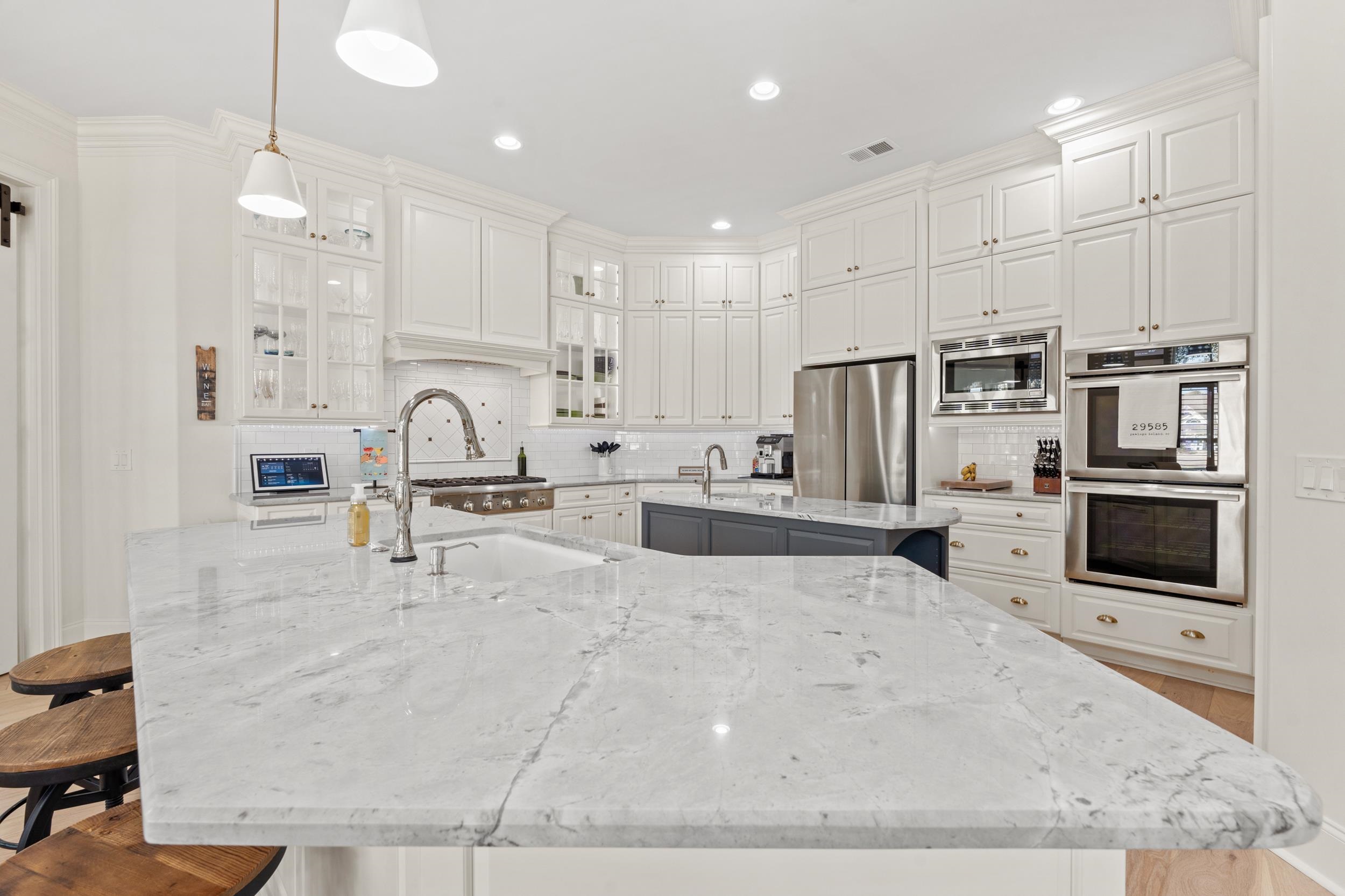 Welcome to 820 Preservation Circle! Tucked behind the gates of The Reserve in Pawleys Island, this property delivers an elevated lifestyle defined by comfort, quality, and understated sophistication. From the moment you arrive, the home makes an impression. A wide, welcoming front porch stretches across the façade, accented by gabled rooflines, stone detailing, and carriage-style garage doors that nod to classic craftsmanship. Step inside to discover airy 10-foot ceilings, substantial trim work, and architectural ceilings that add depth and dimension to the main living spaces. The entryway transitions seamlessly into an elegant dining room adorned with tray ceilings and plantation shutters, while the great room offers generous proportions, abundant sunlight, and calming water views. Recently refreshed with new hardwood flooring throughout the main level and fresh interior paint, the home feels crisp, current, and move-in ready. At the heart of the home, the kitchen is both functional and striking. Custom cabinetry extends to the ceiling and is complemented by updated hardware, gleaming granite surfaces, and two oversized islands designed for gathering. A Thermador six-burner gas cooktop with custom hood and double ovens anchors the space, while a bright breakfast area captures peaceful lake views. The walk-in butler’s pantry has been recently enhanced with custom built-ins and a butcher block workspace, offering exceptional organization. A Brizo touch-activated faucet adds a sleek, modern convenience. Just off the kitchen, sliding barn doors reveal a relaxed keeping room with a floor-to-ceiling stone fireplace—an inviting retreat for casual evenings or morning coffee. The primary suite on the main level is a private haven. This space is highlighted by the beautifully renovated custom primary closet that offers boutique-style organization with extensive built-ins, double hanging sections, dedicated shoe shelving, and abundant drawer storage. A spacious center island with additional cabinetry, light wood flooring, and natural light create a bright, functional, and luxurious dressing space. Also, the recently added 2nd walk-in closet—along with custom closet systems—provides even more storage and organization. The spa-inspired bath boasts dual vanities, soaking tub, and a beautifully tiled walk-in shower. A quiet home office with bay-style windows sits just outside the primary suite and offers a refined and comfortable workspace. Two additional first-floor guest suites each include private baths, walk-in closets, and upgraded closet systems, making them ideal for extended family or visitors. The laundry and mudroom features distinctive checkerboard tile flooring, abundant cabinetry, and work surfaces that make daily routines effortless. Upstairs, a spacious flex room with a wet bar & wine refrigerator creates a perfect media or game space. Two additional bedrooms share a well-appointed bath with a tiled walk-in shower, and substantial attic storage—including a climate-controlled walk-in area—adds versatility. The outdoor living spaces are equally appealing. The outdoor patio overlooks a fenced backyard and tranquil lake setting, providing a scenic backdrop for entertaining or unwinding. The oversized garage includes a newly installed EV car charger, garage door keypad, and ample room for recreational gear. Above, a framed and floored workshop or storage area offers exciting possibilities for customization. Life in The Reserve offers access to a renowned Greg Norman-designed golf course, a private marina and waterfront dining at the Harbor Club, and exclusive beach access through Litchfield by the Sea, complete with tennis courts, clubhouse, and scenic walking trails. Optional memberships allow homeowners to tailor their experience. This is coastal Carolina living at its finest!