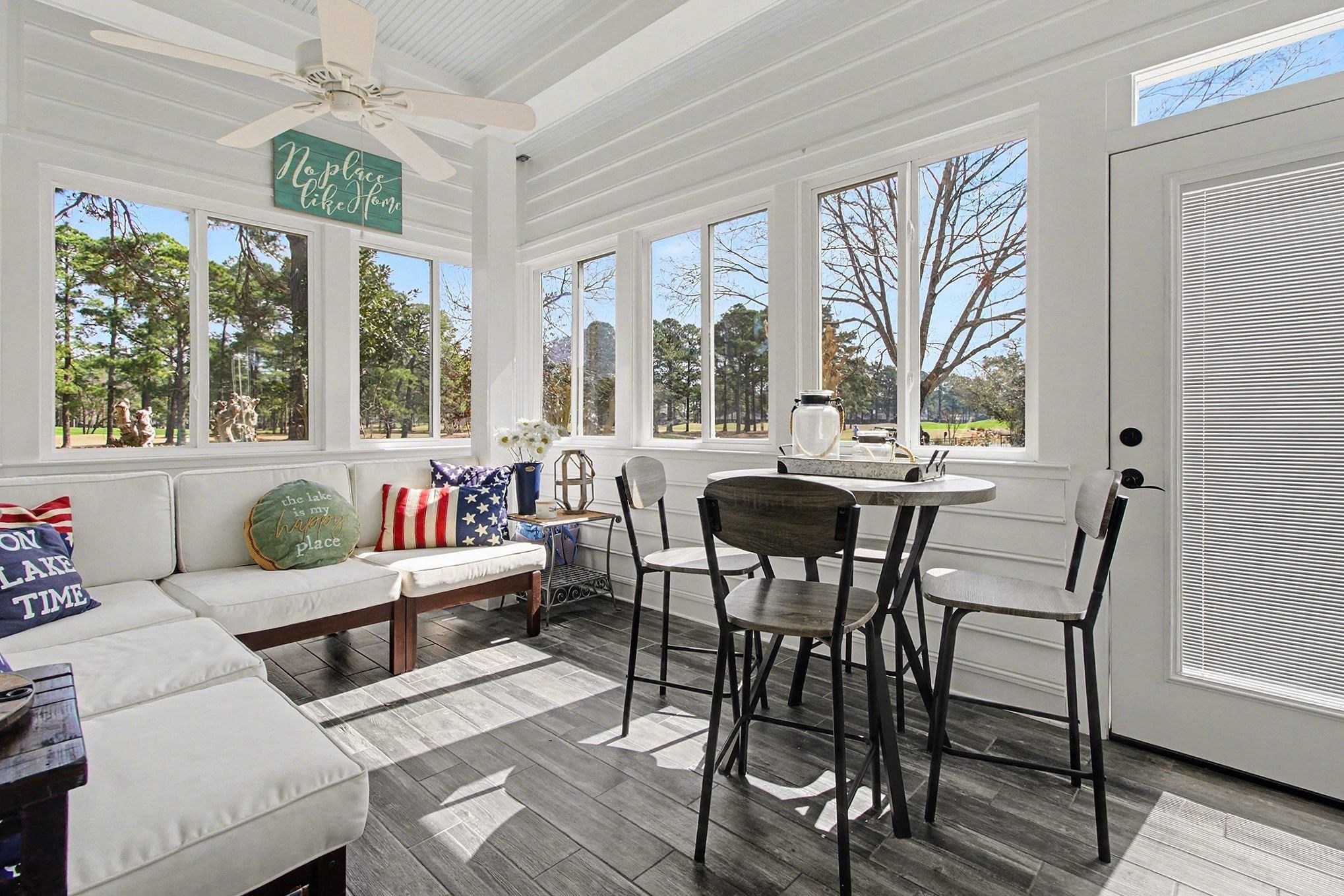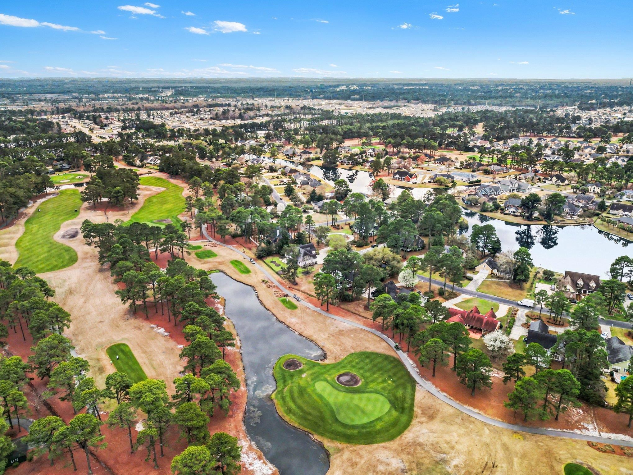 Elegantly maintained all-brick executive home on a spacious, private lot overlooking the Burning Ridge Golf Course in desirable Forest Lake Estates, offering refined living and spectacular views. This light-filled residence features four bedrooms and three-and-a-half baths, including two private primary suites—one on the main level with walk-in closets and a spa-like bath with whirlpool tub, dual-head shower, and dual vanities—and a second suite upstairs for guests or extended family. Main-level living is defined by 10' ceilings, a dramatic living room with recessed niche, bamboo flooring, a cozy gas-fireplace office/flex room, and a vaulted family room with expansive windows framing fairway views that flow to a chef’s kitchen, bright Carolina room, and screened porch for seamless indoor-outdoor entertaining. Upstairs, a generous recreation/media room with built-in bookshelves and wet bar opens to a Trex deck overlooking the course, while additional bedrooms and flexible spaces accommodate a home office or fitness room. Practical amenities include abundant storage, first-floor laundry, a side-entry three-car garage with high ceilings, propane hookup for grilling, and recent Pella windows; ideally located near Conway Hospital, Coastal Carolina University, excellent schools, shopping, dining, and historic downtown Conway—this move-in-ready home is a rare opportunity.