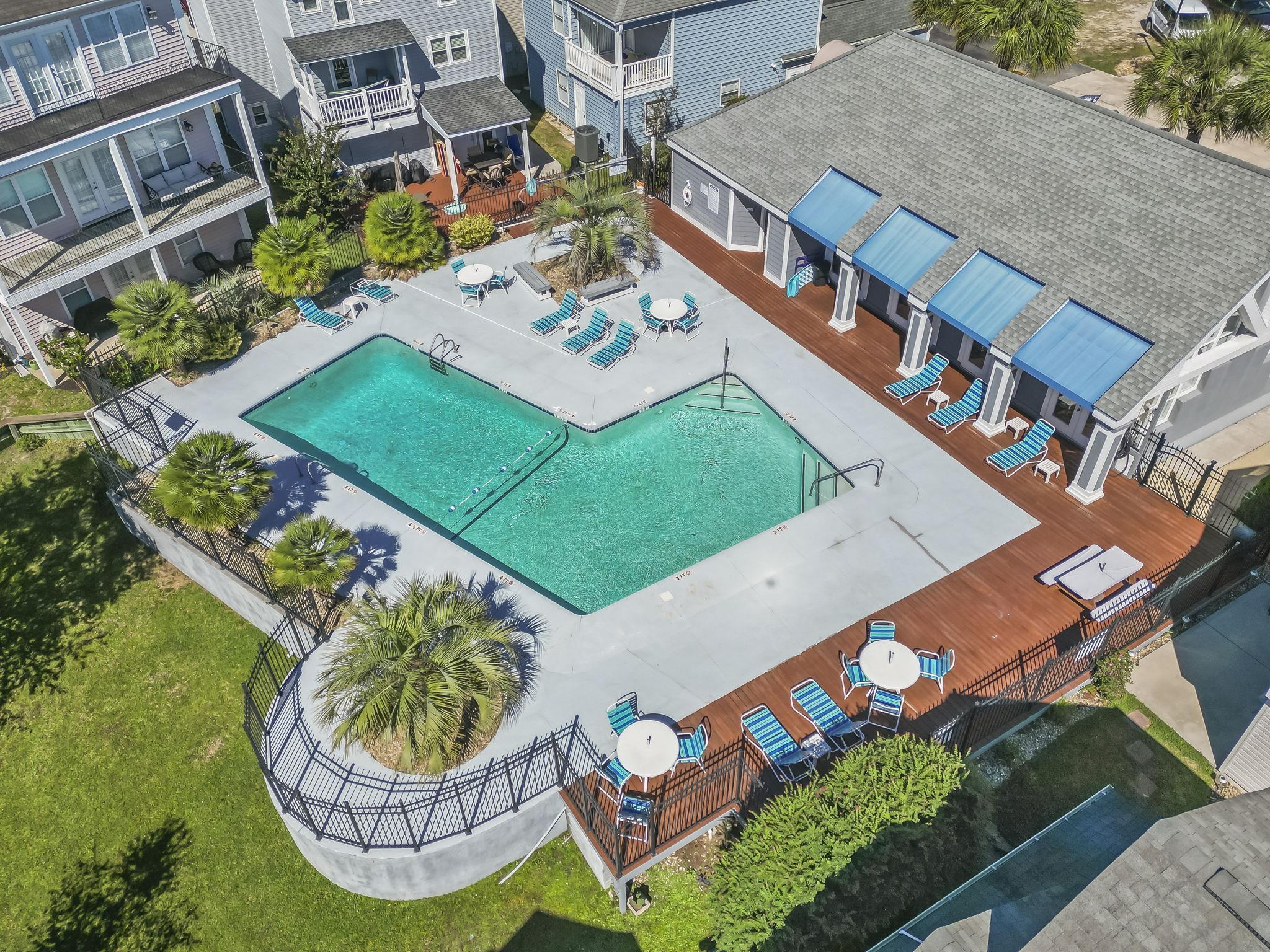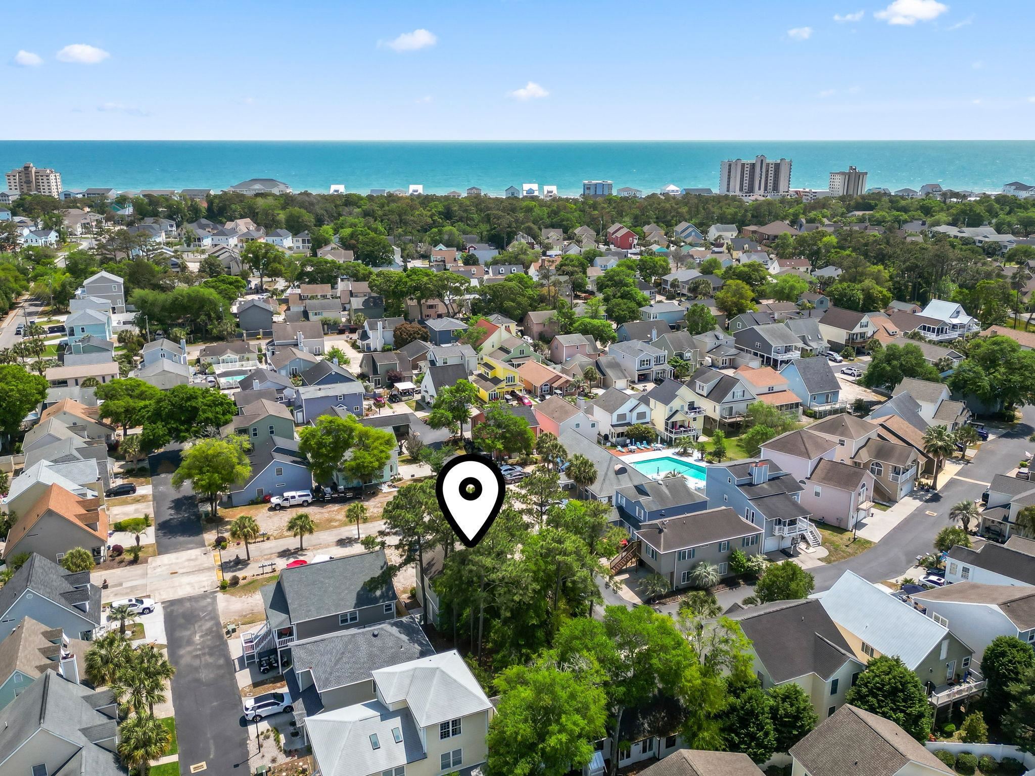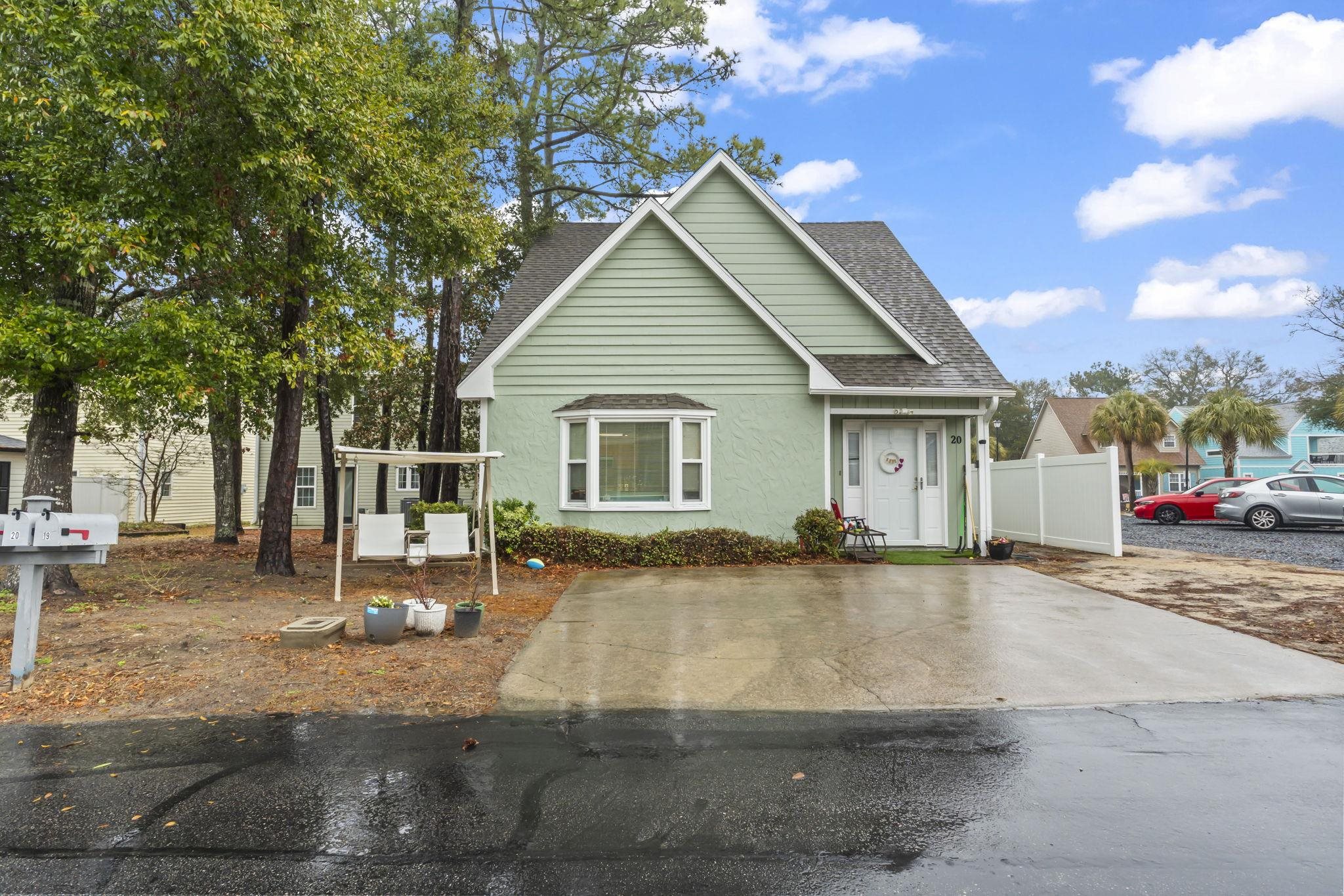 Nestled in the desirable Palmwood Estates community of North Myrtle Beach, this charming coastal retreat offers the perfect blend of comfort and convenience just a short walk or golf cart ride from the ocean. The well-maintained interior features a spacious, sun-drenched layout highlighted by soaring vaulted ceilings and durable laminate flooring throughout the main living areas. At the heart of the home, the kitchen is equipped with solid wood cabinetry, and a breakfast bar, that overlooks the open concept living and dining spaces. The primary suite is a private haven located on the first floor, with its own direct access to the fenced-in patio and an en-suite bathroom complete with dual sinks and a separate bath area. Upstairs, two additional bedrooms provide versatile space for family, guests, or a dedicated home office. Outdoor living is a breeze on the private side patio, which offers plenty of room for grilling and relaxation. Located in a low-HOA, golf cart-friendly neighborhood with a community pool, this home is an ideal choice for a primary residence, a relaxing second home, or an attractive rental property.