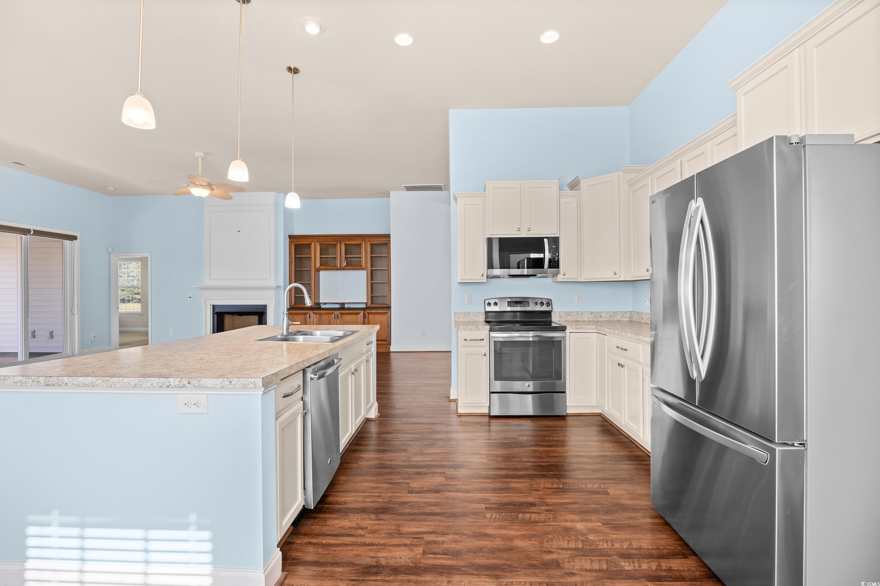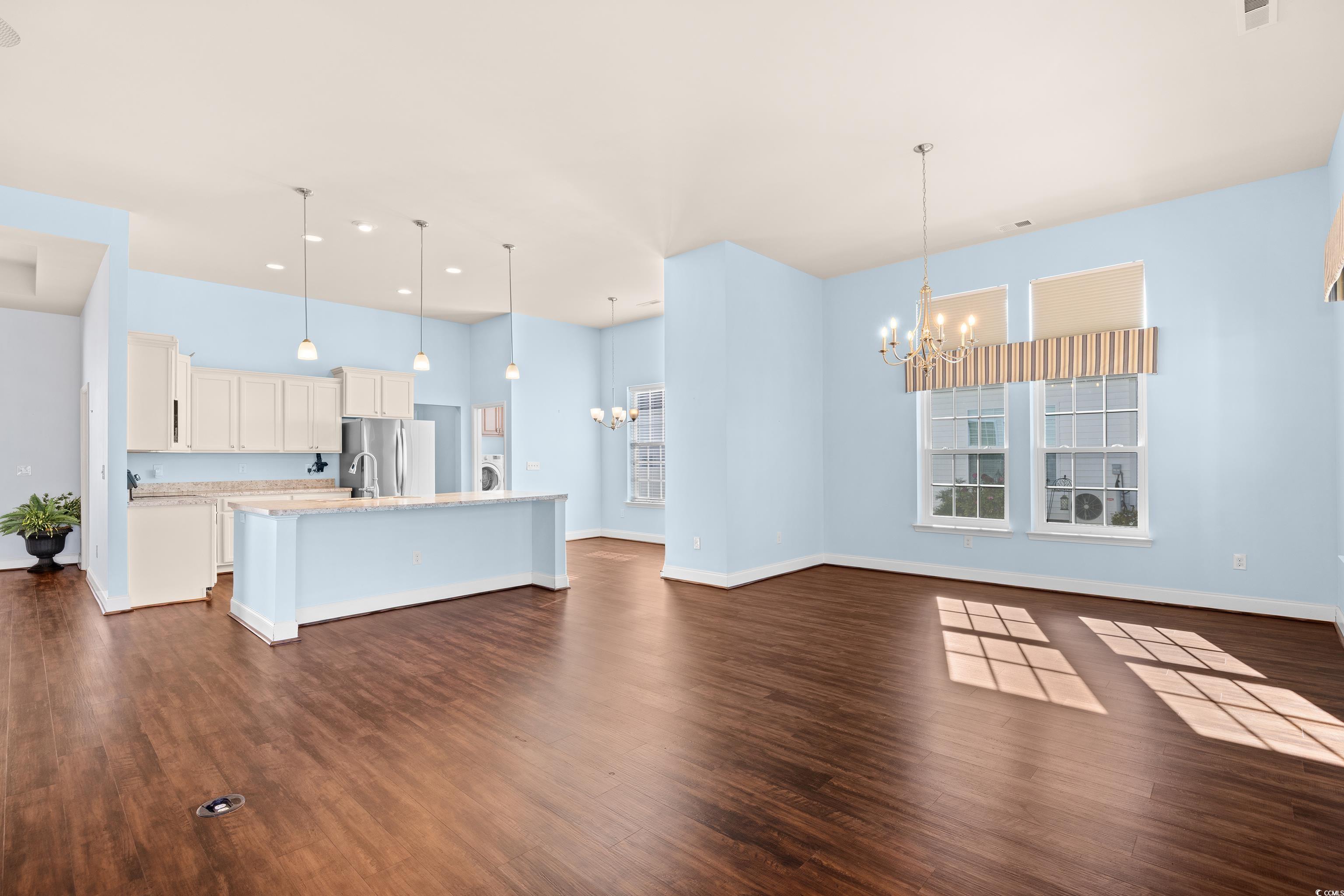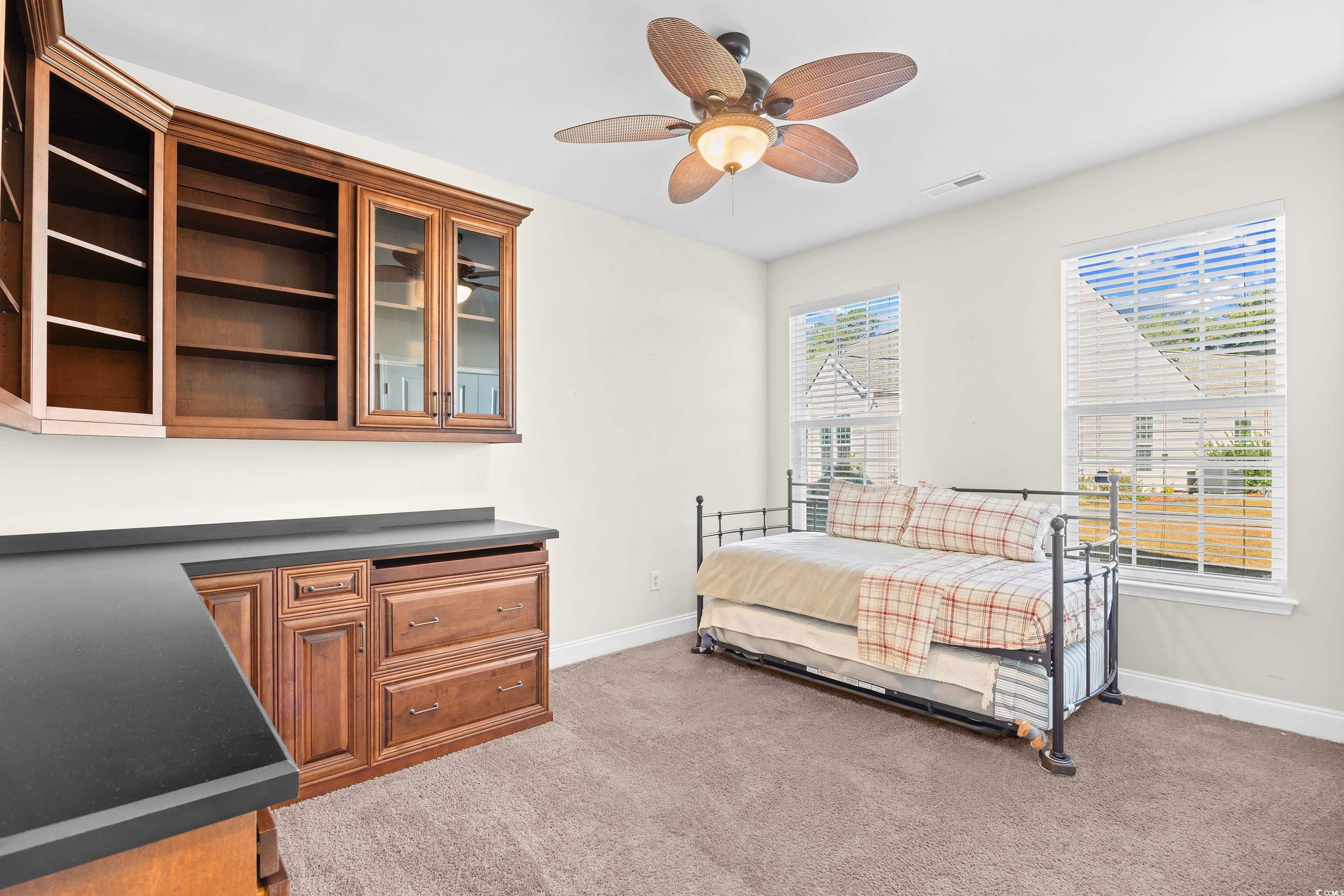 Come live the easy life at the beach! You will fall in love with this coastal oasis overlooking the serene pond with water fountains. This wonderful single-level home is located in Carolina Crossing, which is a unique community, because the grass is maintained for you! The exterior has stone accents with double french doors that lead into a foyer with a tray ceiling. This remarkable home has a grand entry with an open floor plan and high ceilings. The living room has a fireplace and custom built-ins were added for extra storage. This is the perfect spot to snuggle with your loved ones. High quality laminate flooring was added throughout the main living area and you will notice that this lovely home has several windows which bring in an abundance of natural light. You can see the moon reflect on the water while you are enjoying a fabulous meal in the spacious dining area. The kitchen has an island bar with a pantry, stainless steel appliances, and a breakfast nook. Stylish cabinets and countertops have been added. There is a full-size laundry room and the washer/dryer will stay. The huge owner's suite has a tray ceiling, a big walk-in closet, and the attached bath features dual sinks. There are two large guest rooms and one of them has a built-in office area. The oversized sliding glass door in the living room opens up to a screened-in porch with tile and a vaulted ceiling. There's a big patio where you can grill out with friends while you watch the sunset over the water. There is a powder room inside for guests and a mud room area off the garage. This fantastic home has been very well-maintained by the original owners. A new HVAC system was installed in 2019, several windows were replaced in 2024, and the underground propane tank was replaced in 2019. The garage has a retractable screen door, which creates a comfortable place for everyone to sit back and relax. The yard has mature trees with beautiful curbscaping and river rocks. There is an outdoor pool with a clubhouse, which has social activities such as yoga and card games. This community is located about 15 minutes to Cherry Grove Beach, so you can live the Coastal Lifestyle! There are several delicious restaurants with live music, top-notch golf courses, and plenty of great fishing spots! This is truly a must-see and you don't want to miss out! Schedule your showing today and don't forget to check out the virtual tour! Square footage is approximate and not guaranteed. Buyer is responsible for verification. Some photos and videos have been virtually modified.
