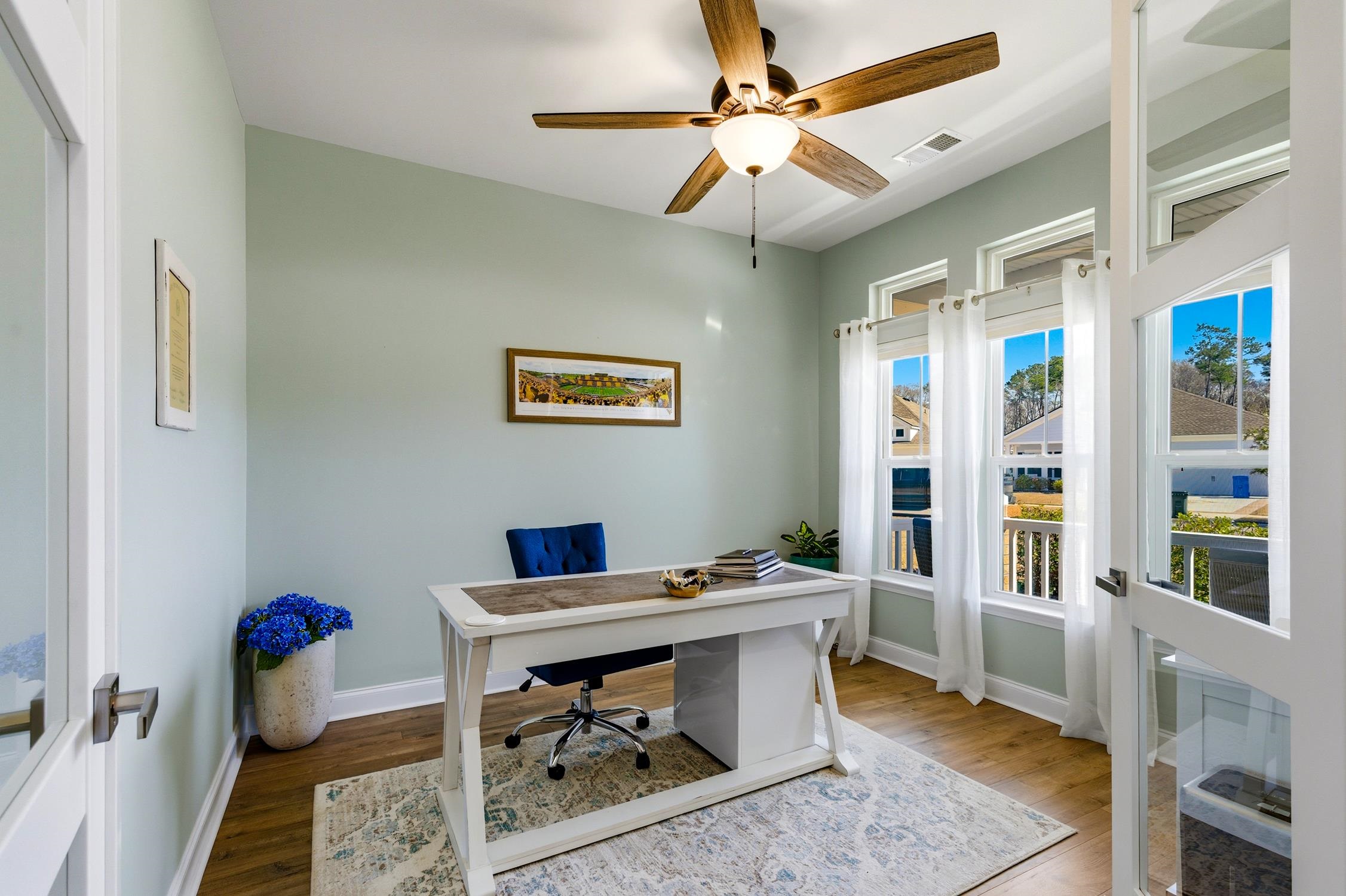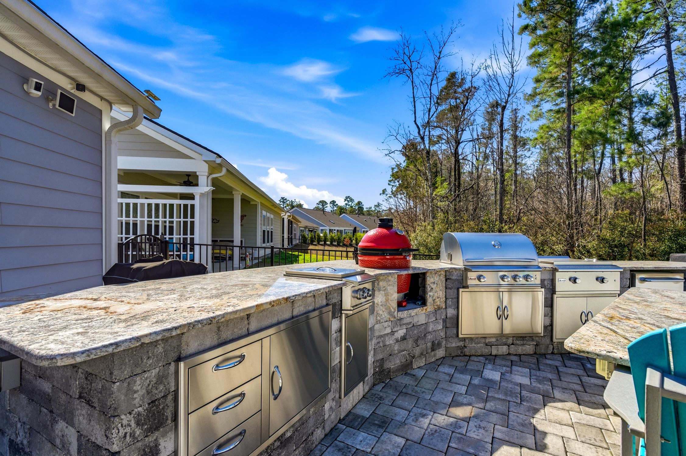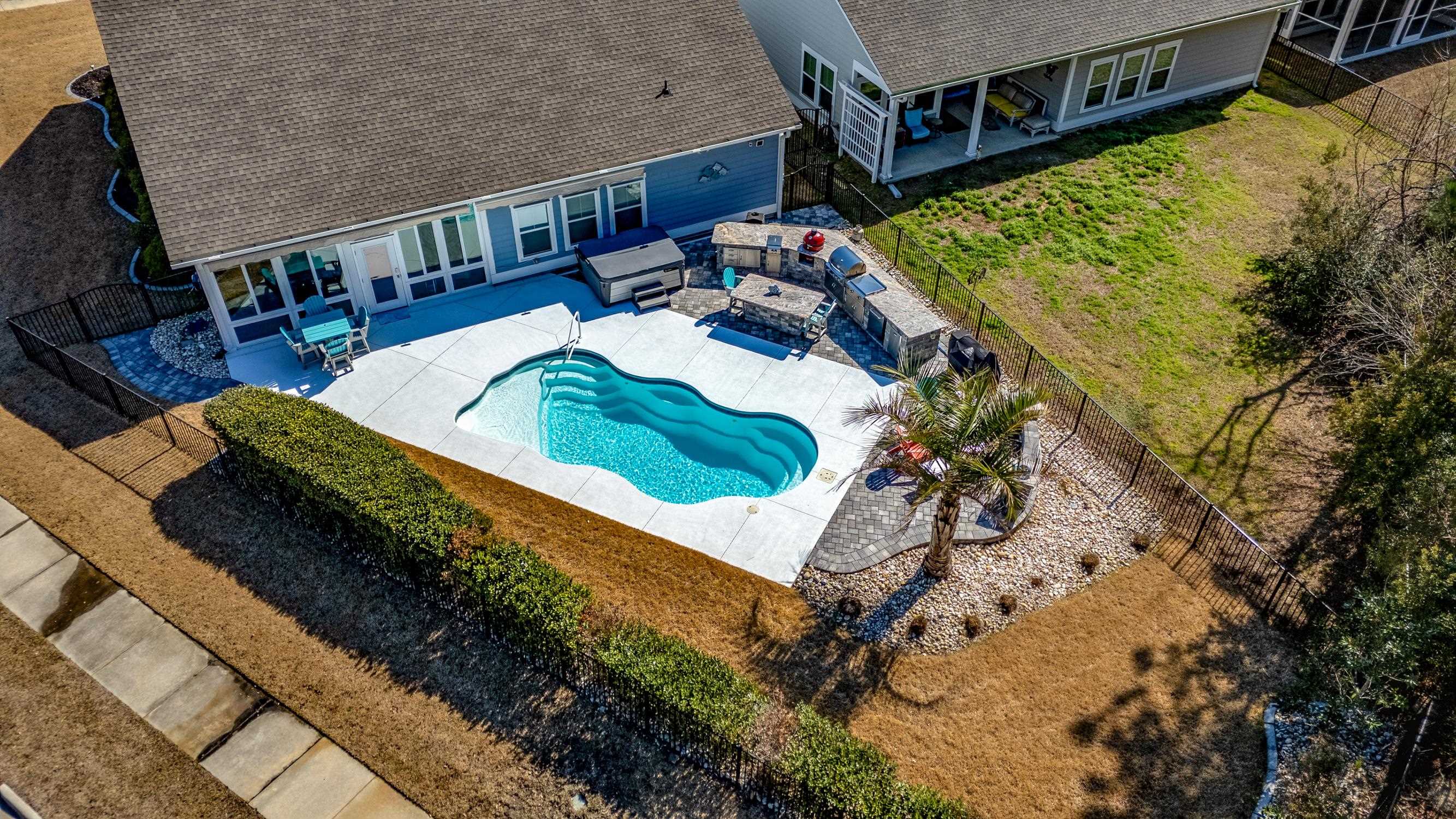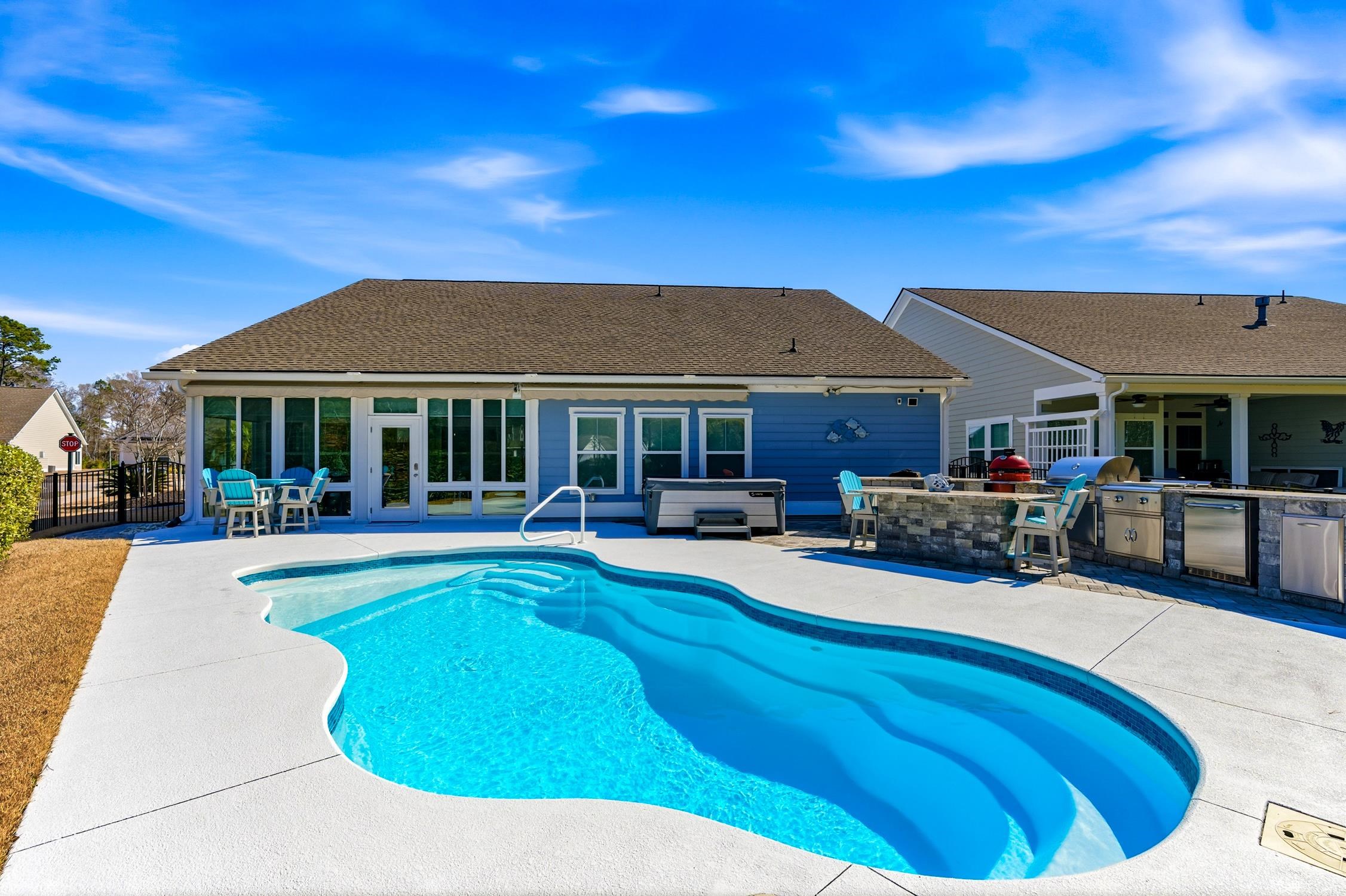 Welcome to this exceptional home in the highly popular Market Common, where coastal luxury meets everyday convenience, just a golf cart ride to the ocean, dining, shopping, and parks. Situated on a large corner lot, this property is thoughtfully upgraded for comfort, style, and entertaining, both indoors and out. Step outside to your private backyard oasis featuring an in-ground swimming pool, hot tub, fire pit, and a fully equipped outdoor kitchen with hard gas line, perfect for hosting year-round. Two remote-controlled awnings provide shade at the touch of a button, while hurricane shutters and a whole-house generator offer peace of mind. Inside, enjoy a bright Carolina room, custom window shades, and closets with custom built-ins throughout. The garage is a standout with an epoxy floor, custom shelving, and a mini-split system, making it ideal for a workshop, gym, or climate-controlled storage. This home truly has it all, luxury upgrades, smart features, and the unbeatable Market Common lifestyle.