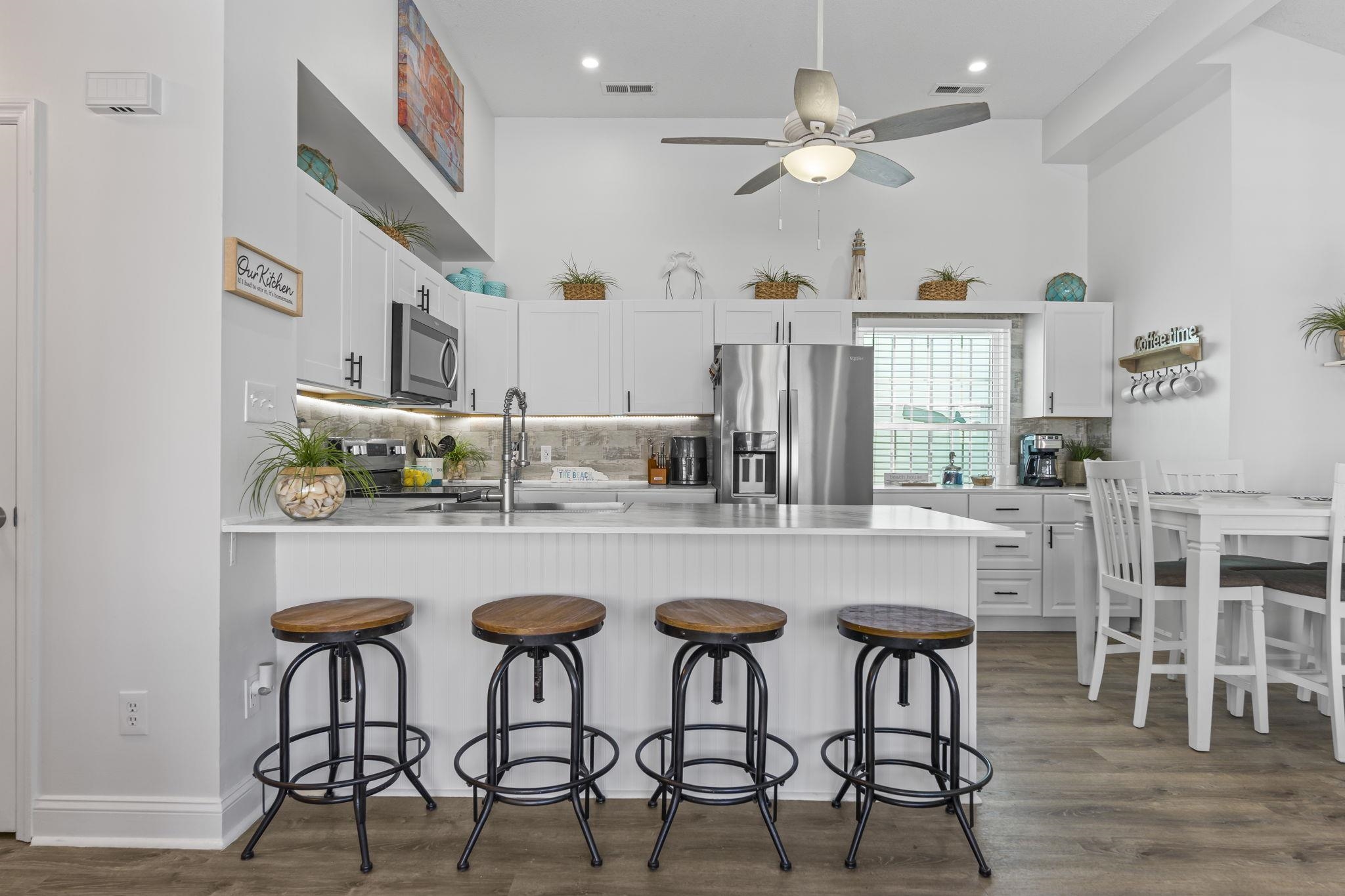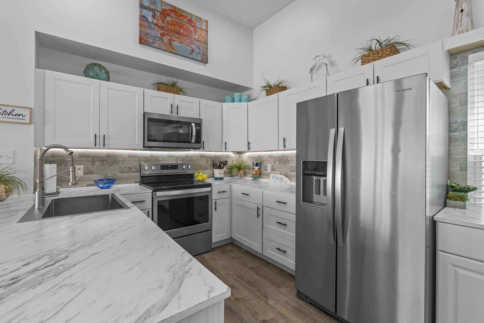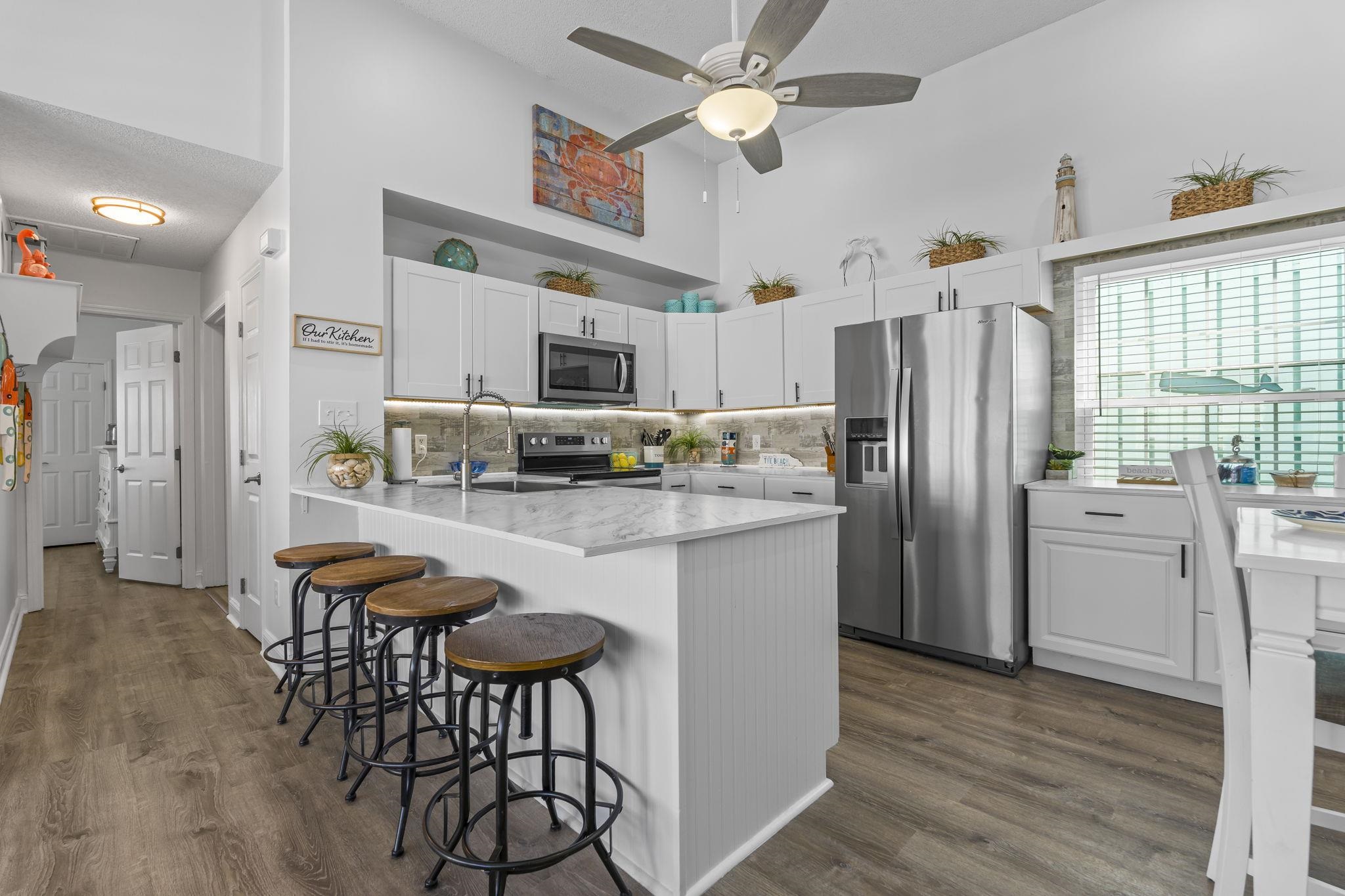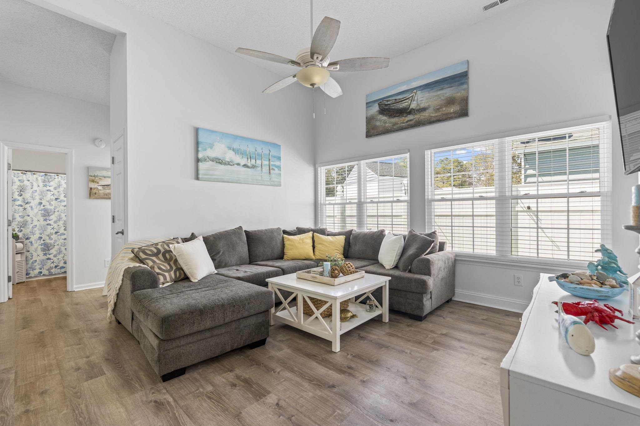 Location, Location, Location! Welcome home to this beautifully remodeled 2-bedroom, 2-bath patio home with a 1-car garage, perfectly situated in the heart of North Myrtle Beach. Thoughtfully updated from top to bottom, this home blends modern style, comfort, and coastal convenience. Step inside to a bright and spacious living room featuring vaulted ceilings that create an open, airy feel, complemented by LVP flooring throughout. The living area flows seamlessly into the updated kitchen, complete with stainless steel appliances, crisp white cabinetry, and ample counter space, ideal for both everyday living and entertaining. Just off the dining area, a custom coffee bar adds a stylish and functional touch. The primary suite offers generous space and a large closet, with a charming barn-door entry leading into the remodeled ensuite bath for added privacy and contemporary appeal. The guest bedroom is equally spacious and provides easy access to the guest bathroom, making it perfect for visitors. In addition to the main living areas, this home features both a comfortable sitting area and a versatile flex space that can be used as a third bedroom, home office, or hobby room. A loft with ladder access provides additional storage. Step outside to your private back patio, the perfect outdoor retreat for relaxing after a day at the beach or enjoying a quiet moment. The 1-car garage offers convenient parking or space for your golf cart, making it easy to explore the neighborhood. Located just minutes from Main Street, you will enjoy quick access to local dining, shopping, and nightlife, along with easy golf cart rides to the beach and nearby grocery stores. With convenient access to Highway 17 Business, this home is close to schools, shopping centers, and all the attractions the area has to offer. This move-in-ready home offers the perfect balance of modern updates and coastal charm in an unbeatable location. Do not miss your opportunity to make it yours. Schedule your showing today. Measurements are not guaranteed; buyer is responsible for verification.