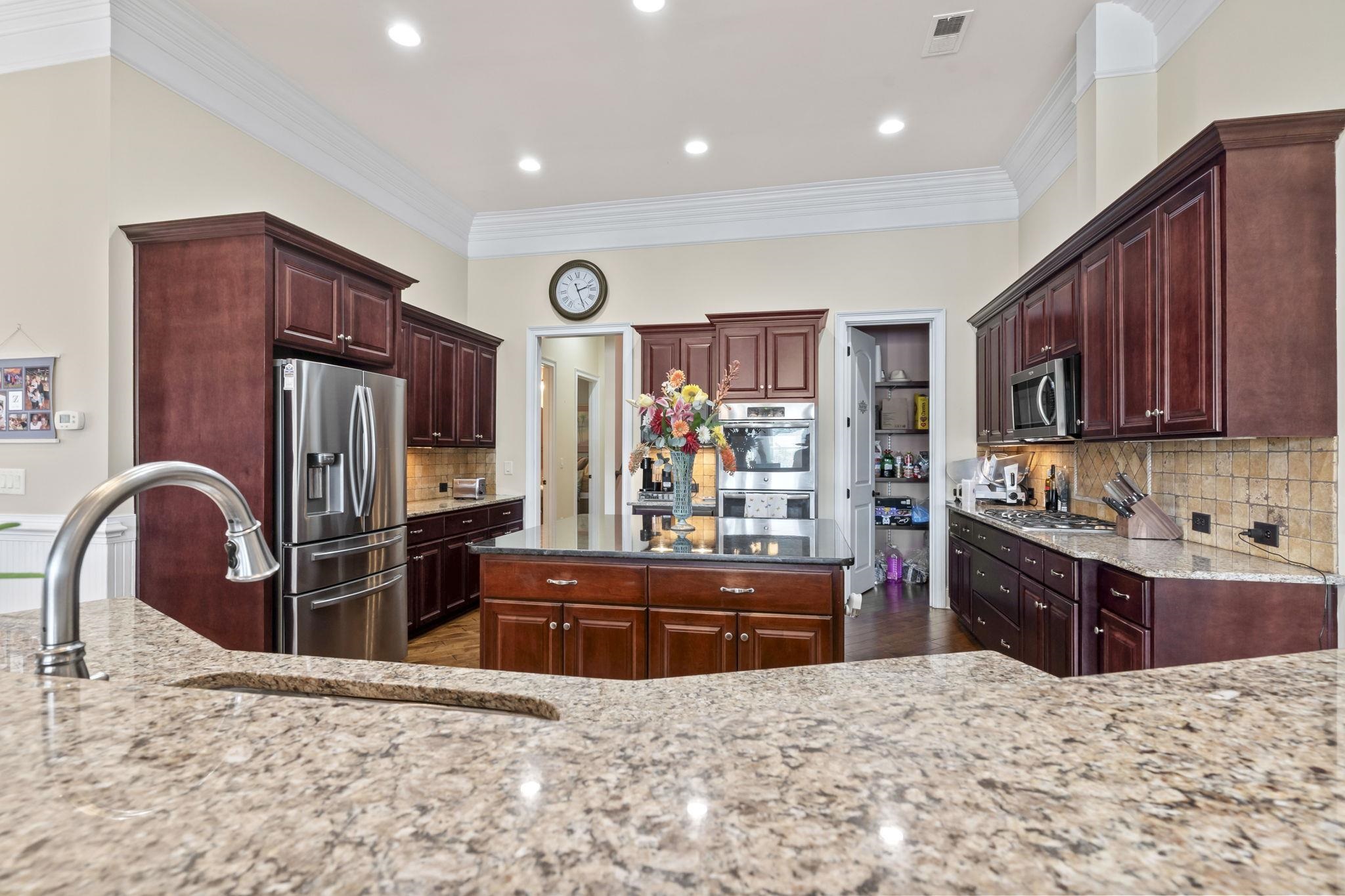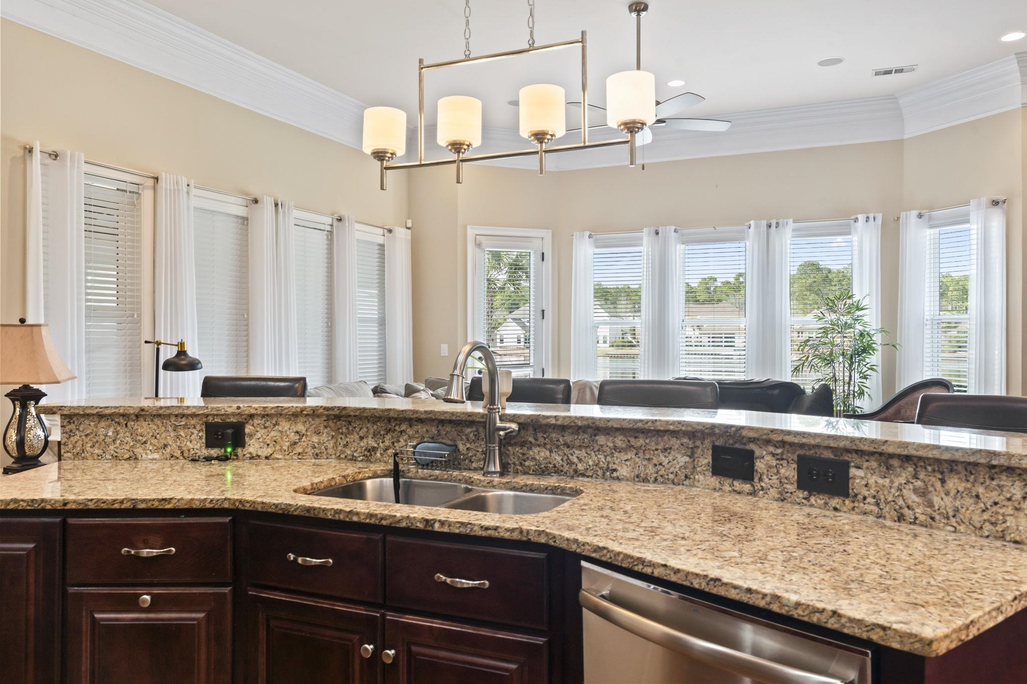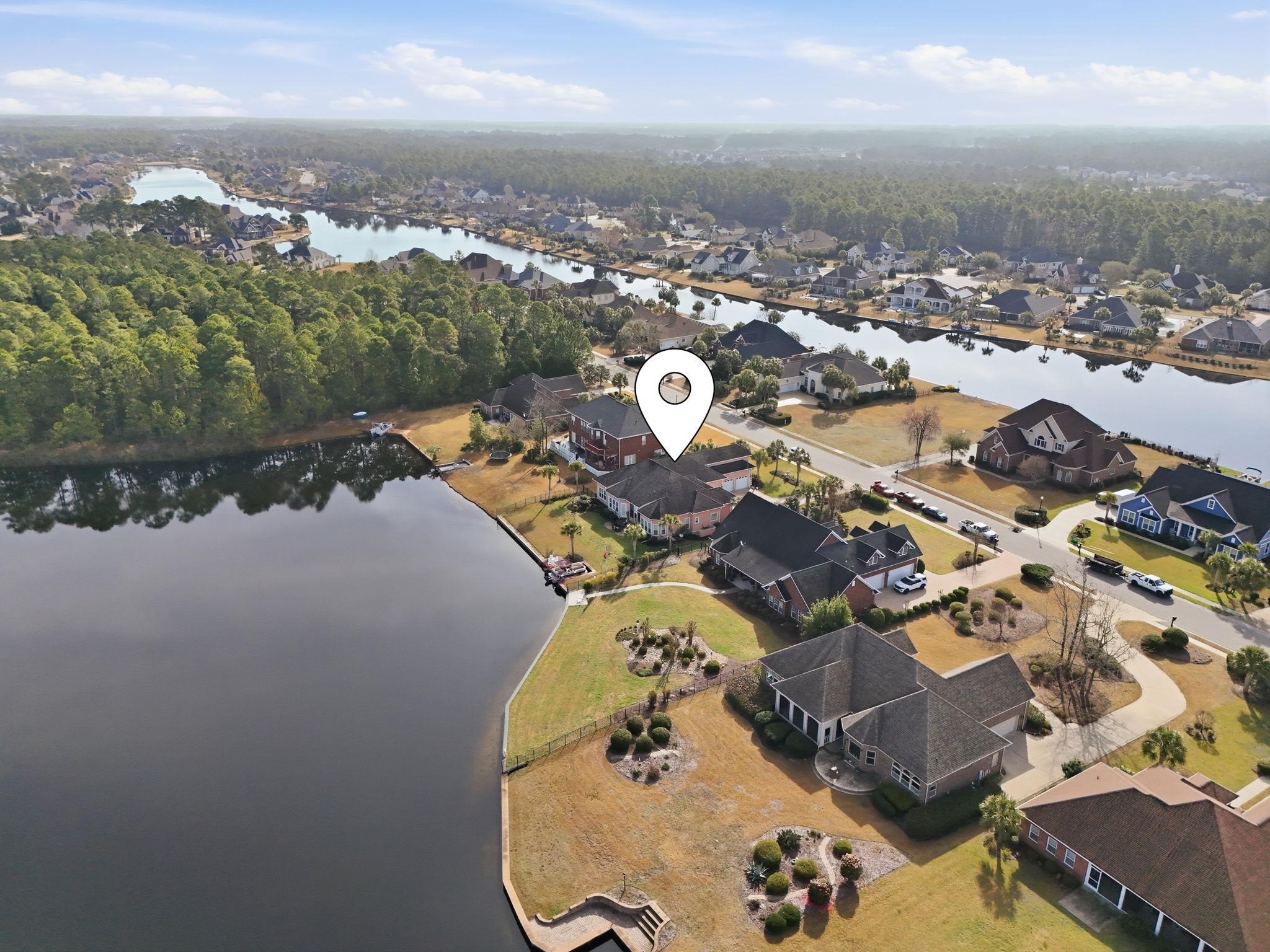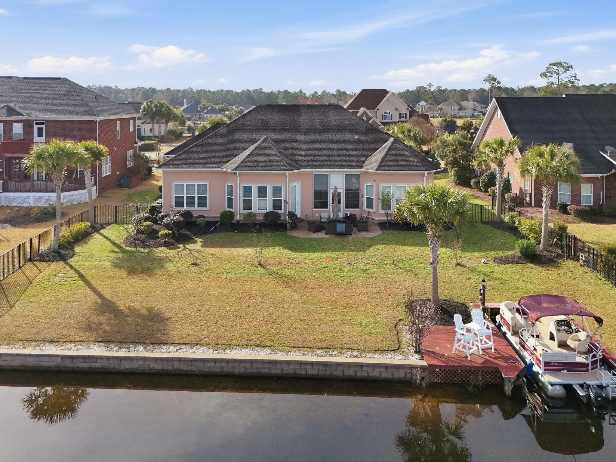 Lakefront Mediterranean-style 4BR/3.5BA home with amazing lake views. This bright, open floor plan is loaded with upgrades, including a custom kitchen cabinets with granite countertops, stainless steel appliances, a large work island and beautiful separate eating area. Enormous primary bedroom, with vaulted, trey ceilings, huge walk-in closet and lusurious tiled shower. Spacious secondary bedrooms and a large, versatile bonus room for a variety of uses. Includes a boat slip, so you can dock your pontoon boat in your backyard and boat the 15 miles of shoreline or cruise to the amenities center to enjoy the fitness center, pools, lighted tennis courts, and basketball courts. Yes, the Ocean is just minutes away, plus shopping, restaurants, and all that Myrtle Beach has to offer. All measurements are approximate.