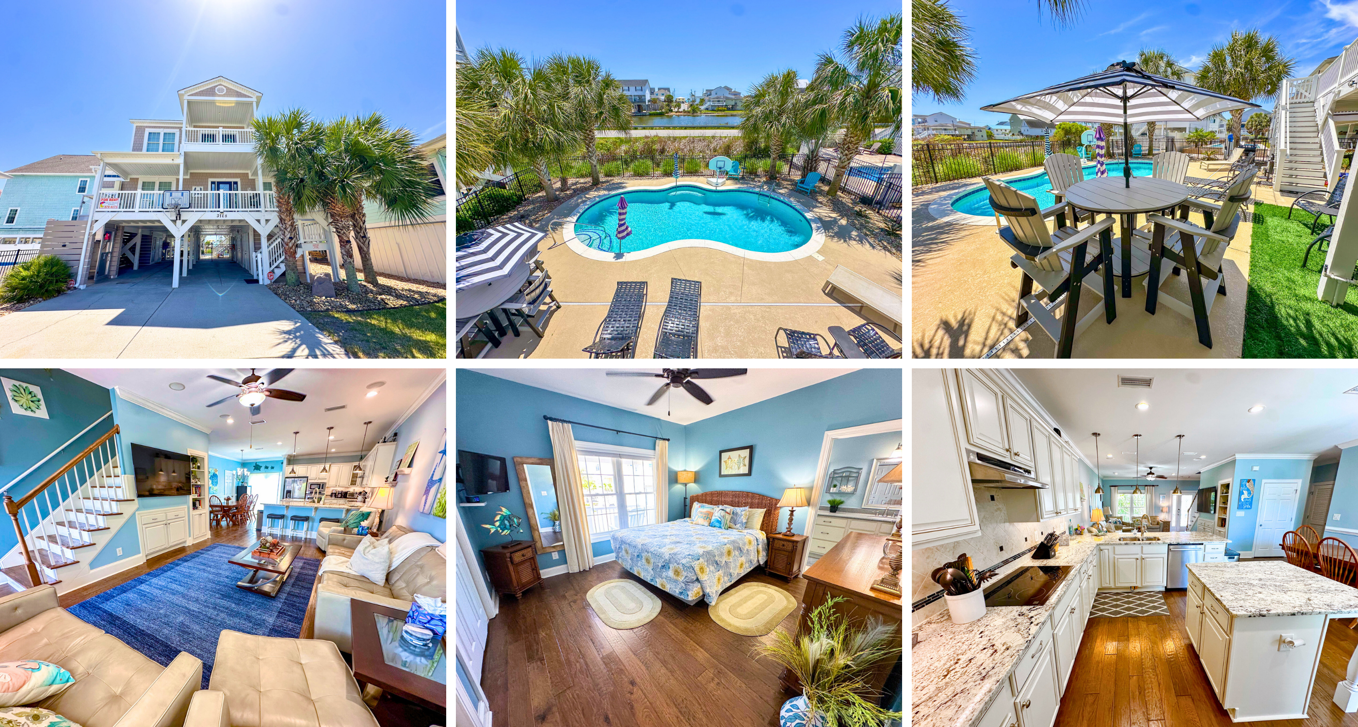 Stunning 4,400 sq ft beach house in Cherry Grove with marsh and ocean views, a private saltwater pool, and spacious 4-bedroom, 4-bath layout. Ideal for families and groups up to 16, Whispering Palms offers luxury, comfort, and coastal charm just a 3-minute walk to the beach.